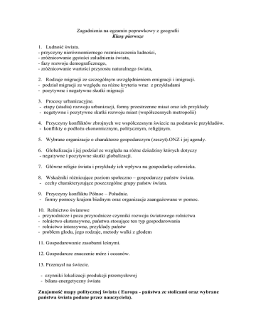Zagadnienia na egzamin poprawkowy z geografii Klasy pierwsze 1. Ludność świata. - przyczyny nierównomiernego rozmieszczenia ludności, - zróżnicowanie gęstości zaludnienia świata, - fazy rozwoju demograficznego, - zróżnicowanie wartości przyrostu naturalnego świata, 2. Rodzaje migracji ze szczególnym uwzględnieniem emigracji i imigracji. - podział migracji ze względu na różne kryteria wraz z przykładami - pozytywne i negatywne skutki migracji 3. Procesy urbanizacyjne. - etapy (stadia) rozwoju urbanizacji, formy przestrzenne miast oraz ich przykłady - negatywne i pozytywne skutki rozwoju miast (współczesnych metropolii) 4. Przyczyny konfliktów zbrojnych we współczesnym świecie na podstawie przykładów. - konflikty o podłożu ekonomicznym, politycznym, religijnym. 5. Wybrane organizacje o charakterze gospodarczym (zeszyt).ONZ i jej agendy. 6. Globalizacja i jej podział ze względu na różne dziedziny których dotyczy - negatywne i pozytywne skutki globalizacji. 7. Główne religie świata i przykłady ich wpływu na gospodarkę człowieka. 8. Wskaźniki różnicujące poziom społeczno – gospodarczy państw świata. - cechy charakteryzujące poszczególne grupy państw świata. 9. Przyczyny konfliktu Północ – Południe. - formy pomocy krajom biednym oraz organizacje zaangażowane w pomoc. 10. Rolnictwo światowe - przyrodnicze i poza przyrodnicze czynniki rozwoju światowego rolnictwa - rolnictwo ekstensywne, państwa stosujące ten typ gospodarowania - rolnictwo intensywne, przykłady państw - problem głodu, jego rodzaje, metody walki z głodem 11. Gospodarowanie zasobami leśnymi. 12. Gospodarcze znaczenie mórz i oceanów. 13. Przemysł na świecie. - czynniki lokalizacji produkcji przemysłowej - bilans energetyczny świata Znajomość mapy politycznej świata ( Europa - państwa ze stolicami oraz wybrane państwa świata podane przez nauczyciela).