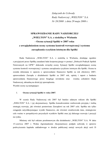 Załącznik do Uchwały Rady Nadzorczej „WIELTON” S.A. Nr 28/2008 z dnia 29 maja 2008 r. SPRAWOZDANIE RADY NADZORCZEJ „WIELTON” S.A. z siedzibą w Wieluniu - Ocena sytuacji Spółki w 2007 roku z uwzględnieniem oceny systemu kontroli wewnętrznej i systemu zarządzania ryzykiem istotnym dla Spółki Rada Nadzorcza „WIELTON” S.A. z siedzibą w Wieluniu, działając zgodnie z przyjętymi przez Spółkę zasadami ładu korporacyjnego w postaci „Dobrych Praktyk Spółek Notowanych na GPW” dokonała zwięzłej oceny Sytuacji Spółki uwzględniającej ocenę systemu kontroli wewnętrznej i systemu zarządzania ryzykiem istotnym dla Spółki. Ocena ta została dokonana w oparciu o sprawozdanie finansowe Spółki za rok obrotowy 2007, sprawozdanie Zarządu z działalności Spółki za 2007 rok, opinię i raport z badania sprawozdania finansowego przez biegłego rewidenta oraz wiedzę członków Rady Nadzorczej, aktualną na dzień jej sporządzenia. Wyniki oceny są następujące: I. Ocena sytuacji Spółki w roku 2007. W ocenie Rady Nadzorczej rok 2007 był bardzo udanym rokiem dla Spółki „WIELTON” S.A. i jej akcjonariuszy. Spółka konsekwentnie realizowała przyjętą i trafną strategię rozwoju, jak równieŜ postawione Zarządowi na rok 2007 cele. Spółka nie tylko osiągnęła satysfakcjonujące wyniki finansowe, ale równieŜ zrealizowała inne, strategiczne cele waŜne w perspektywie przyszłych wyników Spółki oraz jej dalszego rozwoju i pozycji na rynku. Miniony rok był rokiem przełomowym dla działalności „WIELTON” S.A. W dniu 15 czerwca 2007 r. Walne Zgromadzenie Akcjonariuszy podjęło uchwałę w sprawie podwyŜszenia kapitału zakładowego w drodze publicznej emisji nowych akcji serii D 1 z wyłączeniem prawa poboru dotychczasowych akcjonariuszy oraz w sprawie dematerializacji i ubiegania się o dopuszczenie do obrotu na rynku regulowanym akcji serii D oraz praw do akcji serii D. Kilkumiesięczne prace nad upublicznieniem Spółki zostały uwieńczone sukcesem w dniu 28 listopada 2007 r., kiedy to prawa do akcji „WIELTON” S.A. zadebiutowały na rynku podstawowym. W wyniku publicznej subskrypcji akcji serii D Spółka pozyskała łącznie 67.073.963,85 zł. Środki te zgodnie z celami emisji zapisanymi w prospekcie emisyjnym zostaną przeznaczone w szczególności na: 1) rozbudowę mocy produkcyjnych (m.in. budowę hali lakierni i śrutowni i ich wyposaŜenie, budowę hali przygotowania produkcji i jej umaszynowienie), 2) rozbudowę zaplecza magazynowego, 3) powiększenie placu wystawowego dla wyrobów gotowych w Widoradzu/Urbanicach, 4) zakup i wdroŜenie nowego systemu informatycznego (klasy ERP) wspomagającego zarządzanie, głównie w zakresie gospodarki magazynowej i logistyki dostaw oraz zwiększenia efektywności procesów produkcyjnych, 5) zakup 10 ciągników siodłowych, 6) nabycie pakietu większościowego w innym podmiocie lub budowę kolejnego zakładu produkcji lub montaŜu naczep i przyczep. W ocenie Rady Nadzorczej debiut Spółki na Giełdzie Papierów Wartościowych w Warszawie wzmocnił jej wiarygodność i pozycję na rynku, a Spółka uzyskała nowe moŜliwości pozyskiwania kapitału od szerokiego grona inwestorów na realizację przedsięwzięć inwestycyjnych. W ocenie Rady Nadzorczej cała procedura związana z pozyskaniem kapitału z publicznej oferty akcji została przeprowadzona przez Zarząd „WIELTON” S.A. bez zastrzeŜeń. RównieŜ przyjęty przez Zarząd sposób wykorzystania uzyskanych środków jest prawidłowy. Rok 2007 był równieŜ kolejnym okresem rozwoju podstawowej działalności Spółki. Spółka zanotowała dynamiczny wzrost sprzedaŜy produktów - o 36,8% w stosunku do roku poprzedniego. Przychody ze sprzedaŜy produktów wzrosły z poziomu 278 mln zł w 2006 r. do poziomu 386 mln zł w 2007 r. Wzrostowi sprzedaŜy produktów na rynku krajowym towarzyszył równieŜ wzrost sprzedaŜy eksportowej z poziomu 93mln zł w 2006 r. do poziomu 140 mln zł w 2007 r. Zysk netto w 2007 r. wyniósł 44,8 mln zł i był wyŜszy o ponad 430% od zysku netto w roku 2006 r., kiedy wyniósł 8,4 mln zł. Ze względu na rosnącą skalę działalności konieczne było zwiększenie mocy produkcyjnych. Spółka rozbudowała swoją infrastrukturę produkcyjną o kolejne nowoczesne 2 maszyny i urządzenia, dzięki którym moŜliwe było zwiększenie mocy i zmniejszenie kosztów produkcji przy jednoczesnym zachowaniu wysokiej jakości produktów. Spółka poddała równieŜ modernizacji i rozbudowie istniejące zakłady, w szczególności wydział przygotowania i produkcji ram, lakierni i montaŜu oraz plac wystawowy dla wyrobów gotowych. Bardzo waŜny dla rozwoju Spółki jest równieŜ fakt, iŜ od dnia 27 grudnia 2007 r. inwestycje prowadzone przez Spółkę są realizowane na terenach Specjalnej Łódzkiej Strefy Ekonomicznej, co pozwoli Spółce na korzystanie w przyszłości ze znacznej ulgi podatkowej. Reasumując: Dokonując ogólnej oceny sytuacji Spółki Rada Nadzorcza stwierdza, iŜ „WIELTON” S.A. umocniła w roku 2007 swoją silną pozycję jako znaczącego dostawcy przyczep i naczep, co potwierdzają osiągnięte przez nią wyniki finansowe. Spółka jest obecnie największym producentem przyczep i naczep w Polsce oraz jednym z 10 wiodących producentów przyczep i naczep w Europie. Mając powyŜsze na uwadze, Rada Nadzorcza pozytywnie ocenia działalność operacyjną i wyniki Spółki w roku 2007. II. Ocena systemu kontroli wewnętrznej i systemu zarządzania ryzykiem istotnym dla Spółki. Spółka wdroŜyła i ciągle rozwija system kontroli wewnętrznej, który obejmuje zarówno proces sporządzania sprawozdań finansowych, jak i inne obszary działalności Spółki, w których istnieje potrzeba ustanowienia mechanizmów kontrolnych słuŜących monitorowaniu i ograniczaniu ryzyk istotnych dla Spółki. Za skuteczność systemu kontroli wewnętrznej odpowiedzialny jest Zarząd Spółki. System 