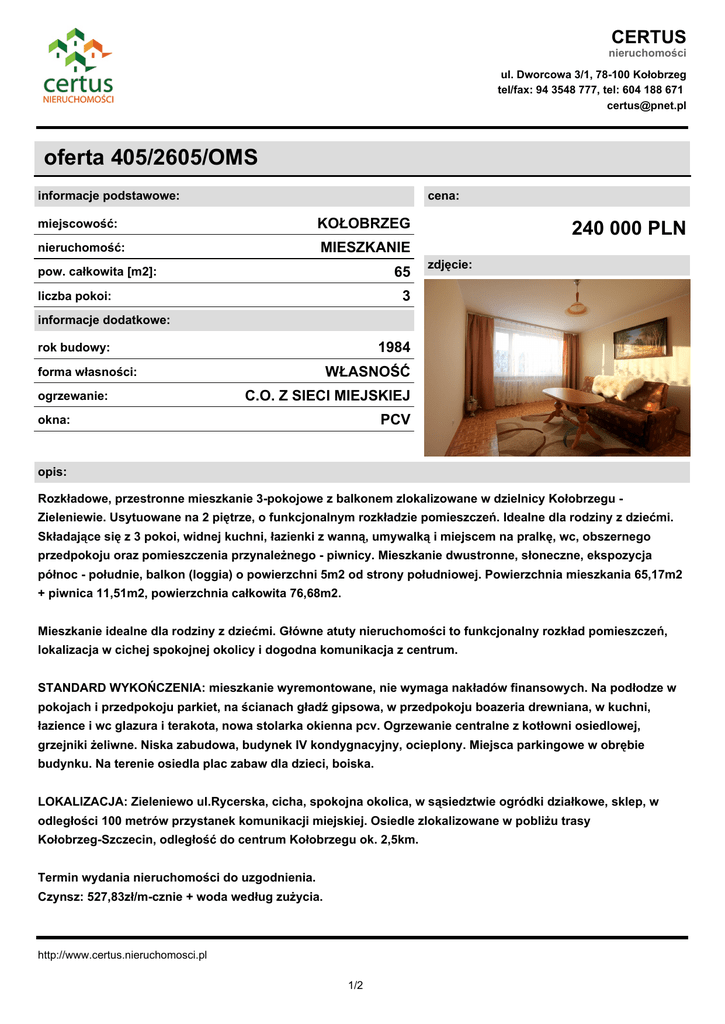 CERTUS nieruchomości ul. Dworcowa 3/1, 78-100 Kołobrzeg tel/fax: 94 3548 777, tel: 604 188 671 [email protected] oferta 405/2605/OMS informacje podstawowe: cena: miejscowość: KOŁOBRZEG nieruchomość: MIESZKANIE 65 pow. całkowita [m2]: 240 000 PLN zdjęcie: 3 liczba pokoi: informacje dodatkowe: 1984 rok budowy: WŁASNOŚĆ forma własności: ogrzewanie: C.O. Z SIECI MIEJSKIEJ PCV okna: opis: Rozkładowe, przestronne mieszkanie 3-pokojowe z balkonem zlokalizowane w dzielnicy Kołobrzegu Zieleniewie. Usytuowane na 2 piętrze, o funkcjonalnym rozkładzie pomieszczeń. Idealne dla rodziny z dziećmi. Składające się z 3 pokoi, widnej kuchni, łazienki z wanną, umywalką i miejscem na pralkę, wc, obszernego przedpokoju oraz pomieszczenia przynależnego - piwnicy. Mieszkanie dwustronne, słoneczne, ekspozycja północ - południe, balkon (loggia) o powierzchni 5m2 od strony południowej. Powierzchnia mieszkania 65,17m2 + piwnica 11,51m2, powierzchnia całkowita 76,68m2. Mieszkanie idealne dla rodziny z dziećmi. Główne atuty nieruchomości to funkcjonalny rozkład pomieszczeń, lokalizacja w cichej spokojnej okolicy i dogodna komunikacja z centrum. STANDARD WYKOŃCZENIA: mieszkanie wyremontowane, nie wymaga nakładów finansowych. Na podłodze w pokojach i przedpokoju parkiet, na ścianach gładź gipsowa, w przedpokoju boazeria drewniana, w kuchni, łazience i wc glazura i terakota, nowa stolarka okienna pcv. Ogrzewanie centralne z kotłowni osiedlowej, grzejniki żeliwne. Niska zabudowa, budynek IV kondygnacyjny, ocieplony. Miejsca parkingowe w obrębie budynku. Na terenie osiedla plac zabaw dla dzieci, boiska. LOKALIZACJA: Zieleniewo ul.Rycerska, cicha, spokojna okolica, w sąsiedztwie ogródki działkowe, sklep, w odległości 100 metrów przystanek komunikacji miejskiej. Osiedle zlokalizowane w pobliżu trasy Kołobrzeg-Szczecin, odległość do centrum Kołobrzegu ok. 2,5km. Termin wydania nieruchomości do uzgodnienia. Czynsz: 527,83zł/m-cznie + woda według zużycia. http://www.certus.nieruchomosci.pl 1/2 CERTUS nieruchomości ul. Dworcowa 3/1, 78-100 Kołobrzeg tel/fax: 94 3548 777, tel: 604 188 671 [email protected] W CENIE: umeblowanie i wyposażenie W celu uzyskania szczegółowych informacji o ofercie prosimy o kontakt telefoniczny, bądź mailowy http://www.certus.nieruchomosci.pl 2/2