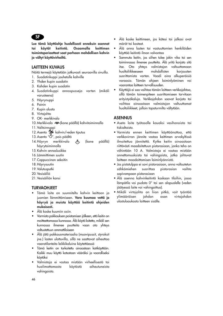 SF Lue tämä käyttöohje huolellisesti ennekuin asennat tai käytät keitintä. Osaamalla keittimen toimintaperiaatteet saat parhaan mahdollisen kahvin ja vältyt käyttövirheiltä. LAITTEEN KUVAUS Näitä termejä käytetään jatkuvasti seuraavilla sivuilla. 1. Suodatinkuppi jauhetulle kahville 2. Yhden kupin suodatin 3. Kahden kupin suodatin 4. Suodatinkuppi annospusseja varten (mikäli varusteena) 5. Höyrynuppi 6. Painin 7. Kupin alusta 8. Virtajohto 9. OK- merkkivalo 10. Merkkivalo (kone päällä) kahvitoiminnolla 11. Valitsinnuppi 12. Asento kahvin/veden tiputus 13. Asento “O”, pois päältä 14. Höyryn merkkivalo (kone päällä) höyrytoiminnolla 15. Kahvin annoslusikka 16. Lämmittimen suutin 17. Cappuccinon sekoitin 18. Höyrysuutin 19. Valutusputki 20. Vesisäiliö 21. Vesisäiliön kansi TURVAOHJEET • Tämä laite on suunniteltu kahvin keittoon ja juomien lämmittämiseen. Varo kuumaa vettä ja höyryä ja muista käyttää keitintä ohjeiden mukaisesti. • Älä koske kuumiin osiin. • Varmista pakkauksen poistamisen jälkeen, että keitin on moitteettomassa kunnossa. Älä käytä laitetta, mikäli sen kunnossa ilmenee puutteita vaan ota yhteys valtuutettuun ammattilaiseen • Älä jätä pakkausmateriaalia (muovipussit, styroksit jne.) lasten ulottuvilla, sillä ne saattavat aiheuttaa vaaratilanteita leikkikaluina käytettäessä • Tämä keitin on tarkoitettu ainoastaan kotikäyttöön. Kaikki muu käyttö katsotaan vääräksi ja vaaralliseksi käytöksi • Valmistaja ei vastaa mistään virheellisestä tai huolimattomasta käytöstä aiheutuneista vahingoista. 46 • Älä koske keittimeen, jos kätesi tai jalkasi ovat märät tai kosteat. • Älä anna lasten tai vastuuttomien henkilöiden käyttää keitintä ilman valvontaa • Sammuta keitin, jos siihen tulee jokin vika tai sen toiminnassa ilmenee puutteita. Älä yritä korjata sitä itse. Ota yhteys valmistajan valtuuttamaan huoltoliikkeeseen mahdollisten korjausten suorittamista varten. Vaadi aina alkuperäisiä varaosia. Tämän ohjeen laiminlyöminen voi vaarantaa laitteen turvallisuuden. • Käyttäjä ei saa vaihtaa tämän laitteen verkkojohtoa, sillä tämän toimenpiteen suorittamiseen tarvitaan erityistyökaluja. Verkkojohdon saavat korjata tai vaihtaa ainoastaan valmistajan valtuuttamat huoltoliikkeet, jolloin tapaturmilta vältytään. ASENNUS • Aseta laite työtasolle kauaksi vesihanoista tai tiskialtaista. • Varmista ennen keittimen käyttöönottoa, että verkkovirran jännite vastaa keittimen arvokyltissä ilmoitettua jännitettä. Kytke keitin ainoastaan riittävästi maadoitettuun pistorasiaan, jonka teho on vähintään 10 A. Valmistaja ei vastaa mistään onnettomuuksista tai vahingoista, jotka johtuvat laitteen maadoittamisen laiminlyönnistä. • Jos pistotulppa ei sovi pistorasiaan, anna valtuutetun sähkömiehen suorittaa pistorasian vaihto sopivampaan pistorasiaan • Älä asenna kahvinkeitintä koskaan tiloihin, jossa lämpötila voi pudota 0° tai sen alapuolelle (veden jäätyessä laite voi vahingoittua). • Mikäli virtajohto on liian pitkä, voit työntää ylimääräisen johdon osan virtajohdon ulostuloaukosta laitteen sisälle. ESPRESSO- KAHVINKEITTIMEN KÄYTTÖ VESISÄILIÖN TÄYTTÄMINEN Poista vesisäiliön kansi (kuva 1) ja poista säiliö tämän jälkeen vetämällä sitä ylöspäin (kuva 2). Täytä säiliö puhtaalla ja raikkaalla vedellä. Varmista, ettet ylitä kirjoitusta MAX. (kuva 3). Pane säiliö takaisin työntämällä sitä kevyesti siten, että säiliön pohjalla oleva venttiili aukeaa. Voit täyttää säiliön myös helpommin ilman että vedät sen ulos, jolloin voit kaataa veden säiliöön suoraan kannusta. HUOM: Älä käytä laitetta koskaan silloin, kun säiliössä ei ole vettä ja muista täyttää taso aina silloin kun se saavuttaa pari senttimetriä pohjasta. KAHVINKEITINYKSIKÖN ESILÄMMITYS Oikean lämpöisen espresso- kahvin edellytyksenä on että kahvinkeitin lämmitetään ensin. Suorita tämä asettamalla valitsinnuppi asentoon (kuva 4) vähintään puoli tuntia ennen kahvin valmistusta. Muista jättää suodatinkuppi kahvinkeittimeen kiinni (varmista, että höyrynuppi on kiinni). Kiinnitä suodatinkuppi kahvinkeittimeen asettamalla se höyrysuuttimen alapuolelle siten, että kahva osoittaa vasemmalle (katso kuva 5) ja työnnä sitä ylöspäin. Käännä kahvaa samanaikaisesti oikealle. Käännä aina loppuun saakka. Voit keittää kahvin puolen tunnin kuluttua seuraamalla seuraavassa kappaleessa annettuja ohjeita. Voit esilämmittää kahvinkeittimen myös nopeammin seuraavalla tavalla: 1.Pane kahvinkeitin päälle asettamalla valitsinnuppi asentoon (kuva 4). Kiinnitä suodatinkuppi koneeseen, mutta älä täytä sitä vielä kahvilla. 2.Pane kuppi suuttimen alle. Käytä samaa kuppia, johon aiot keittää kahvin, jolloin se lämpenee. 3.Odota, että “OK” merkkivalo syttyy (kuva 6) ja käännä valitsinnuppi tämän jälkeen asentoon (kuva 7). Anna veden valua ulos, kunnes “OK”merkkivalo sammuu ja pysäytä tippuminen kääntämällä valitsinnuppi asentoon (kuva 4). 4.Tyhjennä kuppi ja odota, että ”OK” merkkivalo syttyy uudelleen ja toista sama toimenpide. ESPRESSO- KAHVIN VALMISTUS JAUHETULLE KAHVILLE OLEVAA SUODATINKUPPIA KÄYTTÄMÄLLÄ 1. 1. Suorita kahvinkeittimen esilämmitys edellisessä kappaleessa kuvatulla tavalla. Mikäli haluat valmistaa 1 kupin espressoa, aseta yhden kupin suodatin (pienempi kahdesta toimitetusta) suodatinkuppiin (kuva 8) ja kaada 1 tasainen mittalusikallinen jauhettua kahvia, noin 7 grammaa (kuva 9). Mikäli haluat puolestaan valmistaa kaksi kuppia espresso- kahvia, käytä kahden kupin suodatinta (suurempi kahdesta toimitetusta) ja kaada siihen kaksi vajaata mittalusikallista kahvia (noin 6+6 grammaa). 2. Levitä jauhettu kahvi tasaisesti ja paina sitä kevyesti painimella (kuva 10). HUOM: Jauhetun kahvin painaminen on erittäin tärkeää parhaan espresso- kahvin keit