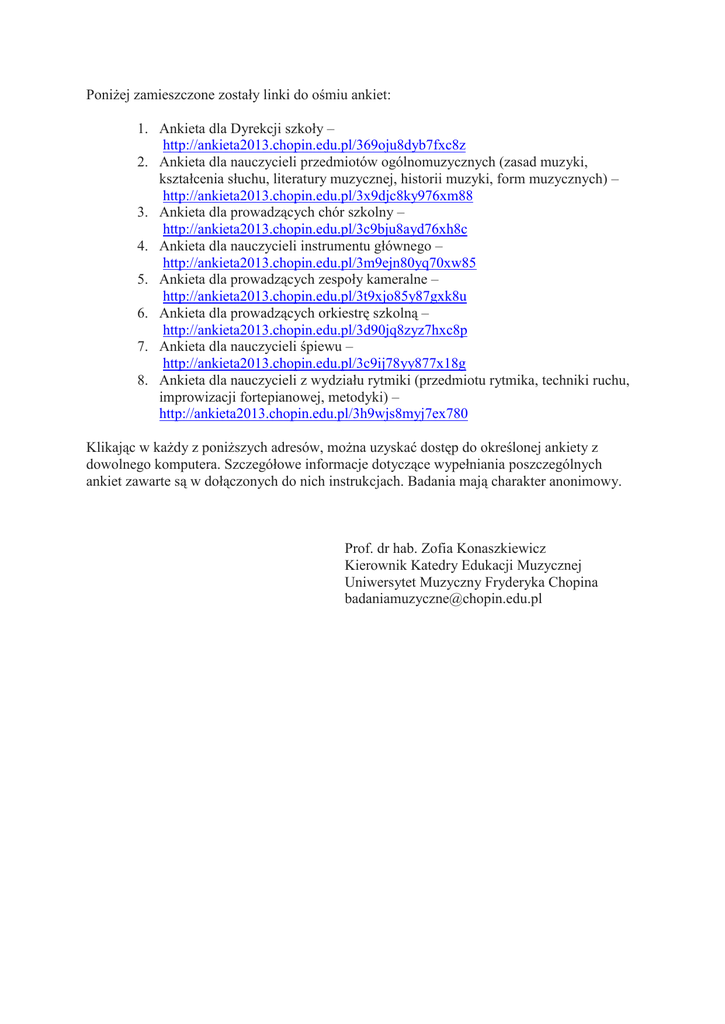 Poniżej zamieszczone zostały linki do ośmiu ankiet: 1. Ankieta dla Dyrekcji szkoły – http://ankieta2013.chopin.edu.pl/369oju8dyb7fxc8z 2. Ankieta dla nauczycieli przedmiotów ogólnomuzycznych (zasad muzyki, kształcenia słuchu, literatury muzycznej, historii muzyki, form muzycznych) – http://ankieta2013.chopin.edu.pl/3x9djc8ky976xm88 3. Ankieta dla prowadzących chór szkolny – http://ankieta2013.chopin.edu.pl/3c9bju8ayd76xh8c 4. Ankieta dla nauczycieli instrumentu głównego – http://ankieta2013.chopin.edu.pl/3m9ejn80yq70xw85 5. Ankieta dla prowadzących zespoły kameralne – http://ankieta2013.chopin.edu.pl/3t9xjo85y87gxk8u 6. Ankieta dla prowadzących orkiestrę szkolną – http://ankieta2013.chopin.edu.pl/3d90jq8zyz7hxc8p 7. Ankieta dla nauczycieli śpiewu – http://ankieta2013.chopin.edu.pl/3c9ij78yy877x18g 8. Ankieta dla nauczycieli z wydziału rytmiki (przedmiotu rytmika, techniki ruchu, improwizacji fortepianowej, metodyki) – http://ankieta2013.chopin.edu.pl/3h9wjs8myj7ex780 Klikając w każdy z poniższych adresów, można uzyskać dostęp do określonej ankiety z dowolnego komputera. Szczegółowe informacje dotyczące wypełniania poszczególnych ankiet zawarte są w dołączonych do nich instrukcjach. Badania mają charakter anonimowy. Prof. dr hab. Zofia Konaszkiewicz Kierownik Katedry Edukacji Muzycznej Uniwersytet Muzyczny Fryderyka Chopina [email protected]