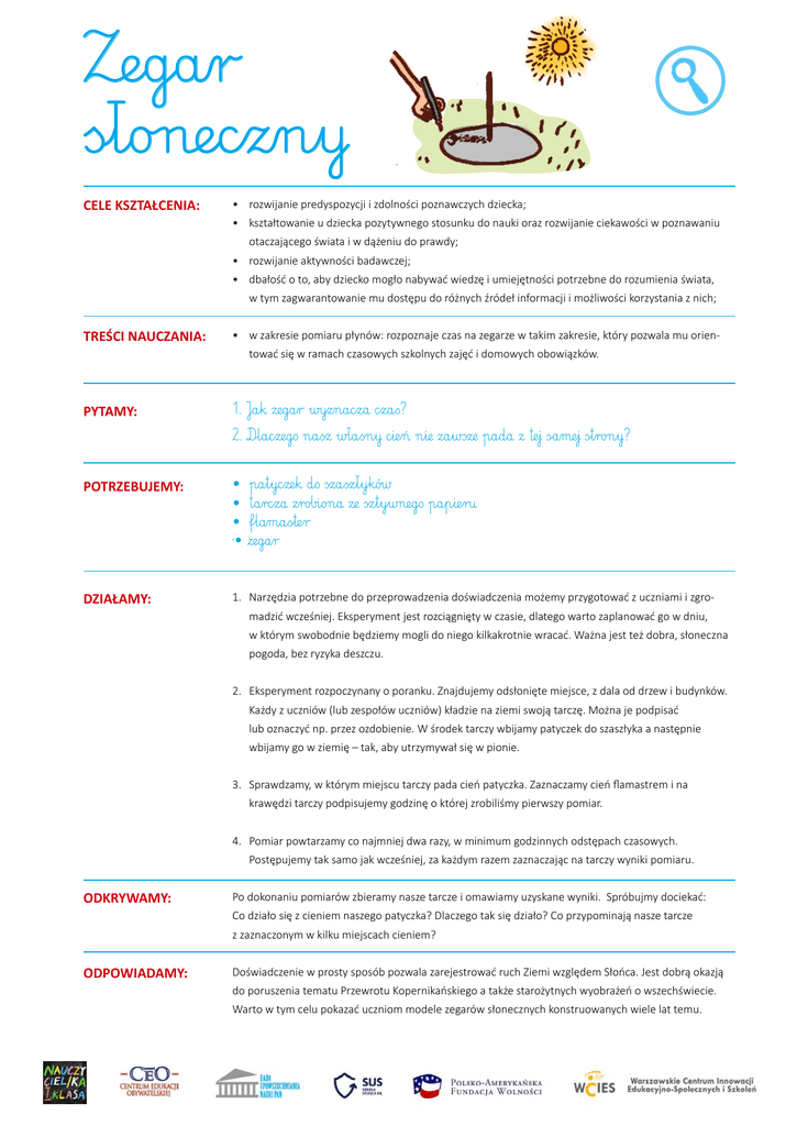 ZşeйgĹaěrЙ ťsпłЭoŢnşeйcŕzěnжyĂ CELE KSZTAŁCENIA: • rozwijanie predyspozycji i zdolności poznawczych dziecka; • kształtowanie u dziecka pozytywnego stosunku do nauki oraz rozwijanie ciekawości w poznawaniu otaczającego świata i w dążeniu do prawdy; • rozwijanie aktywności badawczej; • dbałość o to, aby dziecko mogło nabywać wiedzę i umiejętności potrzebne do rozumienia świata, w tym zagwarantowanie mu dostępu do różnych źródeł informacji i możliwości korzystania z nich; TREŚCI NAUCZANIA: • w zakresie pomiaru płynów: rozpoznaje czas na zegarze w takim zakresie, który pozwala mu orientować się w ramach czasowych szkolnych zajęć i domowych obowiązków. PYTAMY: 1. JĹaжkа đzşeйgĹaěrЙ ЬwЖyиzěnЭaЭcŕzбaа cŕzбačs? 2. DűlЭaЭcŕzşeйgĹo đnЭačsĺzа ЬwЖłЭačsĺnжyĂ cгişeŕńа đnжişeв đzбaжwдsĺzşeв ЬpЭaЭdЭaа đzа †tşeгjĂ ťsсaěmşeгjĂ ťsпtěrЯoŢnжyĂ? POTRZEBUJEMY: • ЬpЭaжtжyĹcŕzşeгkа dЭo ťsĺzбačsĺzжłжyАkбóőwЗ • †tЭaěrЯcŕzбaа đzěrЯoőbЖiЭoŢnЭaа đzşeв ťsĺzжtжyАwňnşeйgĹo ЬpЭaжpжişeŕrЦuа • МfИlЭaěmЭačsпtşeŕrЙ đ• zşeйgĹaěrЙ DZIAŁAMY: 1. Narzędzia potrzebne do przeprowadzenia doświadczenia możemy przygotować z uczniami i zgromadzić wcześniej. Eksperyment jest rozciągnięty w czasie, dlatego warto zaplanować go w dniu, w którym swobodnie będziemy mogli do niego kilkakrotnie wracać. Ważna jest też dobra, słoneczna pogoda, bez ryzyka deszczu. 2. Eksperyment rozpoczynany o poranku. Znajdujemy odsłonięte miejsce, z dala od drzew i budynków. Każdy z uczniów (lub zespołów uczniów) kładzie na ziemi swoją tarczę. Można je podpisać lub oznaczyć np. przez ozdobienie. W środek tarczy wbijamy patyczek do szaszłyka a następnie wbijamy go w ziemię – tak, aby utrzymywał się w pionie. 3. Sprawdzamy, w którym miejscu tarczy pada cień patyczka. Zaznaczamy cień flamastrem i na krawędzi tarczy podpisujemy godzinę o której zrobiliśmy pierwszy pomiar. 4. Pomiar powtarzamy co najmniej dwa razy, w minimum godzinnych odstępach czasowych. Postępujemy tak samo jak wcześniej, za każdym razem zaznaczając na tarczy wyniki pomiaru. ODKRYWAMY: Po dokonaniu pomiarów zbieramy nasze tarcze i omawiamy uzyskane wyniki. Spróbujmy dociekać: Co działo się z cieniem naszego patyczka? Dlaczego tak się działo? Co przypominają nasze tarcze z zaznaczonym w kilku miejscach cieniem? ODPOWIADAMY: Doświadczenie w prosty sposób pozwala zarejestrować ruch Ziemi względem Słońca. Jest dobrą okazją do poruszenia tematu Przewrotu Kopernikańskiego a także starożytnych wyobrażeń o wszechświecie. Warto w tym celu pokazać uczniom modele zegarów słonecznych konstruowanych wiele lat temu.