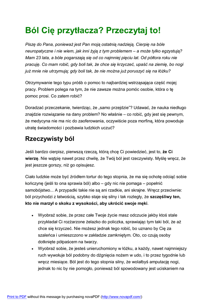 Ból Cię przytłacza? Przeczytaj to! Piszę do Pana, ponieważ jest Pan moją ostatnią nadzieją. Cierpię na bóle neuropatyczne i nie wiem, jak inni żyją z tym problemem – a może tylko egzystują? Mam 23 lata, a bóle pogarszają się od co najmniej pięciu lat. Od półtora roku nie pracuję. Co mam robić, gdy boli tak, że chce się krzyczeć, upaść na ziemię, bo nogi już mnie nie utrzymują; gdy boli tak, że nie można już poruszyć się na łóżku? Otrzymywanie tego typu próśb o pomoc to najbardziej wstrząsająca część mojej pracy. Problem polega na tym, że nie zawsze można pomóc osobie, która o tę pomoc prosi. Co zatem robić? Doradzać przeczekanie, twierdząc, że „samo przejdzie”? Udawać, że nauka niedługo znajdzie rozwiązanie na dany problem? No właśnie – co robić, gdy jest się pewnym, że medycyna nie ma nic do zaoferowania, oczywiście poza morfiną, która powoduje utratę świadomości i pozbawia ludzkich uczuć? Rzeczywisty ból Jeśli bardzo cierpisz, pierwszą rzeczą, którą chcę Ci powiedzieć, jest to, że Ci wierzę. Nie wątpię nawet przez chwilę, że Twój ból jest rzeczywisty. Myślę wręcz, że jest jeszcze gorszy, niż go opisujesz. Ciało ludzkie może być źródłem tortur do tego stopnia, że ma się ochotę odciąć sobie kończynę (jeśli to ona sprawia ból) albo – gdy nic nie pomaga – popełnić samobójstwo... A przypadki takie nie są ani rzadkie, ani skrajne. Wręcz przeciwnie: ból przychodzi z łatwością, szybko staje się silny i tak rozległy, że szczęśliwy ten, kto nie marzył o skoku z wysokości, aby ukrócić swoje męki. Wyobraź sobie, że przez całe Twoje życie masz odczucie jakby ktoś stale przykładał Ci rozżarzone żelazko do policzka, sprawiając tym taki ból, że aż chce się krzyczeć. Nie możesz jednak tego robić, bo uznano by Cię za szaleńca i umieszczono w zakładzie zamkniętym. Oto, co czują osoby dotknięte półpaścem na twarzy. Wyobraź sobie, że jesteś unieruchomiony w łóżku, a każdy, nawet najmniejszy ruch wywołuje ból podobny do dźgnięcia nożem w udo, i to przez tygodnie lub wręcz miesiące. Ból jest do tego stopnia silny, że wolałbyś amputację nogi, jednak to nic by nie pomogło, ponieważ ból spowodowany jest uciskaniem na Print to PDF without this message by purchasing novaPDF (http://www.novapdf.com/) korzenie nerwowe wychodzące z rdzenia kręgowego. Oto, co czują osoby dotknięte problemem rwy kulszowej. Mógłbym podać setki przykładów. Ból innych może przerażać nawet personel medyczny. Najprościej zatem jest go usunąć za pomocą środków pozbawiających pacjenta świadomości (znieczulenie), co jednocześnie pozbawia osobę cierpiącą własnego życia (wolę termin „cierpiącą” od „chorej”, ponieważ ta druga obejmuje wszystkich chorych, również tych, którzy nie czują bólu). Innym, gorszym sposobem jest negowanie bólu, twierdząc, że jest wymyślony, że ma podłoże psychologiczne (lub też psychosomatyczne, bo brzmi to bardziej uczenie), zamieniając osobę cierpiącą w winną, niestabilną bądź egoistyczną, konfabulującą dla zdobycia uwagi. W tym przypadku również próbuje się taką osobę uspokoić za pomocą leków usypiających czy antydepresantów, niby jej pomagając, tak naprawdę w celu pozbycia się związanego z nią problemu. I w tym właśnie miejscu przed osobą cierpiącą otwierają się drzwi do piekła. Ból to niesprawiedliwość Osobiście uważam, że najważniejsze jest, aby otoczenie przyjęło bezdyskusyjny i obiektywny charakter zdarzeń. Wydaje mi się, że najgorszą rzeczą, jaką można zrobić osobie cierpiącej, jest oskarżenie jej o symulanctwo. Mogę porównać ofiary bólu z ofiarami niesprawiedliwości, ponieważ są to dwie podobne sytuacje. Ból jest niesprawiedliwością, a niesprawiedliwość bólem (moralnym, który jednak potrafi być niezwykle silny). Ofiary przestępstw proszą przede wszystkim, aby nie negować tego, co w rzeczywistości im się przydarzyło; aby nie mówić im, że to ich wina; aby nie tłumaczyć ich oprawcy czy znajdować dla niego wymówek. Jeśli zaczniesz umniejszać bądź negować fakty, sprawisz ofierze ból silniejszy od odczuwanego w momencie samego przestępstwa. Wprawisz ją w rozpacz, która może doprowadzić do szaleństwa lub samobójstwa (mówi się dużo o samobójstwach w więzieniach, jednak statystyki wykazują, że zdarzają się one znacznie częściej u Print to PDF without this message by purchasing novaPDF (http://www.novapdf.com/) ofiar napaści, szczególnie gdy wymiar sprawiedliwości nie mógł lub nie chciał sprawiedliwości oddać). Niestety, szukanie „wytłumaczenia” dla przestępstwa to niezwykle powszechna reakcja. Wyjaśnień doszukuje się w zachowaniu i osobowości ofiary, która nie powinna była być taka a taka, zachować się tak a tak, patrzeć na napastnika w taki a taki sposób, znajdować się w danym miejscu, w danym czasie, i która nie powinna przecież dziwić się, że została… pobita, zgwałcona, dźgnięta nożem. Wykonaj na samym sobie ten eksperyment: gdy czytasz w prasie opisy przestępstw, mózg natychmiast poszukuje w szczegółach zdarzenia powodów, dla których podobny dramat nie mógłby Ci się przydarzyć. „Nie mieszkam w tej dzielnicy”. „Nigdy nie chodzę tą drogą”. „Jestem mężczyzną”, gdy ofiara jest kobietą, i odwrotnie. „Jestem dorosły”, kiedy ofiarą jest dziecko. „Moje dzieci nie chodzą do tej szkoły”. „Nigdy nie zdobył(a)bym się na taką nieostrożność…” Wydaje mi się, że istnieje wytłumaczenie takiego zachowania. Aby poczuć się bezpieczniej, człowiek potrzebuje myśleć, że ma pod kontrolą to, co dzieje się w jego życiu. Przekonuje się, że to, co się przydarza, nie jest zaledwie wynikiem zbieżności losu, a skutkiem podjętych wyborów i decyzji. To sprawia, że postrzega on ofiarę jako co najmniej