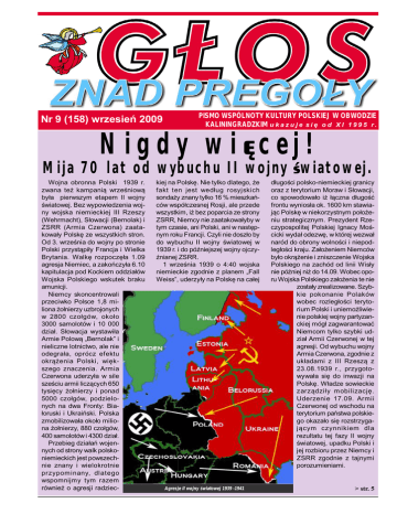 Nr 9 (158) wrzesień 2009 PISMO WSPÓLNOTY KULTURY POLSKIEJ W OBWODZIE KALININGRADZKIM u k a z u j e s i ę o d X I 1 9 9 5 r . Nigdy więcej! Mija 70 lat od wybuchu II wojny światowej. Wojna obronna Polski 1939 r. zwana też kampanią wrześniową była pierwszym etapem II wojny światowej. Bez wypowiedzenia wojny wojska niemieckiej III Rzeszy (Wehrmacht), Słowacji (Bernolak) i ZSRR (Armia Czerwona) zaatakowały Polskę ze wszystkich stron. Od 3. września do wojny po stronie Polski przystąpiły Francja i Wielka Brytania. Walkę rozpoczęła 1.09 agresja Niemiec, a zakończyła 6.10 kapitulacja pod Kockiem oddziałów Wojska Polskiego wskutek braku amunicji. Niemcy skoncentrowali przeciwko Polsce 1,8 miliona żołnierzy uzbrojonych w 2800 czołgów, około 3000 samolotów i 10 000 dział. Słowacja wystawiła Armie Polową „Bernolak” i nieliczne lotnictwo, ale nie odegrała, oprócz efektu okrążenia Polski, większego znaczenia. Armia Czerwona uderzyła w sile sześciu armii liczących 650 tysięcy żołnierzy i ponad 5000 czołgów, podzielonych na dwa Fronty: Białoruski i Ukraiński. Polska zmobilizowała około miliona żołnierzy, 880 czołgów, 400 samolotów i 4300 dział. Przebieg działań wojennych od strony walk polskoniemieckich jest powszechnie znany i wielokrotnie przypominany, dlatego wspomnijmy tym razem również o agresji radziec- kiej na Polskę. Nie tylko dlatego, że fakt ten jest według rosyjskich sondaży znany tylko 16 % mieszkańców współczesnej Rosji, ale przede wszystkim, iż bez poparcia ze strony ZSRR, Niemcy nie zaatakowałyby w tym czasie, ani Polski, ani w następnym roku Francji. Czyli nie doszło by do wybuchu II wojny światowej w 1939 r. i do późniejszej wojny ojczyźnianej ZSRR. 1 września 1939 o 4:40 wojska niemieckie zgodnie z planem „Fall Weiss”, uderzyły na Polskę na całej Agresje II wojny światowej 1939 -1941 długości polsko-niemieckiej granicy oraz z terytorium Moraw i Słowacji, co spowodowało iż łączna długość frontu wyniosła ok. 1600 km stawiając Polskę w niekorzystnym położeniu strategicznym. Prezydent Rzeczypospolitej Polskiej Ignacy Mościcki wydał odezwę, w której wezwał naród do obrony wolności i niepodległości kraju. Założeniem Niemców było okrążenie i zniszczenie Wojska Polskiego na zachód od linii Wisły nie później niż do 14.09. Wobec oporu Wojska Polskiego założenia te nie zostały zrealizowane. Szybkie pokonanie Polaków wobec rozległości terytorium Polski i uniemożliwienie polskiej wojny partyzanckiej mógł zagwarantować Niemcom tylko szybki udział Armii Czerwonej w tej agresji. Od wybuchu wojny Armia Czerwona, zgodnie z układami z III Rzeszą z 23.08.1939 r., przygotowywała się do inwazji na Polskę. Władze sowieckie zarządziły mobilizację. Uderzenie 17.09. Armii Czerwonej od wschodu na terytorium państwa polskiego okazało się rozstrzygającym czynnikiem dla rezultatu tej fazy II wojny światowej, upadku Polski i jej rozbioru przez Niemcy i ZSRR zgodnie z tajnymi porozumieniami. > str. 5
