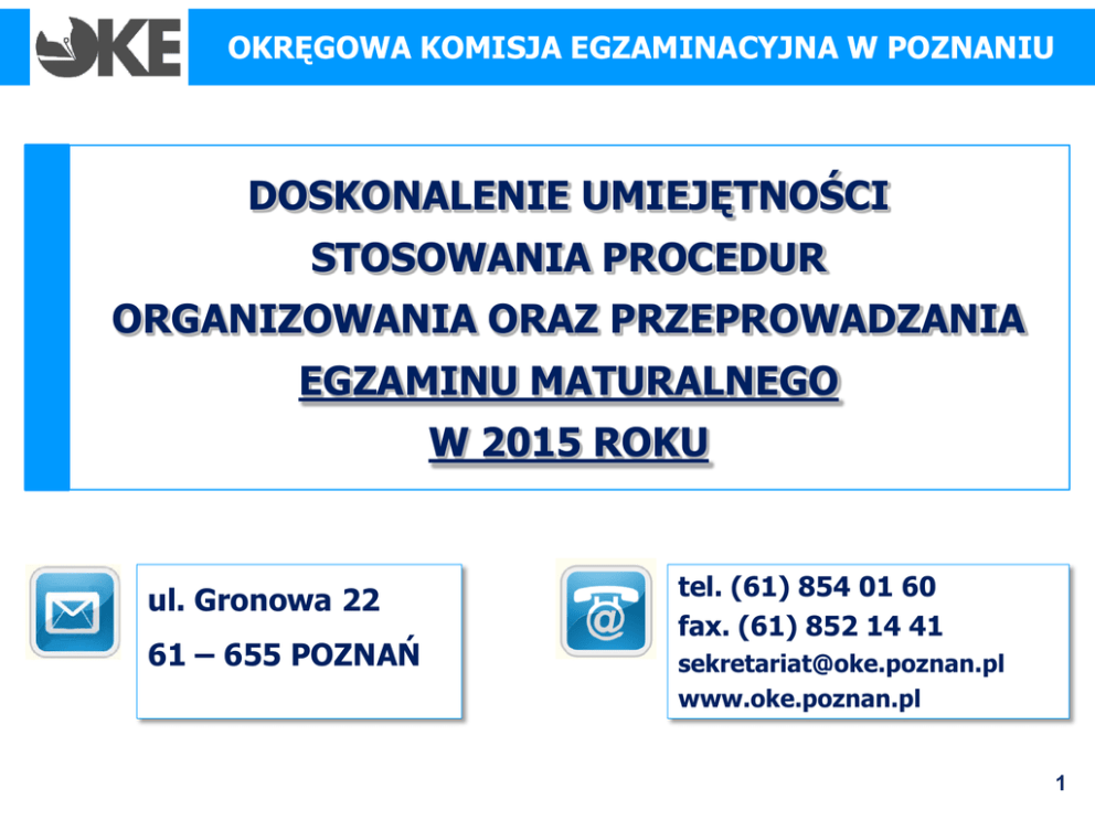 OKRĘGOWA KOMISJA EGZAMINACYJNA W POZNANIU DOSKONALENIE UMIEJĘTNOŚCI STOSOWANIA PROCEDUR ORGANIZOWANIA ORAZ PRZEPROWADZANIA EGZAMINU MATURALNEGO W 2015 ROKU ul. Gronowa 22 61 – 655 POZNAŃ tel. (61) 854 01 60 fax. (61) 852 14 41 [email protected] www.oke.poznan.pl 1 DOSKONALENIE UMIEJĘTNOŚCI STOSOWANIA PROCEDUR ORGANIZOWANIA ORAZ PRZEPROWADZANIA EGZAMINU MATURALNEGO W 2015 ROKU POTWIERDZENIE OBECNOŚCI NA SZKOLENIU 64 ust. 4 Rozporządzenie MEN z dnia 30 kwietnia 2007 r. (DzU z 2007 r. Nr 83, poz. 562 ze zm.) Przewodniczący szkolnego zespołu egzaminacyjnego i jego zastępca powinni odbyć szkolenie w zakresie organizacji egzaminu maturalnego, organizowane przez komisję okręgową. Państwa podpis złożony na rozdanych kartkach jest potwierdzeniem udziału w szkoleniu. 2 DOSKONALENIE UMIEJĘTNOŚCI STOSOWANIA PROCEDUR ORGANIZOWANIA ORAZ PRZEPROWADZANIA EGZAMINU MATURALNEGO W 2015 ROKU MATERIAŁY OBJĘTE ZASADĄ NIEUJAWNIANIA PROCEDURY – ZAŁĄCZNIK L_16 / T_16 Przewodniczący szkolnego zespołu egzaminacyjnego ma obowiązek odebrania od wszystkich osób mających kontakt z materiałami egzaminacyjnymi OŚWIADCZEŃ w sprawie zabezpieczenia materiałów egzaminacyjnych przed nieuprawnionym ujawnieniem i ochrony danych osobowych. 3 DOSKONALENIE UMIEJĘTNOŚCI STOSOWANIA PROCEDUR ORGANIZOWANIA ORAZ PRZEPROWADZANIA EGZAMINU MATURALNEGO W 2015 ROKU PROGRAM SZKOLENIA Prawo obowiązujące w roku szkolnym 2014/2015 Przygotowanie egzaminu maturalnego Przebieg i dokumentacja egzaminów pisemnych Przebieg i dokumentacja egzaminów ustnych Egzaminy w terminie dodatkowym i egzaminy poprawkowe Informacje dodatkowe 4 DOSKONALENIE UMIEJĘTNOŚCI STOSOWANIA PROCEDUR ORGANIZOWANIA ORAZ PRZEPROWADZANIA EGZAMINU MATURALNEGO W 2015 ROKU Prawo obowiązujące w roku szkolnym 2014/2015 WYBRANE AKTY PRAWNE REGULACJE SZCZEGÓŁOWE – KOMUNIKATY, PROCEDURY, INSTRUKCJE 5 DOSKONALENIE UMIEJĘTNOŚCI STOSOWANIA PROCEDUR ORGANIZOWANIA ORAZ PRZEPROWADZANIA EGZAMINU MATURALNEGO W 2015 ROKU Prawo obowiązujące w roku szkolnym 2014/2015 WYBRANE AKTY PRAWNE Przypominamy! Ustawa o systemie oświaty z dnia 7 września 1991 r. (DzU z 2004 r. Nr 256, poz. 2572 ze zmianami) Rozporządzenie MEN z dnia 30 kwietnia 2007 r. w sprawie warunków i sposobu oceniania, klasyfikowania i promowania uczniów i słuchaczy oraz przeprowadzania sprawdzianów i egzaminów w szkołach publicznych (DzU z 2007 r. Nr 83, poz. 562 ze zmianami) szczególnie z dnia 25 kwietnia 2013 roku Rozporządzenia MEN z dnia 17 listopada 2010 r. (DzU Nr 228 ze zmianami) 6 PRAWO OBOWIĄZUJĄCE W ROKU SZKOLNYM 2014/2015 Nowelizacja ustawy o systemie oświaty z 19 sierpnia 2011 r. Przypominamy! Art. 20 pkt. 1. Egzamin maturalny na podstawie standardów wymagań egzaminacyjnych (w starej formule) przeprowadza się: - do roku szkolnego 2013/2014 włącznie dla absolwentów LO, LP oraz TU dla młodzieży - do roku szkolnego 2014/2015 włącznie dla absolwentów T i TU dla dorosłych Art. 20 pkt. 2. Absolwenci, którzy w tych terminach nie przystąpili do egzaminu maturalnego, nie zdali egzaminu albo chcą podwyższyć jego wynik z danego przedmiotu mogą przystąpić do egzaminu maturalnego na podstawie standardów w okresie 2 lat szkolnych 7 PRAWO OBOWIĄZUJĄCE W ROKU SZKOLNYM 2014/2015 EGZAMIN MATURALNY Z JĘZYKA POLSKIEGO Dla absolwentów należy zachować zatwierdzone listy tematów z lat: 2013/2014 – LICEUM 2014/2015 – TECHNIKUM 8 PRAWO OBOWIĄZUJĄCE W ROKU SZKOLNYM 2014/2015 USTNY EGZAMIN MATURALNY Z JĘZYKA POLSKIEGO FORMUŁA DO 2014 R. Procedury LO cz. III C p. 9 i 11 T cz. I.2 C, p. 3, D p. 5 Absolwent, który nie przystępował wcześniej do egzaminu maturalnego w części ustnej z języka polskiego, wskazuje w deklaracji temat wybrany z listy tematów obowiązujących w szkole w ostatnim roku szkolnym (2013/2014). Absolwent, który nie zdał egzaminu maturalnego w części ustnej z języka polskiego lub podwyższa wynik, przystępując ponownie do egzaminu, wskazuje w deklaracji poprzednio wybrany temat prezentacji lub nowy temat wybrany z listy tematów obowiązujących w szkole w ostatnim roku szkolnym (2013/2014). 9 PRAWO OBOWIĄZUJĄCE W ROKU SZKOLNYM 2014/2015 Nowelizacja z dnia 25 kwietnia 2013 r. rozporządzenia w sprawie warunków i sposobu oceniania (…) Przypominamy! 73.1. Egzamin maturalny w części ustnej z języka polskiego […] sprawdza umiejętność tworzenia wypowiedzi na określony temat inspirowanej tekstem kultury 2. Zdający losuje zadanie egzaminacyjne składające się z tekstu kultury oraz odnoszącego się do niego polecenia i ma nie więcej niż 15 minut na przygotowanie odpowiedzi 3. Egzamin trwa około 15 minut i składa się z dwóch części: 1) wypowiedzi monologowej zdającego dotyczącej wylosowanego polecenia, która trwa około 10 minut, 2) rozmowy zdającego z zespołem przedmiotowym, dotyczącej tej wypowiedzi, która trwa około 5 minut; 72. 2. W czasie trwania części ustnej egzaminu maturalnego z języka polskiego […] w sali może przebywać jeden zdający i jeden przygotowujący się do egzaminu 10 PRAWO OBOWIĄZUJĄCE W ROKU SZKOLNYM 2014/2015 Nowelizacja z dnia 25 kwietnia 2013 r. rozporządzenia w sprawie warunków i sposobu oceniania (…) Przypominamy! 1 pkt. 28 lit a) i b) rozporządzenia nowelizującego wprowadza zmiany w zakresie uprawnień laureatów/finalistów olimpiad przedmiotowych: 1. Ze zwolnienia mogą skorzystać zdający, jeżeli tytuł laureata/finalisty uzyskali jako uczniowie szkoły ponadgimnazjalnej (znowelizowany 60 ust. 1 rozporządzenia). 2. W związku z uzyskaniem tytułu laureata/finalisty, na 2 tygodnie przed egzaminem maturalnym, zdający mogą złożyć wniosek o zmianę w deklaracji (dodanie ust. 3a w 60). 11 PRAWO OBOWIĄZUJĄCE W ROKU SZKOLNYM 2014/2015 PROCEDURY – ZAŁĄCZNIK L_20 / T_20 Procedury: LO cz. I D p. 7 str. 11 T cz. I.1 D p. 7 str. 10 Przypominamy! W przypadku, gdy zdający uzyskał tytuł laureata lub finalisty z innego przedmiotu niż wskazany