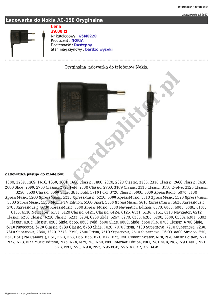 Informacje o produkcie Utworzono 06-03-2017 Ładowarka do Nokia AC-15E Oryginalna Cena : 39,00 zł Nr katalogowy : GSM0220 Producent : NOKIA Dostępność : Dostępny Stan magazynowy : bardzo wysoki w .c Ładowarka pasuje do modelów: ar d sp lit te r .p l Oryginalna ładowarka do telefonów Nokia. w w 1200, 1208, 1209, 1616, 1650, 1661, 1680 Classic, 1800, 2220, 2323 Classic, 2330, 2330 Classic, 2600 Classic, 2630, 2680 Slide, 2690, 2700 Classic, 2720 Fold, 2730 Classic, 2760, 3109 Classic, 3110 Classic, 3110 Evolve, 3120 Classic, 3250, 3500 Classic, 3600 Slide, 3610 Fold, 3710 Fold, 3720 Classic, 5000, 5030 XpressRadio, 5070, 5130 XpressMusic, 5200 XpressMusic, 5220 XpressMusic, 5230, 5300 XpressMusic, 5310 XpressMusic, 5320 XpressMusic, 5330 XpressMusic, 5330 Mobile TV Edition, 5500 Sport, 5530 XpressMusic, 5610 XpressMusic, 5630 XpressMusic, 5700 XpressMusic, 5730 XpressMusic, 5800 Xpress Music, 5800 Navigation Edition, 6070, 6080, 6085, 6086, 6101, 6103, 6110 Navigator, 6111, 6120 Classic, 6121, Classic, 6124, 6125, 6131, 6136, 6151, 6210 Navigator, 6212 Classic, 6216 Classic, 6220 Classic, 6233, 6234, 6260 Slide, 6267, 6270, 6280, 6288, 6290, 6300, 6300i, 6301, 6303 Classic, 6303i Classic, 6500 Slide, 6555, 6600 Fold, 6600 Slide, 6600i Slide, 6650 Flip, 6700 Classic, 6700 Slide, 6710 Navigator, 6720 Classic, 6730 Classic, 6760 Slide, 7020, 7070 Prism, 7100 Supernova, 7210 Supernova, 7230, 7310 Supernova, 7360, 7370, 7373, 7390, 7500 Prism, 7510 Supernova, 7610 Supernova, C6-00, 8800 Sirocco, E50, E51, E51 ( No Camera ), E61, E61i, E63, E65, E66, E71, E72, E75, E90 Communicator, N70, N70 Music Edition, N71, N72, N73, N73 Music Edition, N76, N78, N79, N8, N80, N80 Internet Edition, N81, N81 8GB, N82, N90, N91, N91 8GB, N92, N93, N93i, N95, N95 8GB, N96, X2, X2, X6 16GB Wygenerowano w programie www.oscGold.com