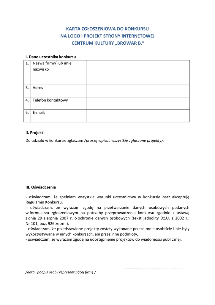 KARTA ZGŁOSZENIOWA DO KONKURSU NA LOGO I PROJEKT STRONY INTERNETOWEJ CENTRUM KULTURY „BROWAR B.” I. Dane uczestnika konkursu 1. Nazwa firmy/ lub imię nazwisko 3. Adres 4. Telefon kontaktowy 5. E-mail: II. Projekt Do udziału w konkursie zgłaszam /proszę wpisać wszystkie zgłaszane projekty/: III. Oświadczenia - oświadczam, że spełniam wszystkie warunki uczestnictwa w konkursie oraz akceptuję Regulamin Konkursu, - oświadczam, że wyrażam zgodę na przetwarzanie danych osobowych podanych w formularzu zgłoszeniowym na potrzeby przeprowadzenia konkursu zgodnie z ustawą z dnia 29 sierpnia 2007 r. o ochronie danych osobowych (tekst jednolity Dz.U. z 2002 r., Nr 101, poz. 926 ze zm.), - oświadczam, że przedstawione projekty zostały wykonane przeze mnie osobiście i nie były wykorzystywane w innych konkursach, ani przez inne podmioty, - oświadczam, że wyrażam zgodę na udostępnienie projektów do wiadomości publicznej. .......................................................... /data i podpis osoby reprezentującej firmę /