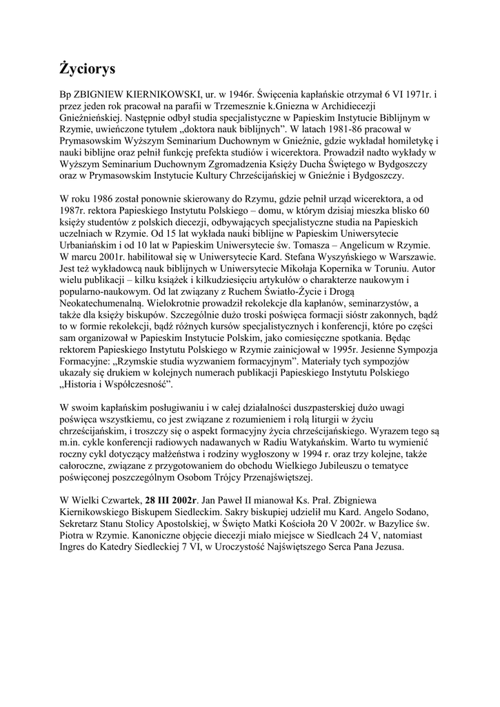 Życiorys Bp ZBIGNIEW KIERNIKOWSKI, ur. w 1946r. Święcenia kapłańskie otrzymał 6 VI 1971r. i przez jeden rok pracował na parafii w Trzemesznie k.Gniezna w Archidiecezji Gnieźnieńskiej. Następnie odbył studia specjalistyczne w Papieskim Instytucie Biblijnym w Rzymie, uwieńczone tytułem „doktora nauk biblijnych”. W latach 1981-86 pracował w Prymasowskim Wyższym Seminarium Duchownym w Gnieźnie, gdzie wykładał homiletykę i nauki biblijne oraz pełnił funkcję prefekta studiów i wicerektora. Prowadził nadto wykłady w Wyższym Seminarium Duchownym Zgromadzenia Księży Ducha Świętego w Bydgoszczy oraz w Prymasowskim Instytucie Kultury Chrześcijańskiej w Gnieźnie i Bydgoszczy. W roku 1986 został ponownie skierowany do Rzymu, gdzie pełnił urząd wicerektora, a od 1987r. rektora Papieskiego Instytutu Polskiego – domu, w którym dzisiaj mieszka blisko 60 księży studentów z polskich diecezji, odbywających specjalistyczne studia na Papieskich uczelniach w Rzymie. Od 15 lat wykłada nauki biblijne w Papieskim Uniwersytecie Urbaniańskim i od 10 lat w Papieskim Uniwersytecie św. Tomasza – Angelicum w Rzymie. W marcu 2001r. habilitował się w Uniwersytecie Kard. Stefana Wyszyńskiego w Warszawie. Jest też wykładowcą nauk biblijnych w Uniwersytecie Mikołaja Kopernika w Toruniu. Autor wielu publikacji – kilku książek i kilkudziesięciu artykułów o charakterze naukowym i popularno-naukowym. Od lat związany z Ruchem Światło-Życie i Drogą Neokatechumenalną. Wielokrotnie prowadził rekolekcje dla kapłanów, seminarzystów, a także dla księży biskupów. Szczególnie dużo troski poświęca formacji sióstr zakonnych, bądź to w formie rekolekcji, bądź różnych kursów specjalistycznych i konferencji, które po części sam organizował w Papieskim Instytucie Polskim, jako comiesięczne spotkania. Będąc rektorem Papieskiego Instytutu Polskiego w Rzymie zainicjował w 1995r. Jesienne Sympozja Formacyjne: „Rzymskie studia wyzwaniem formacyjnym”. Materiały tych sympozjów ukazały się drukiem w kolejnych numerach publikacji Papieskiego Instytutu Polskiego „Historia i Współczesność”. W swoim kapłańskim posługiwaniu i w całej działalności duszpasterskiej dużo uwagi poświęca wszystkiemu, co jest związane z rozumieniem i rolą liturgii w życiu chrześcijańskim, i troszczy się o aspekt formacyjny życia chrześcijańskiego. Wyrazem tego są m.in. cykle konferencji radiowych nadawanych w Radiu Watykańskim. Warto tu wymienić roczny cykl dotyczący małżeństwa i rodziny wygłoszony w 1994 r. oraz trzy kolejne, także całoroczne, związane z przygotowaniem do obchodu Wielkiego Jubileuszu o tematyce poświęconej poszczególnym Osobom Trójcy Przenajświętszej. W Wielki Czwartek, 28 III 2002r. Jan Paweł II mianował Ks. Prał. Zbigniewa Kiernikowskiego Biskupem Siedleckim. Sakry biskupiej udzielił mu Kard. Angelo Sodano, Sekretarz Stanu Stolicy Apostolskiej, w Święto Matki Kościoła 20 V 2002r. w Bazylice św. Piotra w Rzymie. Kanoniczne objęcie diecezji miało miejsce w Siedlcach 24 V, natomiast Ingres do Katedry Siedleckiej 7 VI, w Uroczystość Najświętszego Serca Pana Jezusa.