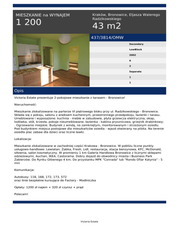 Kraków, Bronowice, Eljasza Walerego Radzikowskiego MIESZKANIE na WYNAJEM 1 200 43 m2 437/3814/OMW Secondary LowBlock 2002 6 2 Separate 1 1 Opis Victoria Estate prezentuje 2-pokojowe mieszkanie z tarasem - Bronowice! Nieruchomość: Mieszkanie zlokalizowane na parterze VI piętrowego bloku przy ul. Radzikowskiego - Bronowice. Składa się z pokoju, salonu z aneksem kuchennym, przestronnego przedpokoju, łazienki i tarasu. Umeblowane i wyposażone: kuchnia - meble w zabudowie, płyta grzewcza elektryczna, okap, lodówka, stół, krzesła; pokoje nieumeblowane; łazienka - kabina prysznicowa, grzejnik drabinkowy; . Ogrzewanie miejskie. Budynek z windą, na zamkniętym, monitorowanym i strzeżonym osiedlu. Pod budynkiem miejsca postojowe dla mieszkańców osiedla - wjazd otwierany na pilota. Na terenie osiedla plac zabaw dla dzieci oraz liczne ławki. Lokalizacja: Mieszkanie zlokalizowane w zachodniej części Krakowa - Bronowice. W pobliżu liczne punkty usługowo-handlowe: Lewiatan, Żabka, Fresh, Lidl, restauracja, stacja benzynowa, KFC, McDonald, siłownia, salon kosmetyczny. W promieniu 1 km Galeria Handlowa Bronowice z licznymi sklepami odzieżowymi, Auchan, IKEA, Castorama. Dobry dojazd do obwodnicy miasta i Business Park Zabierzów. Do Rynku Głównego 4 km. Do przystanku MPK "Conrada" lub "Rondo Ofiar Katynia" - 5 min Komunikacja: Autobusy: 118, 168, 172, 173, 572 oraz linie bezpłatne kursujące do Factory - Modlniczka Opłaty: 1200 zł najem + 320 zł czynsz + prąd Polecam! Victoria Estate Małgorzata Wicha tel. +48 511 560 721 email: [email protected] Victoria Estate Powered by TCPDF (www.tcpdf.org)