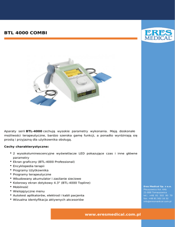 BTL 4000 COMBI Aparaty serii BTL-4000 cechują wysokie parametry wykonania. Mają doskonałe możliwości terapeutyczne, bardzo szeroka gamę funkcji, a ponadto wyróżniają się prostą i przyjazną dla użytkownika obsługą. Cechy charakterystyczne: 2 wysokoluminescencyjne wyświetlacze LED pokazujące czas i inne główne parametry Ekran graficzny (BTL-4000 Professional) Encyklopedia terapii Programy Użytkownika Programy terapeutyczne Wbudowany akumulator i zasilanie sieciowe Kolorowy ekran dotykowy 4.3" (BTL-4000 Topline) Eres Medical Sp. z o.o. Mobilność Płouszowice Kol. 64b Wielojęzyczne menu 21-008 Tomaszowice Autotest aplikatorów, elektrod i kabli pacjenta tel.: +48 81 502 00 70 Wizualna identyfikacja aktywnych akcesoriów fax: +48 81 502 10 32 [email protected] www.eresmedical.com.pl Wybór dźwięków, regulacja głośności, automatyczne wyłączanie Przykładowe aparaty: BTL-4825S Combi Topline (Double Plus) 2-kanałowa elektroterapia + 1-kanałowy ultradźwięk Niezależna terapia 2 pacjentów Wybieraj spośród ponad 5000 kształtów fali i ich modyfikacji Połączenie z aparatem podciśnieniowym Połączenie z aparatem do terapii ultradźwiękowej Anatomicznie dostosowane głowice dla wygodnego zastosowania Wodoodporne głowice Połączenie z innymi aparatami BTL: elektroterapia. BTL-4818S Combi Professional 1-kanałowy aparat do interferencyjnej elektroterapii z dodatkową gamą prądów + 1kanałowa terapia ultradźwiękowa Niezależna terapia 2 pacjentów Encyklopedia z gotowymi programami terapeutycznymi opracowanymi na podstawie wieloletnich badań medycznych Wybieraj spośród ponad 5000 kształtów fali i ich modyfikacji Wieloczęstotliwościowy system do ultradźwięków z wizualną kontrolą kontaktu elektrod ze skórą pacjenta BTL-4810S Combi Professional 1-kanałowy aparat do elektroterapii + 1-kanałowa terapia ultradźwiękowa Niezależna terapia 2 pacjentów Encyklopedia z gotowymi programami terapeutycznymi opracowanymi na podstawie wieloletnich badań medycznych Wieloczęstotliwościowy system do ultradźwięków z wizualną kontrolą kontaktu elektrod ze skórą pacjenta Szeroki wybór kształtów fali i ich modyfikacji Połączenie z aparatem podciśnieniowym Połączenie z aparatem do terapii ultradźwiękowej Anatomicznie dostosowane głowice dla wygodnego zastosowania Wodoodporne głowice BTL-4825L Combi Topline plus (Double Plus) 2-kanałowa elektroterapia z rozszerzonym zakresem pradów + 1-kanałowa laseroterapia Eres Medical Sp. z o.o. Płouszowice Kol. 64b 21-008 Tomaszowice tel.: +48 81 502 00 70 fax: +48 81 502 10 32 Niezależna terapia 2 pacjentów [email protected] www.eresmedical.com.pl Wybieraj spośród ponad 5000 kształtów fali i ich modyfikacji Oszczędzaj Twój czas: aplikuj sondy prysznicowe BTL na większe obszary ciała (do 1800mW) Szeroki wybór sond prysznicowych (do 400mW) do powierzchownych i głębszych warstw skóry Połączenie z aparatem podciśnieniowym Połączenie z aparatem do terapii ultradźwiękowej 2 wyjścia dla równoległego połączenia czerwonej i podczerwonej sondy lub sondy i sondy prysznicowej Wskazania do zabiegów z różnych dziedzin medycznych (rehabilitacja, dermatologia, ginekologia, laryngologia, medycyna sportowa, itd.) BTL-4825M2 Combi Topline (Double Plus) 2-kanałowa elektroterapia z rozszerzoną gamą prądów + 2-kanałowa magnetoterapia Niezależna terapia 2 pacjentów Wybieraj spośród ponad 5000 kształtów fali i ich modyfikacji Technologia FMF (Skoncentrowane Pole Magnetyczne) pole magnetyczne oddziaływujące na poddany terapii obszar bez wpływu na terapeutę Nowoczesna terapia z udowodnionymi efektami redukującymi ból, kontrolą przeciwzapalną i przyspieszonym okresem leczenia Połączenie z aparatem podciśnieniowym Połączenie z aparatem do terapii ultradźwiękowej Wybierz jeden z 6 typów wygodnych i lekkich aplikatorów do magnetoterapii Wskazania do zabiegów z różnych dziedzin medycznych (rehabilitacja, dermatologia, ginekologia, laryngologia, medycyna sportowa, itd.) BTL-4800LM2 Combi Topline 2-kanałowa magnetoterapia + 1-kanałowa laseroterapia Oszczędzaj Twój czas: aplikuj sondy prysznicowe BTL na większe obszary ciała (do 1800 mW) Technologia FMF (Skoncentrowane Pole Magnetyczne) pole magnetyczne oddziaływające na poddany terapii obszar bez wpływu na terapeutę Szeroki wybór sond prysznicowych (do 400 mW) do powierzchownych i głębszych warstw skóry Nowoczesna terapia z udowodnionymi efektami redukującymi ból, kontrolą przeciwzapalną i przyspieszonym okresem leczenia 2 wyjścia dla równoległego połączenia czerwonej i podczerwonej sondy lub Eres Medical Sp. z o.o. sondy i sondy prysznicowej Płouszowice Kol. 64b Wybierz jeden z 6 typów wygodnych i lekkich aplikatorów do magnetoterapii Wskazania do zabiegów z różnych dziedzin medycznych (rehabilitacja, 21-008 Tomaszowice tel.: +48 81 502 00 70 fax: +48 81 502 10 32 [email protected] www.eresmedical.com.pl dermatologia, ginekologia, laryngologia, medycyna sportowa, itd.) BTL-4800SL Combi Topline 1-kanałowy aparat do terapii ultradźwiękowej + 1-kanałowa laseroterapia Niezależna terapia 2 pacjentów Oszczędzaj Twój czas: aplikuj sondy prysznicowe BTL na większe obszary ciała (do 1800 mW) Szeroki wybór sond prysznicowych (do 400mW) do powierzchownych i głębszych warstw skóry Anatomicznie dostosowane głowice dla wygodnego zastosowania 2 wyjścia dla równoległego połączenia czerwonej i podczerwonej sondy lub sondy i sondy prysznicowej Wodoodporne głowice Wskazania do zabiegów z różnych dziedzin medycznych (rehabilitacja, dermatologia, ginekologia, laryngologia, medycyna sportowa, itd.) Eres Medical Sp. z o.o. Płouszowice Kol. 64b 21-008 Tomaszowice tel.: +48 81 502 00 70 fax: +48 81 502 10 32 [email protected] www.eresmedical.com.pl