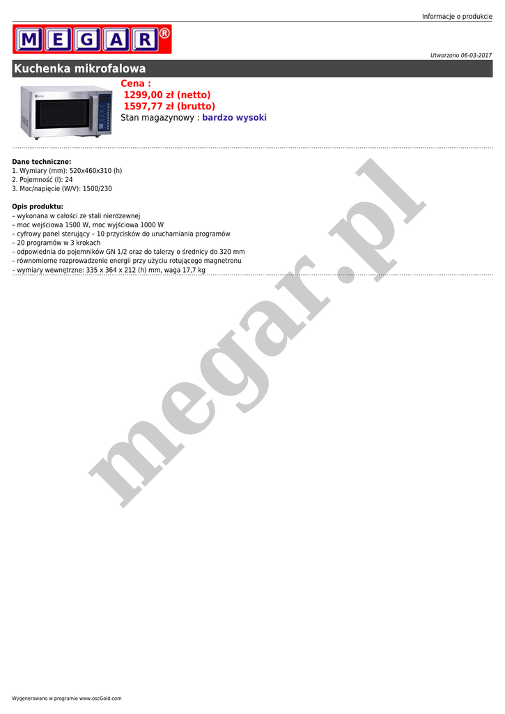 Informacje o produkcie Utworzono 06-03-2017 Kuchenka mikrofalowa Cena : 1299,00 zł (netto) 1597,77 zł (brutto) Stan magazynowy : bardzo wysoki m eg ar Opis produktu: – wykonana w całości ze stali nierdzewnej – moc wejściowa 1500 W, moc wyjściowa 1000 W – cyfrowy panel sterujący – 10 przycisków do uruchamiania programów – 20 programów w 3 krokach – odpowiednia do pojemników GN 1/2 oraz do talerzy o średnicy do 320 mm – równomierne rozprowadzenie energii przy użyciu rotującego magnetronu – wymiary wewnętrzne: 335 x 364 x 212 (h) mm, waga 17,7 kg .p l Dane techniczne: 1. Wymiary (mm): 520x460x310 (h) 2. Pojemność (l): 24 3. Moc/napięcie (W/V): 1500/230 Wygenerowano w programie www.oscGold.com
