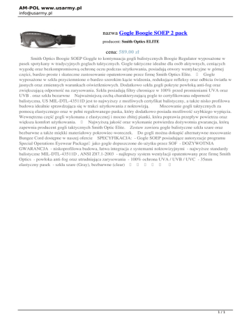 AM-POL www.usarmy.pl [email protected] nazwa Gogle Boogie SOEP 2 pack producent: Smith Optics ELITE cena: 589.00 zł Smith Optics Boogie SOEP Goggle to kontynuacja gogli balistycznych Boogie Regulator wyposażone w pasek spotykany w tradycyjnych goglach taktycznych. Gogle taktyczne idealne dla osób aktywnych, ceniących wygodę oraz bezkompromisową ochronę oczu podczas użytkowania, posiadają otwory wentylacyjne w górnej części, bardzo proste i skuteczne zastosowanie opatentowane przez firmę Smith Optics Elite. Gogle wyposażone w szkła przyciemnione o bardzo szerokim kącie widzenia, redukujące refleksy oraz odbicia światła w jasnych oraz zmiennych warunkach oświetleniowych. Dodatkowo szkła gogli pokryte powłoką anti-fog oraz zwiększającą odporność na zarysowania. Szkła posiadają filtry chroniące w 100% przed promieniami UVA oraz UVB . oraz szkła bezarwne Najważniejszą cechą charakteryzującą gogle to certyfikowana odporność balistyczna, US MIL-DTL-43511D jest to najwyższy z możliwych certyfikat balistyczny, a także nisko profilowa budowa idealnie sprawdzająca się w trakci użytkowania z noktowizją. Mocowanie gogli taktycznych za pomocą elastycznego oraz w pełni regulowanego paska, który dodatkowo posiada możliwość szybkiego wypięcia. Wewnętrzna część gogli wykonana z elastycznej i mocno zbitej pianki, która poprawia przepływ powietrza oraz większa komfort użytkowania. Najwyższą jakość oraz wykonanie potwierdza dożywotnia gwarancja, którą zapewnia producent gogli taktycznych Smith Optic Elite. Zestaw zawiera gogle balistyczne szkła szare oraz bezbarwne a także miękki materiałowy pokrowiec-woreczek. Do gogli można dokupić alternatywne mocowanie Bungee Cord dostępne w naszej ofercie SPECYFIKACJA: - Gogle SOEP posiadające autoryzacje programu Special Operations Eyewear Package jako gogle dopuszczone do użytku przez SOF - DOŻYWOTNIA GWARANCJA - niskoprofilowa budowa, łatwa integracja z systemami noktowizyjnymi - najwyższe standardy balistyczne MIL-DTL-43511D , ANSI Z87.1-2003 - najlepszy system wentylacji opatentowany prze firmę Smith Optics - powłoka anti-fog oraz utrudniająca zarysowania - 100% ochrona UVA / UVB / UVC - 35mm elastyczny pasek - szkła szare (Gray), bezbarwne (clear) 1/1