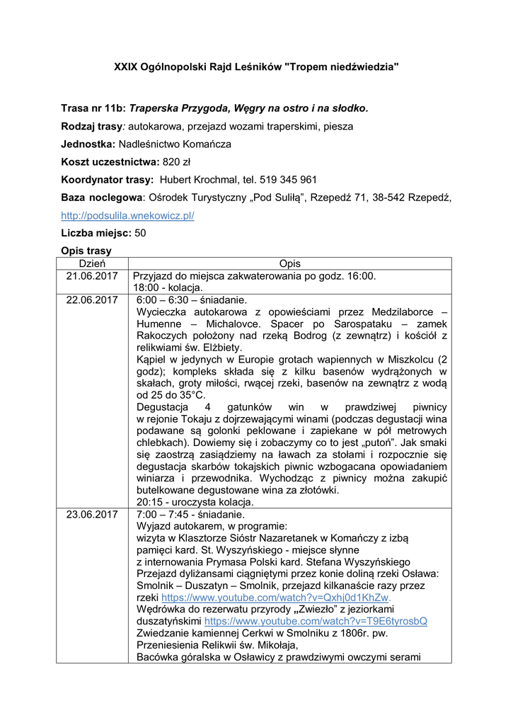 XXIX Ogólnopolski Rajd Leśników "Tropem niedźwiedzia" Trasa nr 11b: Traperska Przygoda, Węgry na ostro i na słodko. Rodzaj trasy: autokarowa, przejazd wozami traperskimi, piesza Jednostka: Nadleśnictwo Komańcza Koszt uczestnictwa: 820 zł Koordynator trasy: Hubert Krochmal, tel. 519 345 961 Baza noclegowa: Ośrodek Turystyczny „Pod Suliłą”, Rzepedź 71, 38-542 Rzepedź, http://podsulila.wnekowicz.pl/ Liczba miejsc: 50 Opis trasy Dzień 21.06.2017 22.06.2017 23.06.2017 Opis Przyjazd do miejsca zakwaterowania po godz. 16:00. 18:00 - kolacja. 6:00 – 6:30 – śniadanie. Wycieczka autokarowa z opowieściami przez Medzilaborce – Humenne – Michalovce. Spacer po Sarospataku – zamek Rakoczych położony nad rzeką Bodrog (z zewnątrz) i kościół z relikwiami św. Elżbiety. Kąpiel w jedynych w Europie grotach wapiennych w Miszkolcu (2 godz); kompleks składa się z kilku basenów wydrążonych w skałach, groty miłości, rwącej rzeki, basenów na zewnątrz z wodą od 25 do 35°C. Degustacja 4 gatunków win w prawdziwej piwnicy w rejonie Tokaju z dojrzewającymi winami (podczas degustacji wina podawane są golonki peklowane i zapiekane w pół metrowych chlebkach). Dowiemy się i zobaczymy co to jest „putoń”. Jak smaki się zaostrzą zasiądziemy na ławach za stołami i rozpocznie się degustacja skarbów tokajskich piwnic wzbogacana opowiadaniem winiarza i przewodnika. Wychodząc z piwnicy można zakupić butelkowane degustowane wina za złotówki. 20:15 - uroczysta kolacja. 7:00 – 7:45 - śniadanie. Wyjazd autokarem, w programie: wizyta w Klasztorze Sióstr Nazaretanek w Komańczy z izbą pamięci kard. St. Wyszyńskiego - miejsce słynne z internowania Prymasa Polski kard. Stefana Wyszyńskiego Przejazd dyliżansami ciągniętymi przez konie doliną rzeki Osława: Smolnik – Duszatyn – Smolnik, przejazd kilkanaście razy przez rzeki https://www.youtube.com/watch?v=Qxhj0d1KhZw. Wędrówka do rezerwatu przyrody „Zwiezło” z jeziorkami duszatyńskimi https://www.youtube.com/watch?v=T9E6tyrosbQ Zwiedzanie kamiennej Cerkwi w Smolniku z 1806r. pw. Przeniesienia Relikwii św. Mikołaja, Bacówka góralska w Osławicy z prawdziwymi owczymi serami 24.06.2017 i „ognistą niespodzianką”. Spotkanie z tradycjami łemkowskimi w Komańczy: stroje, krywulki, hafty, język. 20:15 - uroczysta kolacja. 8:00 – 10:00 - śniadanie. Przyjazd do MOSiR w Sanoku http://www.mosir-sanok.pl/ 13.00 – 22.00 podsumowanie Rajdu. Komańcza 11b - Traperska Przygoda, Węgry na ostro i na słodko https://drive.google.com/open?id=1EY3Yx0tHo1x6g3jaq_Oq3vnuJic&usp=sharing