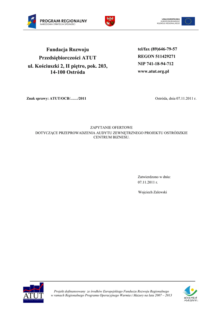 Fundacja Rozwoju tel/fax (89)646-79-57 Przedsiębiorczości ATUT REGON 511429271 ul. Kościuszki 2, II piętro, pok. 203, 14-100 Ostróda NIP 741-18-94-712 Znak sprawy: ATUT/OCB/……/2011 www.atut.org.pl Ostróda, dnia 07.11.2011 r. ZAPYTANIE OFERTOWE DOTYCZĄCE PRZEPROWADZENIA AUDYTU ZEWNĘTRZNEGO PROJEKTU OSTRÓDZKIE CENTRUM BIZNESU. Zatwierdzono w dniu: 07.11.2011 r. Wojciech Zalewski Projekt dofinansowany ze środków Europejskiego Funduszu Rozwoju Regionalnego w ramach Regionalnego Programu Operacyjnego Warmia i Mazury na lata 2007 – 2013 1. Nazwa i adres Zamawiającego (nazywanego w dalszej części Beneficjentem) Fundacja Rozwoju Przedsiębiorczości ATUT ul. Kościuszki 2, II piętro, pok. 203, 14-100 Ostróda, woj. warmińsko-mazurskie tel. (89)646-79-57, fax. (89)646-79-57 REGON 511429271, NIP 741-18-94-712 adres internetowy: www.atut.org.pl 2. Tryb udzielenia zamówienia 2.1 Postępowanie prowadzone zgodnie z zasadą konkurencyjności. 2.2 Zapytanie ofertowe opublikowano: w siedzibie Zamawiającego oraz na stronie internetowej Zamawiającego - www.atut.org.pl 3. Opis przedmiotu zamówienia 3.1 Przedmiotem zamówienia jest: przeprowadzenie audytu zewnętrznego projektu Ostródzkie Centrum Biznesu zgodnie ze szczegółową specyfikacja (stanowiąca zał. nr 1) 3.2 Szczegółowy opis przedmiotu zamówienia, tj. szczegółową specyfikację zawiera załącznik nr 1 do zapytania ofertowego. 3.3 Zamówienie realizowane jest w ramach projektu „Ostródzkie Centrum Biznesu”, Regionalny Program Operacyjny Warmia i Mazury 2007 – 2013. 3.4 Usługa objęta przedmiotem zamówienia musi spełniać co najmniej minimalne wymagania określone w załączniku nr 1 do zapytania ofertowego. 4. Opis części zamówienia, jeŜeli Zamawiający dopuszcza składanie ofert częściowych Oferta musi obejmować całość zamówienia - nie dopuszcza się moŜliwości składania ofert częściowych. 5. Opis sposobu przedstawiania ofert wariantowych oraz minimalne warunki, jakim muszą odpowiadać oferty wariantowe, jeŜeli Zamawiający dopuszcza ich składanie Zamawiający nie dopuszcza moŜliwości złoŜenia oferty wariantowej. PrzedłoŜone oferty muszą być zgodne z wymaganiami zawartymi w zapytaniu ofertowym. 6. Termin wykonania zamówienia Zamówienie naleŜy zrealizować w terminie: raport z przeprowadzonego audytu naleŜy przedłoŜyć Zamawiającemu do dnia 29.11.2011 roku roku. 7. Warunki udziału w postępowaniu oraz opis sposobu dokonywania oceny spełniania tych warunków 1) O udzielenie zlecenia mogą się ubiegać wykonawcy, którzy posiadają niezbędne kwalifikacje i doświadczenie lub/i dysponują osobami zdolnymi do wykonania zlecenia. 2) Przez wykonawców o odpowiednich kwalifikacjach i doświadczeniu naleŜy rozumieć podmioty posiadające: a) udokumentowane kwalifikacje, b) udokumentowane doświadczenie: - w zakresie audytowania zadań lub projektów finansowanych ze środków publicznych, - związane z badaniem prawidłowości wykorzystania środków publicznych, - w przeprowadzaniu audytu zewnętrznego. 3) Wykonawca ubiegający się o przeprowadzenie audytu zewnętrznego zobligowany jest do złoŜenia: a) wykazu wykonanych audytów zadań lub projektów finansowych ze środków publicznych wraz z terminem ich wykonania, b) wykazu osób, które będą uczestniczyć w wykonaniu audytu wraz z informacjami na temat ich kwalifikacji zawodowych i doświadczenia, c) potwierdzających za zgodność z oryginałem dokumentów potwierdzających kwalifikacje zawodowe uprawniające do przeprowadzenia zadania audytowego. 4) PowyŜsze dokumenty powinny dotyczyć zarówno kwalifikacji i doświadczenia osób, które będą bezpośrednio zaangaŜowane w realizację zlecenia, jak równieŜ podmiotu ubiegającego się o uzyskanie zlecenia. 5) Audyt przeprowadzać mogą podmioty, które m.in.: a) uprawnione są do badania sprawozdań finansowych na mocy ustawy z dnia 7 maja 2009 r. o biegłych rewidentach i ich samorządzie, podmiotach uprawnionych do badania sprawozdań finansowych oraz o nadzorze publicznym (t.j. Dz. U. z 2009 r., Nr 77, poz. 649.), b) posiadają kwalifikacje zawodowe do przeprowadzania audytu wewnętrznego zgodnie z ustawą z 27 sierpnia 2009 r. o finansach publicznych (Dz. U. z 2009 r., Nr 157, poz. 1240), c) w latach 2003-2006 zdały przed komisją powołaną w Ministerstwie Finansów egzamin pozwalający na wykonywanie zawodu audytora wewnętrznego, oraz: - posiadają pełną zdolność do czynności prawnych i korzystają z pełni praw publicznych, - nie były karane za umyślne przestępstwo lub umyślne przestępstwo skarbowe, 6) Mając na uwadze poprawność i kompleksowość audytu zalecane jest, aby jednym z członków zespołu audytowego była osoba posiadająca uprawnienia biegłego rewidenta. Bezstronność i niezaleŜność wykonawcy audytu zewnętrznego 1) Wykonawca audytu zewnętrznego oraz osoby uczestniczące w przeprowadzaniu audytu muszą spełniać wymóg bezstronności i niezaleŜności od badanego Beneficjenta. Pisemne oświadczenie o braku lub istnieniu okoliczności, składa zarówno wykonawca audytu zewnętrznego jak i osoby przeprowadzające audyt. 2) Niniejsze oświadczenia stanowią załączniki do umowy podpisywanej pomiędzy Beneficjentem a wykonawcą audytu zewnętrznego. 3) Bezstronność i niezaleŜność nie jest zachowana, jeŜeli wykonawca audytu zewnętrznego (dotyczy równieŜ osób uczestniczących w przeprowadzaniu audytu): a) posiada udziały, akcje lub inne tytuły własności w jednostce pełniącej rolę Beneficjenta RPO WiM lub w jednostce z nią stowarzyszonej, dominującej, zaleŜnej lub współzaleŜnej, w której ma wykonać usługę dotyczącą audytu zewnętrznego projektu, b) jest lub był w ciągu ostatnich 3 lat przedstawicielem prawnym (pełnomocnikiem), członkiem organów nadzorczych bądź zarządzających lub pracownikiem Beneficjenta albo jednostki z nią stowarzyszonej, dominującej, zaleŜnej lub współzaleŜnej,