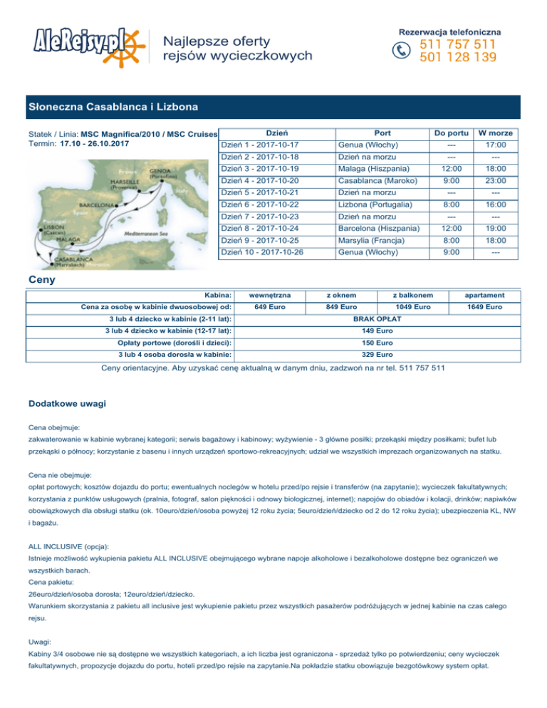 Słoneczna Casablanca i Lizbona Dzień Statek / Linia: MSC Magnifica/2010 / MSC Cruises Termin: 17.10 - 26.10.2017 Dzień 1 - 2017-10-17 Genua (Włochy) Port Do portu W morze --- 17:00 Dzień 2 - 2017-10-18 Dzień na morzu --- --- Dzień 3 - 2017-10-19 Malaga (Hiszpania) 12:00 18:00 Dzień 4 - 2017-10-20 Casablanca (Maroko) 9:00 23:00 Dzień 5 - 2017-10-21 Dzień na morzu Dzień 6 - 2017-10-22 Lizbona (Portugalia) Dzień 7 - 2017-10-23 Dzień na morzu --- --- Dzień 8 - 2017-10-24 Barcelona (Hiszpania) 12:00 19:00 Dzień 9 - 2017-10-25 Marsylia (Francja) 8:00 18:00 Dzień 10 - 2017-10-26 Genua (Włochy) 9:00 --- --- --- 8:00 16:00 Ceny Kabina: Cena za osobę w kabinie dwuosobowej od: wewnętrzna z oknem z balkonem apartament 649 Euro 849 Euro 1049 Euro 1649 Euro 3 lub 4 dziecko w kabinie (2-11 lat): BRAK OPŁAT 3 lub 4 dziecko w kabinie (12-17 lat): 149 Euro Opłaty portowe (dorośli i dzieci): 150 Euro 3 lub 4 osoba dorosła w kabinie: 329 Euro Ceny orientacyjne. Aby uzyskać cenę aktualną w danym dniu, zadzwoń na nr tel. 511 757 511 Dodatkowe uwagi Cena obejmuje: zakwaterowanie w kabinie wybranej kategorii; serwis bagażowy i kabinowy; wyżywienie - 3 główne posiłki; przekąski między posiłkami; bufet lub przekąski o północy; korzystanie z basenu i innych urządzeń sportowo-rekreacyjnych; udział we wszystkich imprezach organizowanych na statku. Cena nie obejmuje: opłat portowych; kosztów dojazdu do portu; ewentualnych noclegów w hotelu przed/po rejsie i transferów (na zapytanie); wycieczek fakultatywnych; korzystania z punktów usługowych (pralnia, fotograf, salon piękności i odnowy biologicznej, internet); napojów do obiadów i kolacji, drinków; napiwków obowiązkowych dla obsługi statku (ok. 10euro/dzień/osoba powyżej 12 roku życia; 5euro/dzień/dziecko od 2 do 12 roku życia); ubezpieczenia KL, NW i bagażu. ALL INCLUSIVE (opcja): Istnieje możliwość wykupienia pakietu ALL INCLUSIVE obejmującego wybrane napoje alkoholowe i bezalkoholowe dostępne bez ograniczeń we wszystkich barach. Cena pakietu: 26euro/dzień/osoba dorosła; 12euro/dzień/dziecko. Warunkiem skorzystania z pakietu all inclusive jest wykupienie pakietu przez wszystkich pasażerów podróżujących w jednej kabinie na czas całego rejsu. Uwagi: Kabiny 3/4 osobowe nie są dostępne we wszystkich kategoriach, a ich liczba jest ograniczona - sprzedaż tylko po potwierdzeniu; ceny wycieczek fakultatywnych, propozycje dojazdu do portu, hoteli przed/po rejsie na zapytanie.Na pokładzie statku obowiązuje bezgotówkowy system opłat. Należność reguluje się ostatniego dnia rejsu gotówką (wpłata depozytu ok. 250euro/kabina pierwszego dnia rejsu) lub kartą kredytową (VISA, Mastercard, American Express) na podstawie zbiorczego rachunku. Karty kredytowe należy zarejestrować zaraz po zaokrętowaniu. MSC Magnifica/2010 MSC Magnifica Tonaż: 93.000 ton Długość: 294 m Szerokość: 32 m Szybkość: 23 węzły Pokłady pasażerskie: 13 Załoga: 1027 Pasażerowie: 2500 (do 3013) Basen: 5 Waluta: EURO Rodzaje kabin Inside Cabins - to kabiny wewnętrzne, których metraż wynosi 14 m2. Na życzenie klientów dwa pojedyncze łóżka mogą zostać połączone w jedno duże, za wyjątkiem kabin dla pasażerów niepełnosprawnych. W kabinach znajduje się telewizor, telefon, sejf, oraz mini bar. Łazienki wyposażone są w umywalkę, prysznic, WC oraz suszarkę do włosów. Pomieszczenia są klimatyzowane. Istnieje możliwość podłączenia w kabinie do internetu przy użyciu własnego laptopa (usługa płatna). Kabiny są dostosowane do potrzeb osób niepełnosprawnych. Outside Cabins - to kabiny wielkości 17,8 m2 posiadające okno. Wyposażone są w dwa pojedyncze łóżka, które na życzenie klientów mogą zostać połączone w jedno duże. W kabinach znajduje się telewizor, telefon, sejf, oraz mini bar. Łazienki posiadają umywalkę, prysznic, WC oraz suszarkę do włosów. Pomieszczenia są klimatyzowane. Istnieje możliwość podłączenia w kabinie do internetu przy użyciu własnego laptopa (usługa płatna). Kabiny są dostosowane do potrzeb osób niepełnosprawnych. Outside Cabins with Balcony - to kabiny wielkości 17,8 m2 z prywatnym balkonem. Na ich wyposażeniu znajdują się dwa pojedyncze łóżka, które na życzenie klientów mogą zostać połączone w jedno duże. Klienci mają do swojej dyspozycji telewizor, telefon oraz mini bar. Łazienki wyposażone są w umywalkę, prysznic, WC oraz suszarkę do włosów. Pomieszczenia są klimatyzowane. Istnieje możliwość podłączenia w kabinie do internetu przy użyciu własnego laptopa (usługa płatna). Kabiny te dostosowane są także dla potrzeb osób niepełnosprawnych. W przypadku kabin przeznaczonych dla osób niepełnosprawnych dostępne są jedynie dwa pojedyncze łóżka. Suites with Balcony - to wygodne apartamenty o powierzchni 25 m2 z prywatnym balkonem. Składają się z sypialni z podwójnym łóżkiem z możliwością rozłączenia na 2 oddzielne łóżka i części wypoczynkowej. Ponadto w apartamencie mieści się przestronna szafa, sejf, mini bar, telewizor i telefon. Łazienka wyposażona jest w umywalkę, wannę, WC oraz suszarkę do włosów. Pomieszczenia są klimatyzowane. Istnieje możliwość podłączenia w kabinie do internetu przy użyciu własnego laptopa (usługa płatna).