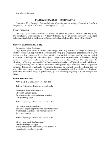 Rekolekcje – Świętość PIĄTEK, GODZ. 20.00 – EUCHARYSTIA Formularz Mszy Świętej o Duchu Świętym. Czytania podane poniżej (Czytanie 1 i psalm lekcjonarz, t. VI, wyd. 2, s. 426-427, Ewangelia, s. 151*). Temat rozważań Dlaczego Ojciec Święty uważał, że istnieje lęk przed świętością? Mówił: „Nie bójcie się być świętymi”. Wsłuchujemy się w teksty biblijne, by w ich świetle zobaczyć różne lęki człowieka, także lęk przed Bogiem. Chcemy też usłyszeć słowa Chrystusa: „Nie bój się”. Pierwsze czytanie (Rdz 3,9-15) Czytanie z Księgi Rodzaju. Gdy Adam zjadł owoc z drzewa zakazanego, Pan Bóg zawołał na niego i zapytał go: «Gdzie jesteś?» On odpowiedział: «Usłyszałem Twój głos w ogrodzie, przestraszyłem się, bo jestem nagi, i ukryłem się». Rzekł Bóg: «Któż ci powiedział, że jesteś nagi? Czy może zjadłeś z drzewa, z którego ci zakazałem jeść?» Mężczyzna odpowiedział: «Niewiasta, którą postawiłeś przy mnie, dała mi owoc z tego drzewa, i zjadłem». Wtedy Pan Bóg rzekł do niewiasty: «Dlaczego to uczyniłaś?» Niewiasta odpowiedziała: «Wąż mnie zwiódł i zjadłam». Wtedy Pan Bóg rzekł do węża: «Ponieważ to uczyniłeś, bądź przeklęty wśród wszystkich zwierząt domowych i polnych; na brzuchu będziesz się czołgał i proch będziesz jadł po wszystkie dni twego istnienia. Wprowadzam nieprzyjaźń między ciebie a niewiastę, pomiędzy potomstwo twoje a potomstwo jej: ono zmiażdży ci głowę, a ty zmiażdżysz mu piętę». Psalm responsoryjny Ps 98 (97), 1. 2-3ab. 3cd-4 (R.: por. 1ab Refren: Śpiewajcie Panu, bo uczynił cuda. Śpiewajcie Panu pieśń nową, * albowiem uczynił cuda. Zwycięstwo Mu zgotowała Jego prawica * i święte ramię Jego. Refren: Śpiewajcie Panu, bo uczynił cuda. Pan okazał swoje zbawienie, * na oczach pogan objawił swoją sprawiedliwość. Wspomniał na dobroć i na wierność swoją * dla domu Izraela. Refren: Śpiewajcie Panu, bo uczynił cuda. Ujrzały wszystkie krańce ziemi * zbawienie Boga naszego. Wołaj z radości na cześć Pana, cała ziemio, * cieszcie się, weselcie, i grajcie. Refren: Śpiewajcie Panu, bo uczynił cuda. Werset przed Ewangelią Alleluja, alleluja, alleluja Jezus powiedział: Pójdź za Mną, odtąd ludzi będziesz łowił. Alleluja, alleluja, alleluja. Ewangelia Słowa Ewangelii według świętego Łukasza (Łk 5,1-11) Gdy tłum cisnął się do Niego, aby słuchać słowa Bożego, a On stał nad jeziorem Genezaret, zobaczył dwie łodzie, stojące przy brzegu; rybacy zaś wyszli z nich i płukali sieci. Wszedłszy do jednej łodzi, która należała do Szymona, poprosił go, żeby nieco odbił od brzegu. Potem usiadł i z łodzi nauczał tłumy. Gdy przestał mówić, rzekł do Szymona: Wypłyń na głębię i zarzućcie sieci na połów! A Szymon odpowiedział: Mistrzu, całą noc pracowaliśmy i niceśmy nie ułowili. Lecz na Twoje słowo zarzucę sieci. Skoro to uczynili, zagarnęli tak wielkie mnóstwo ryb, że sieci ich zaczynały się rwać. Skinęli więc na współtowarzyszy w drugiej łodzi, żeby im przyszli z pomocą. Ci podpłynęli; i napełnili obie łodzie, tak że się prawie zanurzały. Widząc to Szymon Piotr przypadł Jezusowi do kolan i rzekł: Odejdź ode mnie, Panie, bo jestem człowiek grzeszny. I jego bowiem, i wszystkich jego towarzyszy w zdumienie wprawił połów ryb, jakiego dokonali; jak również Jakuba i Jana, synów Zebedeusza, którzy byli wspólnikami Szymona. Lecz Jezus rzekł do Szymona: Nie bój się, odtąd ludzi będziesz łowił. I przyciągnąwszy łodzie do brzegu, zostawili wszystko i poszli za Nim. Oto słowo Pańskie.