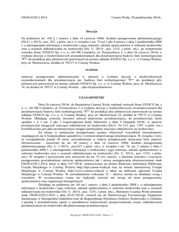 OSOŚ.6220.2.2014 Czarna Woda, 30 października 2014r. Decyzja Na podstawie art. 105 § 1 ustawy z dnia 14 czerwca 1960r. Kodeks postępowania administracyjnego (Dz.U. z 2013r., poz. 267, z późn. zm.), w związku z art. 75 ust.1 pkt 4 ustawy z dnia 3 października 2008 r. o udostępnianiu informacji o środowisku i jego ochronie, udziale społeczeństwa w ochronie środowiska oraz o ocenach oddziaływania na środowisko (Dz. U. 2013r., poz. 1235, z późn. zm.) , po rozpatrzeniu wniosku firmy STEICO Sp. z o. o., 64-700 Czarnków, ul. Przemysłowa 2, z dnia 26 czerwca 2014r. o wydanie decyzji o środowiskowych uwarunkowaniach dla przedsięwzięcia budowy linii technologicznej "P7" do produkcji płyt pilśniowych porowatych na terenie zakładu STEICO Sp. z o. o. w Czarnej Wodzie, przy ul. Mickiewicza, działka nr 795/37 w Czarnej Wodzie. orzekam umorzyć postępowanie administracyjne w sprawie o wydanie decyzji o środowiskowych uwarunkowaniach dla przedsięwzięcia pn: budowa linii technologicznej "P7" do produkcji płyt pilśniowych porowatych na terenie zakładu STEICO Sp. z o. o. w Czarnej Wodzie, przy ul. Mickiewicza 10 na działce nr 795/37 w Czarnej Wodzie – jako bezprzedmiotowe. UZASADNIENIE Dnia 26 czerwca 2014r. do Burmistrza Czarnej Wody wpłynął wniosek firmy STEICO Sp. z o. o., 64-700 Czarnków, ul. Przemysłowa 2 o wydanie decyzji o środowiskowych uwarunkowaniach dla przedsięwzięcia budowy linii technologicznej "P7" do produkcji płyt pilśniowych porowatych na terenie zakładu STEICO Sp. z o. o. w Czarnej Wodzie, przy ul. Mickiewicza 10, działka nr 795/37 w Czarnej Wodzie. Składając wniosek, inwestor zaliczył planowane przedsięwzięcie, do przedsięwzięć, które zgodnie z § 3 ust. 2 pkt 3 rozporządzenia Rady Ministrów z dnia 9 listopada 2010r. w sprawie przedsięwzięć mogących znacząco oddziaływać na środowisko (Dz.U. Nr 213, poz. 1397 z późn. zm.) kwalifikowane jest jako przedsięwzięcie mogące potencjalnie znacząco oddziaływać na środowisko. Za strony w niniejszym postępowaniu uznano właścicieli wszystkich nieruchomości znajdujących się w bezpośrednim sąsiedztwie z terenem planowanego przedsięwzięcia. W związku z tym, że uwzględniono ponad 20 stron, zawiadomienia w trakcie postępowania doręczane były poprzez obwieszczenie - stosownie do art. 49 ustawy z dnia 14 czerwca 1960r. Kodeks postępowania administracyjnego (Dz. U. z 2013r., poz.627 z późn. zm.), w związku z art. 74, ust. 3 ustawy z dnia 3 października 2008 r. o udostępnianiu informacji o środowisku i jego ochronie, udziale społeczeństwa w ochronie środowiska oraz o ocenach oddziaływania na środowisko (Dz. U. 2013r., poz. 1235, z późn. zm.). W związku z powyższym oraz stosownie do art. 33 ww. ustawy, o złożeniu wniosku i wszczęciu postępowania powiadomiono zarówno społeczeństwo jak i strony postępowania obwieszczeniem znak OSOŚ.6220.2.2014, które w dniu 3.07.2014r. zamieszczono na stronie Biuletynu Informacji Publicznej Urzędu Miejskiego w Czarnej Wodzie http://bip.czarna-woda.pl oraz na stronie internetowej Urzędu Miejskiego w Czarnej Wodzie http://www.czarna-woda.pl a także na tablicach ogłoszeń Urzędu Miejskiego w Czarnej Wodzie. W zawiadomieniu wskazano 21 – dniowy termin na składanie uwag i wniosków. W wyznaczonym czasie nie wpłynęły wnioski ani uwagi od stron postępowania, społeczeństwa oraz organizacji ekologicznych. Działając na podstawie art. 64 ust.1 ustawy z dnia 3 października 2008 r. o udostępnianiu informacji o środowisku i jego ochronie, udziale społeczeństwa w ochronie środowiska oraz o ocenach oddziaływania na środowisko (Dz. U. 2013r., poz. 1235, z późn. zm.)., Burmistrz Czarnej Wody pismami znak OSOŚ.6220.2.2014 z dnia 03.07.2014r. zwrócił się do Państwowego Powiatowego Inspektora Sanitarnego w Starogardzie Gdańskim oraz do Regionalnego Dyrektora Ochrony Środowiska w Gdańsku z prośbą o przedstawienie opinii w przedmiocie konieczności przeprowadzenia oceny oddziaływania przedsięwzięcia na środowisko dla planowanego przedsięwzięcia. Decyzja nr OSOŚ.6220.2.2014 - Strona 1/7 Z uzyskanej opinii, Państwowego Powiatowego Inspektora Sanitarnego w Starogardzie Gdańskim, zawartej w opinii znak SE-VII-471/45/EK/14 z dnia 25.07.2014r., wynika, że dla planowanego przedsięwzięcia budowy linii technologicznej "P7" do produkcji płyt pilśniowych porowatych na terenie zakładu STEICO Sp. z o. o. w Czarnej Wodzie wymaga się przeprowadzenia oceny oddziaływania na środowisko. W uzasadnieniu swojej opinii Państwowy Powiatowy Inspektor Sanitarny stwierdził, że planowana inwestycja zalicza się do przedsięwzięć mogących potencjalnie znacząco oddziaływać na środowisko zgodnie z § 3 ust. 2 pkt 3 rozporządzenia Rady Ministrów z dnia 9 listopada 2010r. w sprawie przedsięwzięć mogących znacząco oddziaływać na środowisko (Dz.U. Nr 213, poz. 1397 z późn. zm.). Państwowy Powiatowy Inspektor Sanitarny zauważył, że planowane przedsięwzięcie zostanie usytuowane w istniejącej hali po byłej lakierni płyt, która znajduje się w zachodniej części terenu zakładu. Uruchomienie nowej linii wymagało będzie również montażu dodatkowych urządzeń w istniejącej hali rozwłókniania. W projektowanej linii technologicznej „P7” stosowana będzie technologia produkcji płyt pilśniowych porowatych metodą mokrą, w której nośnikiem masy włóknistej jest woda. Surowiec do produkcji płyt pilśniowych w postaci zrębków lub drewna papierówki będzie dostarczany do zakładu transportem samochodowym. Drewno magazynowane będzie na istniejących placach magazynowych. Papierówka rozdrobniona w istniejącym rębaku wraz ze zrębkami trafiać będzie do istniejącej hali rozwłókniania, gdzie planuje się zainstalowanie dodatkowego defibratora do rozwłókniania drewna oraz kadzi masy nierafinowanej wraz z dwoma rafinatorami do mielenia masy drzewnej. Przygotowana masa drz