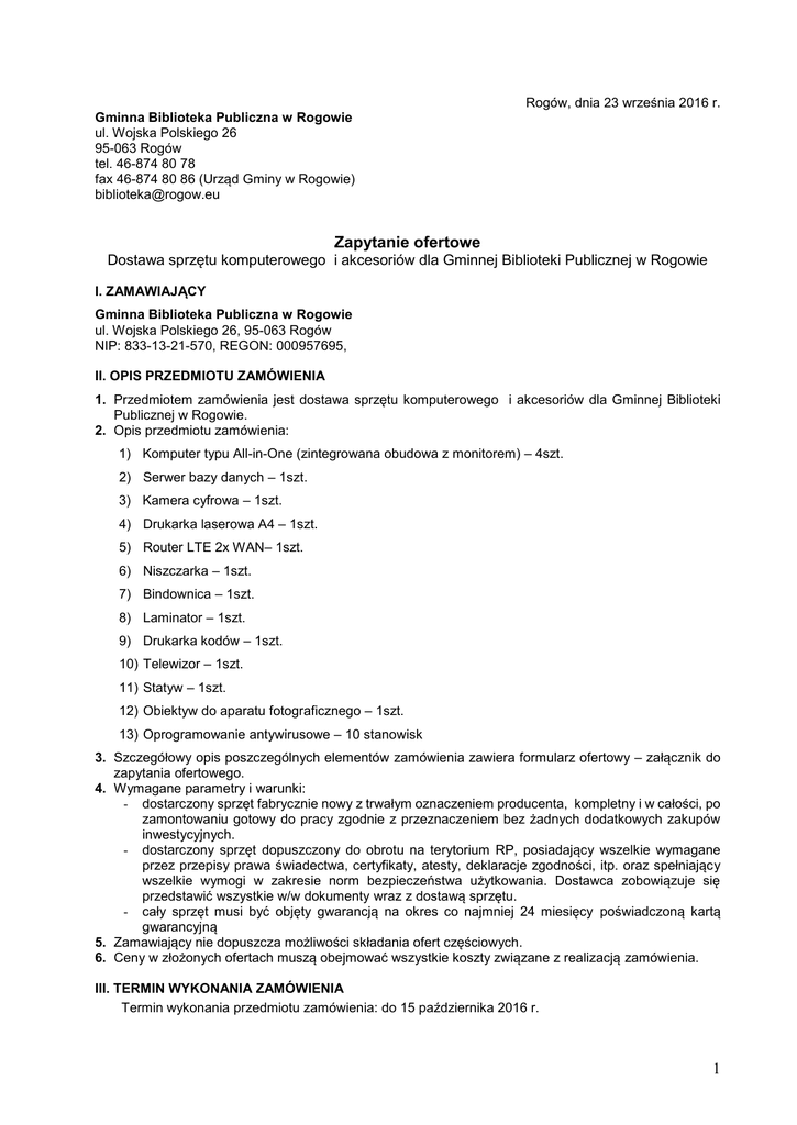 Rogów, dnia 23 września 2016 r. Gminna Biblioteka Publiczna w Rogowie ul. Wojska Polskiego 26 95-063 Rogów tel. 46-874 80 78 fax 46-874 80 86 (Urząd Gminy w Rogowie) [email protected] Zapytanie ofertowe Dostawa sprzętu komputerowego i akcesoriów dla Gminnej Biblioteki Publicznej w Rogowie I. ZAMAWIAJĄCY Gminna Biblioteka Publiczna w Rogowie ul. Wojska Polskiego 26, 95-063 Rogów NIP: 833-13-21-570, REGON: 000957695, II. OPIS PRZEDMIOTU ZAMÓWIENIA 1. Przedmiotem zamówienia jest dostawa sprzętu komputerowego i akcesoriów dla Gminnej Biblioteki Publicznej w Rogowie. 2. Opis przedmiotu zamówienia: 1) Komputer typu All-in-One (zintegrowana obudowa z monitorem) – 4szt. 2) Serwer bazy danych – 1szt. 3) Kamera cyfrowa – 1szt. 4) Drukarka laserowa A4 – 1szt. 5) Router LTE 2x WAN– 1szt. 6) Niszczarka – 1szt. 7) Bindownica – 1szt. 8) Laminator – 1szt. 9) Drukarka kodów – 1szt. 10) Telewizor – 1szt. 11) Statyw – 1szt. 12) Obiektyw do aparatu fotograficznego – 1szt. 13) Oprogramowanie antywirusowe – 10 stanowisk 3. Szczegółowy opis poszczególnych elementów zamówienia zawiera formularz ofertowy – załącznik do zapytania ofertowego. 4. Wymagane parametry i warunki: - dostarczony sprzęt fabrycznie nowy z trwałym oznaczeniem producenta, kompletny i w całości, po zamontowaniu gotowy do pracy zgodnie z przeznaczeniem bez żadnych dodatkowych zakupów inwestycyjnych. - dostarczony sprzęt dopuszczony do obrotu na terytorium RP, posiadający wszelkie wymagane przez przepisy prawa świadectwa, certyfikaty, atesty, deklaracje zgodności, itp. oraz spełniający wszelkie wymogi w zakresie norm bezpieczeństwa użytkowania. Dostawca zobowiązuje się przedstawić wszystkie w/w dokumenty wraz z dostawą sprzętu. - cały sprzęt musi być objęty gwarancją na okres co najmniej 24 miesięcy poświadczoną kartą gwarancyjną 5. Zamawiający nie dopuszcza możliwości składania ofert częściowych. 6. Ceny w złożonych ofertach muszą obejmować wszystkie koszty związane z realizacją zamówienia. III. TERMIN WYKONANIA ZAMÓWIENIA Termin wykonania przedmiotu zamówienia: do 15 października 2016 r. 1 IV. OPIS SPOSBU PRZYGOTOWANIA OFERTY Oferent powinien stworzyć ofertę na formularzu załączonym do niniejszego zapytania. Oferta powinna być: - opatrzona pieczątką firmową, - posiadać datę sporządzenia, - zawierać adres lub siedzibę oferenta, numer telefonu, numer NIP, - podpisana czytelnie przez wykonawcę. V. MIEJSCE ORAZ TERMIN SKŁADANIA OFERT 1. 2. 3. 4. 5. Oferta powinna być przesłana za pośrednictwem: poczty elektronicznej na adres: [email protected] , faksem na nr: 46-874 80 86, poczty, kuriera lub też dostarczona osobiście na adres: Gminna Biblioteka Publiczna w Rogowie do dnia 03 października 2016 r. Ocena ofert zostanie dokonana w dniu 04 października 2016 r., a wyniki i wybór najkorzystniejszej oferty zostanie ogłoszony o godzinie 14:00 w siedzibie Gminnej Biblioteki Publicznej w Rogowie oraz opublikowany w Internecie na stronie bip.rogow.eu. Oferty złożone po terminie nie będą rozpatrywane. Oferent może przed upływem terminu składania ofert zmienić lub wycofać swoją ofertę. W toku badania i oceny ofert Zamawiający może żądać od oferentów wyjaśnień dotyczących treści złożonych ofert. VI. OCENA OFERT Zamawiający dokona oceny ważnych ofert na podstawie następujących kryteriów: Cena 100% VII. INFORMACJE DOTYCZĄCE WYBORU NAJKORZYSTNIEJSZEJ OFERTY 1. O wyborze najkorzystniejszej oferty Zamawiający zawiadomi Podmiot, którego oferta zostanie wybrana; 2. Jeżeli firma, której oferta zostanie wybrana będzie uchylać się od zawarcia umowy, Zamawiający może wybrać ofertę najkorzystniejszą spośród pozostałych ofert. VIII. DODATKOWE INFORMACJE Dodatkowych informacji udziela Krzysztof Boberek pod numerem telefonu 468748012 oraz adresem email: [email protected] IX. UWAGI KOŃCOWE 1. Zamawiający zastrzega sobie prawo do: prowadzenia negocjacji w celu zawarcia umowy uzyskania szerszych informacji dotyczących złożonej oferty rezygnacji z wyboru oferty bez podania przyczyny. 2. Niniejsze zapytanie ofertowe nie zobowiązuje Zamawiającego do żadnego określonego działania. Wydanie niniejszego zapytania ofertowego nie zobowiązuje Zamawiającego do akceptacji oferty, w całości lub części, bez względu na jej zawartość cenową i nie zobowiązuje do składania wyjaśnień czy powodów akceptacji lub odrzucenia oferty. 3. Zamawiający zastrzega sobie prawo do podjęcia negocjacji ze składającym ofertę, którego oferta zostanie wybrana oraz prawo do odstąpienia od udzielenia zamówienia w wypadku nieuzyskania porozumienia w toku prowadzonych negocjacji. 4. Na podstawie złożonej oferty oraz procesu negocjacyjnego zostanie podpisana umowa na zakup sprzętu i akcesoriów dla Gminnej Biblioteki Publicznej w Rogowie. 5. Zamawiający zastrzega sobie prawo do unieważnienia niniejszego zapytania ofertowego. 6. Zamawiający nie może być pociągany do odpowiedzialności za jakiekolwiek koszty czy wydatki poniesione przez Oferentów w związku z przygotowaniem i dostarczeniem oferty. 7. Zamawiający zastrzega sobie prawo do odwołania zapytania i/lub odstąpienia od ewentualnych negocjacji bez podania przyczyn. Z tego tytułu Oferentowi nie przysługują żadne roszczenia wobec Zamawiającego. IX. ZAŁĄCZNIKI Wzór formularza ofertowego. 2