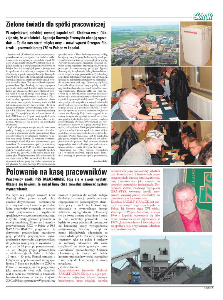 Zielone światło dla spółki pracowniczej W największej polskiej czynnej kopalni soli Kłodawa wrze. Okazuje się, że właściciel - Agencja Rozwoju Przemysłu chce ją sprzedać. – To dla nas strzał między oczy – mówi wprost Grzegorz Pietrzak – przewodniczący ZZG w Polsce w kopalni. Kopalnia soli „Kłodawa” to jeden z największych pracodawców w tym rejonie. I w dodatku zakład o znaczeniu strategicznym. Zatrudnia ponad 900 osób. Osiąga niezłe wyniki. W ostatnim czasie kopalnia starała się o nową koncesję na wydobycie na kolejne lata. Aż tu nagle jak grom z jasnego nieba spadła na nich informacja – ogłoszenie, które ukazało się w prasie, Agencji Rozwoju Przemysłu (ARP), która zaprosiła potencjalnych zainteresowanych do złożenia oferty na wykup akcji. I wówczas wybuchła afera. Ten news całkowicie poraził pracowników. Tym bardziej, że mają negatywne przykłady okolicznych kopalni węgla brunatnego Konin czy Adamów, gdzie nowy właściciel zwalnia ludzi. Boją się, że załoga straci pracę, a kopalnia zamieni się w składowisko odpadów. - Nikt z nami tej chęci sprzedaży nie konsultował . Również zarząd zastrzegał się, że o niczym nie wie. Jak tak można postępować i drwić z ludzi – dziwi się Grzegorz Pietrzak - przewodniczący ZZG w Polsce w KS „Kłodawa”. Przecież razem budowaliśmy strategię. Nic specjalnego nie wskazywało na taki krok ARP, która ma 85 proc. akcji spółki. Ludzie są zdeterminowani. Poczuli, że ktoś chce się ich pozbyć. Mówią, że nie pozwolą na ewentualne zwolnienia. Stąd w ekspresowym tempie związki zawodowe podjęły decyzję o przeprowadzeniu referendum w sprawie utworzenia spółki pracowniczej, która wzięłaby udział w ewentualnym przetargu na zakup akcji swojej kopalni. 23 września w referendum wzięło udział 93,6 proc. uprawnionych pracowników. Za utworzeniem spółki pracowniczej opowiedziało się aż 98,45 proc. (831) uczestniczących w referendum. „Nie” – powiedziało zaledwie 1,42 proc. (12 głosów). Jedna osoba oddała nieważny głos. To jednoznacznie dało zielone światło do utworzenia spółki pracowniczej. Ludzie boją się o swoje miejsca pracy i są zbulwersowani, że za ich plecami Agencja Rozwoju Przemysłu chciała sprzedać akcje. – Teraz będziemy tworzyć spółkę, budujemy mapę drogową, będziemy się starali pozyskać inwestora strategicznego, najlepiej z branży. Pierwszy krok za nami. Pracujemy teraz nad statutem i całej organizacji prawnej spółki, by mogła przystąpić do ewentualnego przetargu. Agencja tłumaczy się, że ogłoszenie dała tylko sondażowo, ale to nie przekonuje pracowników. Tym bardziej, że podczas dotychczasowych prac nad uzyskaniem koncesji na dalsze lata napotykamy na kolejne kłody rzucane nam pod nogi. Obawiamy się ludzi, którzy chcieliby zamknąć naszą kopalnię i zrobić z niej składowisko niebezpiecznych odpadów – mówią związkowcy. - Działanie ARP jak i rady nadzorczej są na szkodę spółki, ponieważ puszczanie informacji o ewentualnej sprzedaży kopalni świadczy o i ich ignorancji i niedojrzałości. Takie podejście godzi przede wszystkim w naszych ludzi, ludzi młodych, którzy przecież biorą kredyty, zakładają rodziny, wiążą się z przedsiębiorstwem. To również źle wpływa na naszych kontrahentów, którzy z nami współpracują. Daje bowiem sygnał, że jesteśmy firmą niewiarygodną i nie wiadomo w jakie ręce pójdzie i jaka będzie jej przyszłość – wylicza przewodniczący Pietrzak. Przypomniał on również podczas rozmów w Agencji Rozwoju Przemysłu, że kopalnia w 2004r podpisała dokumenty zgodnie z których ja sno wynika, że nasza sól jest produktem strategicznym dla bezpieczeństwa komunikacji Polski. Szczególnie jest to niezbędne, gdy panują potężne zimy i nasza sól jest zabezpieczeniem dla państwa. Stąd mówienie dzisiaj o wysprzedaży takich zakładów jest godzeniem w interes państwa – uważa Grzegorz Pietrzak. Pracownicy nie tylko podczas referendum, ale i w trakcie masówek poparli nasze działania i uważają, że powołanie spółki pracowniczej. Jarosław Bolek Polowanie na kasę pracowników Pracownicy spółki PSS BAZALT-GRACZE boją się o swoje wypłaty. Okazuje się bowiem, że zarząd firmy chce zrewolucjonizować system wynagradzania. Na czym ma polegać nowość? Otóż Andrzej Miśta prezes zarządu chce zmienić dotychczasowe porozumienie ze stroną społeczną i zamierza pieniądze, które pracownicy otrzymują w ramach „zasad przyznawania i wypłacania specjalnego wynagrodzenia miesięcznego z tytułu karty górnika” przenieść w stawkę zasadniczą. Bronisław Ślusarek przewodniczący ZZG w Polsce w PSS BAZALT-GRACZE przypomina, że dotychczas pracownikom pracującym przy produkcji przysługiwało wynagrodzenie z tego tytułu, dla pracowników do jednego roku pracy w wysokości 10 proc. aż do 50 proc. po przepracowaniu 15 lat. Drugiej grupie pracowników – administracyjnych, było to kolejno 10 proc. - 40 proc. Pomysł zarządu, o którym zarząd poinformował stronę społeczną 7 lipca nie podoba się ZZG w Polsce. – Propozycję prezesa przyjęliśmy, jako narzucanie swej woli. Przedtem nikt z nami nie rozmawiał o zmianach. Interweniowaliśmy w Radzie Krajowej ZZG w Polsce i u prawników.Wystąpiliśmy również z pismem do zarządu żądając dokładnych symulacji i przeliczeń z wyszczególnieniem poszczególnych stanowisk pracy i konkretnych kwot wynikających z ewentualnego innego naliczania wynagrodzenia. Obawiamy się, że kwoty zostaną uśrednione i straci na tym konkretny pracownik. I nie będzie to prosty przelicznik procentowy od konkretnej kwoty wynagrodzenia podstawowego. Niestety wciąż nie mamy jakiejkolwiek odpowiedzi ze strony władz spółki. Na razie cierpliwie trzymamy rękę na pulsie i czekamy na rzeczową odpowiedź. Ale nasza cierpliwość ma swoje granicę – mówi „Górnikowi” pr