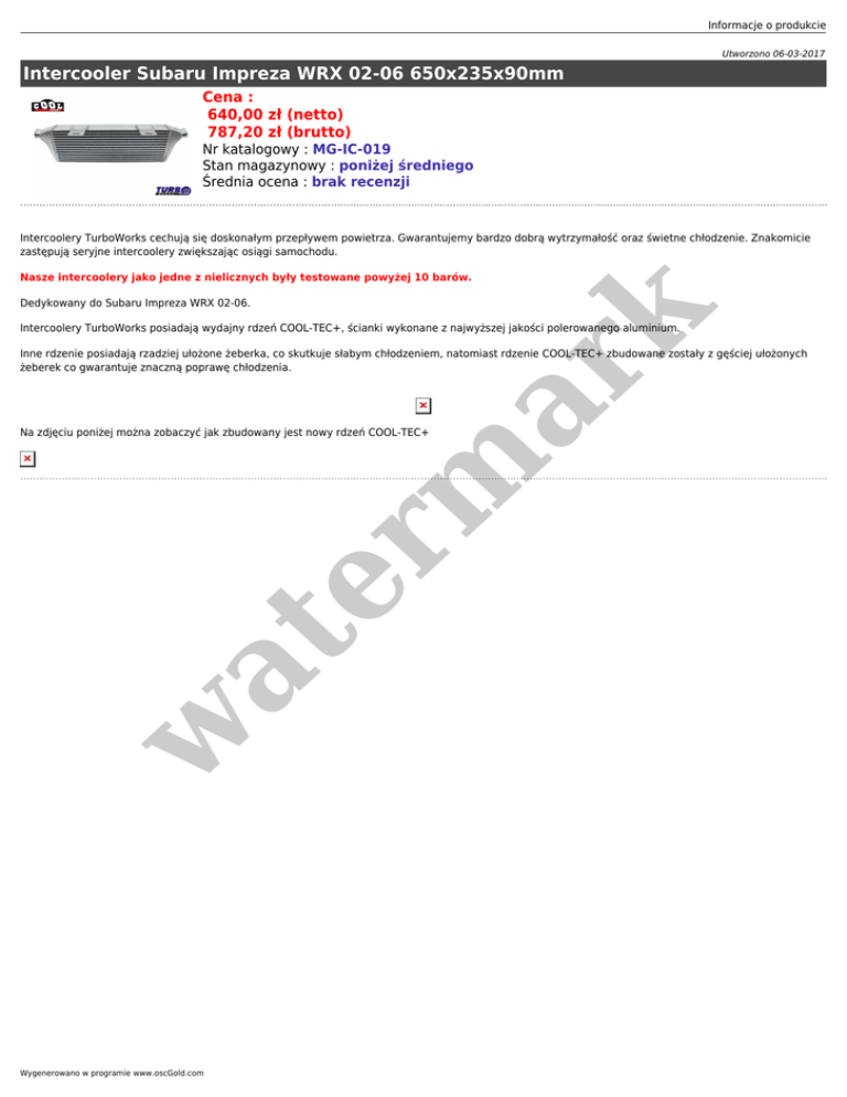 Informacje o produkcie Utworzono 06-03-2017 Intercooler Subaru Impreza WRX 02-06 650x235x90mm Cena : 640,00 zł (netto) 787,20 zł (brutto) Nr katalogowy : MG-IC-019 Stan magazynowy : poniżej średniego Średnia ocena : brak recenzji Intercoolery TurboWorks cechują się doskonałym przepływem powietrza. Gwarantujemy bardzo dobrą wytrzymałość oraz świetne chłodzenie. Znakomicie zastępują seryjne intercoolery zwiększając osiągi samochodu. Nasze intercoolery jako jedne z nielicznych były testowane powyżej 10 barów. er m ar k Dedykowany do Subaru Impreza WRX 02-06. Intercoolery TurboWorks posiadają wydajny rdzeń COOL-TEC+, ścianki wykonane z najwyższej jakości polerowanego aluminium. Inne rdzenie posiadają rzadziej ułożone żeberka, co skutkuje słabym chłodzeniem, natomiast rdzenie COOL-TEC+ zbudowane zostały z gęściej ułożonych żeberek co gwarantuje znaczną poprawę chłodzenia. w at Na zdjęciu poniżej można zobaczyć jak zbudowany jest nowy rdzeń COOL-TEC+ Wygenerowano w programie www.oscGold.com