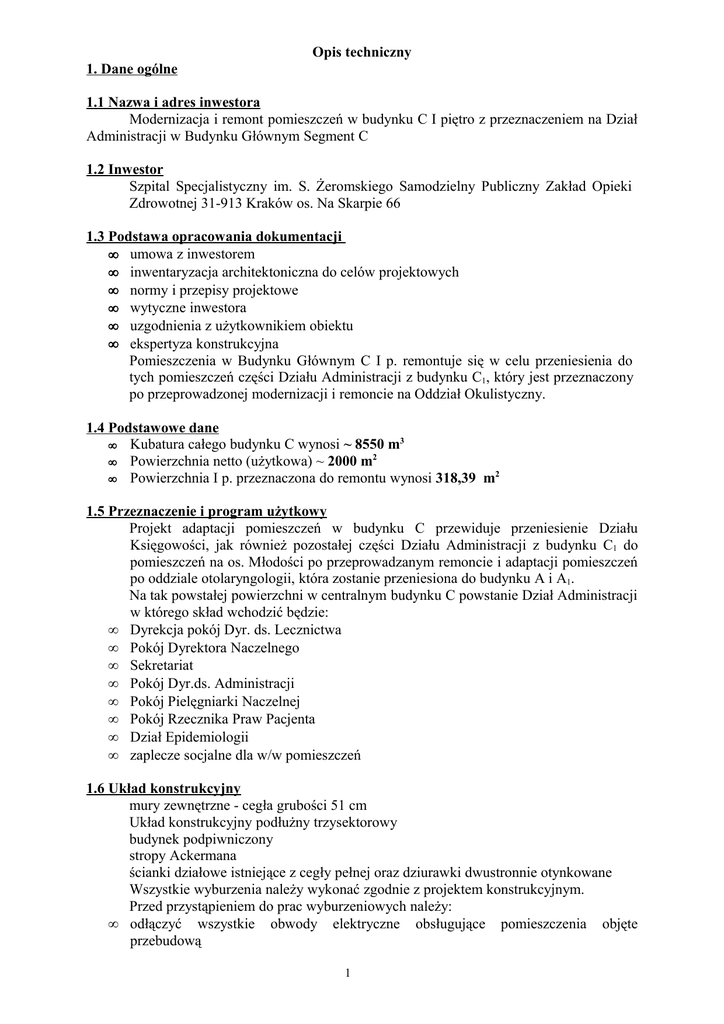 Opis techniczny 1. Dane ogólne 1.1 Nazwa i adres inwestora Modernizacja i remont pomieszczeń w budynku C I piętro z przeznaczeniem na Dział Administracji w Budynku Głównym Segment C 1.2 Inwestor Szpital Specjalistyczny im. S. Żeromskiego Samodzielny Publiczny Zakład Opieki Zdrowotnej 31-913 Kraków os. Na Skarpie 66 1.3 Podstawa opracowania dokumentacji • umowa z inwestorem • inwentaryzacja architektoniczna do celów projektowych • normy i przepisy projektowe • wytyczne inwestora • uzgodnienia z użytkownikiem obiektu • ekspertyza konstrukcyjna Pomieszczenia w Budynku Głównym C I p. remontuje się w celu przeniesienia do tych pomieszczeń części Działu Administracji z budynku C1, który jest przeznaczony po przeprowadzonej modernizacji i remoncie na Oddział Okulistyczny. 1.4 Podstawowe dane • Kubatura całego budynku C wynosi ~ 8550 m3 • Powierzchnia netto (użytkowa) ~ 2000 m2 • Powierzchnia I p. przeznaczona do remontu wynosi 318,39 m2 1.5 Przeznaczenie i program użytkowy Projekt adaptacji pomieszczeń w budynku C przewiduje przeniesienie Działu Księgowości, jak również pozostałej części Działu Administracji z budynku C1 do pomieszczeń na os. Młodości po przeprowadzanym remoncie i adaptacji pomieszczeń po oddziale otolaryngologii, która zostanie przeniesiona do budynku A i A1. Na tak powstałej powierzchni w centralnym budynku C powstanie Dział Administracji w którego skład wchodzić będzie: • Dyrekcja pokój Dyr. ds. Lecznictwa • Pokój Dyrektora Naczelnego • Sekretariat • Pokój Dyr.ds. Administracji • Pokój Pielęgniarki Naczelnej • Pokój Rzecznika Praw Pacjenta • Dział Epidemiologii • zaplecze socjalne dla w/w pomieszczeń 1.6 Układ konstrukcyjny mury zewnętrzne - cegła grubości 51 cm Układ konstrukcyjny podłużny trzysektorowy budynek podpiwniczony stropy Ackermana ścianki działowe istniejące z cegły pełnej oraz dziurawki dwustronnie otynkowane Wszystkie wyburzenia należy wykonać zgodnie z projektem konstrukcyjnym. Przed przystąpieniem do prac wyburzeniowych należy: • odłączyć wszystkie obwody elektryczne obsługujące pomieszczenia objęte przebudową 1 • wykonać stosowne zabezpieczenia w postaci kurtyn odgradzających pomieszczenia remontowane od pozostałej części Szpitala tak, aby zapobiec zapyleniu innych pomieszczeń • wykonać demontaż osprzętu sanitarnego i centralnego ogrzewania • podczas prac wyburzeniowych należy skuć wszystkie posadzki aż do płyty stropowej, skuć wszystkie okładziny ścian oraz zdemontować ostrożnie boazerię na ścianach korytarza Przebicia i wyburzenia ścian nie naruszają konstrukcji budynku, a zaprojektowane ścianki zostały zaprojektowane jako lekkie gr. 10 cm z płyt gipsowo-kartonowych, ognioodpornych EI30 wypełnione wełną mineralną. Ścianki w pomieszczeniach wilgotnych należy wykonać z płyt wodoodpornych. W ścianach z płyt gipsowo-kartonowych, na których wiszą urządzenia sanitarne i pochwyty z odbojami należy zamontować stelaże umożliwiające montaż tych urządzeń. W wc-tach podtynkowe stelaże pod miski ustępowe należy wbudować do wysokości stropów podwieszanych (z wyjątkiem pom. nr 213) Nad otworami drzwiowymi należy wykonać nadproża typu „porotherm” 115x71x1250 mm lub użyć materiały równoważne o parametrach nie gorszych. Dodatkowo nad każdym nadprożem typy „porotherm” należy nadmurować dwie warstwy z cegły pełnej. Istniejące tynki cementowo-wapienne należy skuć i w miarę potrzeby wykonać nowe cementowo-wapienne. Instalacje wod-kan i elektryczną prowadzić w bruzdach, które po ułożeniu instalacji i jej odbiorze należy zamurować. Założyć osłony ościeżnic drzwiowych przeciwuderzeniowe. Na wszystkich narożnikach ścian założyć kątowniki ochronne. 2 2. Rozwiązania architektoniczno-budowlane wykończenie pomieszczeń 2.1 Posadzki Po skuciu starych posadzek i wylewek należy wykonać nowe: W pomieszczeniach „suchych" 5,0 Posadzka (wg specyfikacji na rzutach) na wylewce cement. zbrojonej siatką Warstwa poślizgowa (folia PE) 1 ,0 cm Izolacja akustyczna 2x mata UNITREND gr. 5 mm Paroizolacja (folia PE lub PCV) gr.0,2 mm ok.1,0 cm Gładź cementowa Strop istniejący W pomieszczeniach „mokrych" *Płytki terakota spoinowane elastyczną zaprawą hydrauliczną *Elastyczny klej *Płynna elastyczna folia uszczelniająca +gruntownik 4-5 cm Wylewka cementowa zbrojona siatką ze spadkiem (jeśli występuje kratka ściekowa) Warstwa ochronna (folia PCV) 1,0 cm Izolacja akustyczna 2x mata UNITREND gr. 5 mm Paroizolacja (folia PE lub PCV) gr.0,2 mm ok.1,0 cm Gładź cementowa Strop istniejący * do izolacji należy użyć np.: EUROLAN TG2 - gruntownik SUPERFLEX 1 - gr. 1 mm (zużycie 1,6 kg) m2 Płytki na kleju PLASTIKOL KM_FLEX Spoinowanie CERINOL-FLEX firmy DEITERMANN lub materiały równoważne o parametrach niegorszych niż wymienione Gruntownik wraz z folią uszczelniająca należy wyprowadzić na wys. 50 cm na ściany pomieszczenia. Uwaga ! Rzeczywista grubość wylewki zostanie ustalona na budowie w trakcie robót. Wykładziny PCV należy układać na wylewce samopoziomującej gr.ok.2 mm. 2.2 Tynki wewnętrzne - IV kat. cementowo-wapienne z gładzią gipsową (należy zastosować narożniki ochronne naroży wypukłych|), tynki istniejące należy tylko uzupełnić, 2.3 Podłogi terakota, gres antypoślizgowy z 10 cm cokołem, grupa R10 antypoślizgowości, węzły sanitarne, składzik porządkowy, korytarz, wykładzina rulonowa termozgrzewalna PCV lub kauczukowa na wylewce samopoziomującej 2-5 mm, TARKET „Optima" lub materiał równoważny o parametrach niegorszych niż wymieniony (z wywinięciem 10 cm cokołu na ściany) pokoje biurowe nr 206, 208, 209, 210, 212, wykładzina dywanowa - pokoje biurowe nr 203, 204, 205, 207, 3 Listwy progowe należy stosować tylko na granicy dwóch rodzajów posadzek. 2.4 Malowanie ścian i sufitów farbami autosterylnymi PW1 typ „Sati