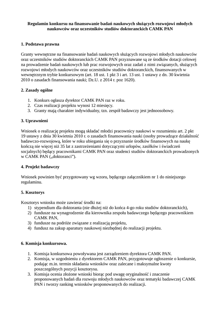 Regulamin konkursu na finansowanie badań naukowych służących rozwojowi młodych naukowców oraz uczestników studiów doktoranckich CAMK PAN 1. Podstawa prawna Granty wewnętrzne na finansowanie badań naukowych służących rozwojowi młodych naukowców oraz uczestników studiów doktoranckich CAMK PAN przyznawane są ze środków dotacji celowej na prowadzenie badań naukowych lub prac rozwojowych oraz zadań z nimi związanych, służących rozwojowi młodych naukowców oraz uczestników studiów doktoranckich, finansowanych w wewnętrznym trybie konkursowym (art. 18 ust. 1 pkt 3 i art. 13 ust. 1 ustawy z dn. 30 kwietnia 2010 o zasadach finansowania nauki; Dz.U. z 2014 r. poz 1620). 2. Zasady ogólne 1. Konkurs ogłasza dyrektor CAMK PAN raz w roku. 2. Czas realizacji projektu wynosi 12 miesięcy. 3. Granty mają charakter indywidualny, tzn. zespół badawczy jest jednoosobowy. 3. Uprawnieni Wniosek o realizację projektu mogą składać młodzi pracownicy naukowi w rozumieniu art. 2 pkt 19 ustawy z dnia 30 kwietnia 2010 r. o zasadach finansowania nauki (osoby prowadzące działalność badawczo-rozwojową, które w roku ubiegania się o przyznanie środków finansowych na naukę kończą nie więcej niż 35 lat z zastrzeżeniami dotyczącymi urlopów, zasiłków i świadczeń socjalnych) będący pracownikami CAMK PAN oraz studenci studiów doktoranckich prowadzonych w CAMK PAN („doktoranci”). 4. Projekt badawczy Wniosek powinien być przygotowany wg wzoru, będącego załącznikiem nr 1 do niniejszego regulaminu. 5. Kosztorys Kosztorys wniosku może zawierać środki na: 1) stypendium dla doktoranta (nie dłużej niż do końca 4-go roku studiów doktoranckich), 2) fundusze na wynagrodzenie dla kierownika zespołu badawczego będącego pracownikiem CAMK PAN, 3) fundusze na podróże związane z realizacją projektu, 4) fundusz na zakup aparatury naukowej niezbędnej do realizacji projektu. 6. Komisja konkursowa. 1. Komisja konkursowa powoływana jest zarządzeniem dyrektora CAMK PAN. 2. Komisja, w uzgodnieniu z dyrektorem CAMK PAN, przygotowuje ogłoszenie o konkursie, podając m.in. termin składania wniosków oraz zalecane i maksymalne kwoty poszczególnych pozycji kosztorysu. 3. Komisja ocenia złożone wnioski biorąc pod uwagę oryginalność i znaczenie proponowanych badań dla rozwoju młodych naukowców oraz tematyki badawczej CAMK PAN i tworzy ranking wniosków proponowanych do realizacji. 4. Komisja może wprowadzać zmiany w proponowanym kosztorysie wniosku. 7. Realizacja badań 1. Ostateczną decyzję o przyznaniu środków finansowych na realizację projektu podejmuje dyrektor CAMK PAN na podstawie rekomendacji Komisji, biorąc pod uwagę kwotę dotacji celowej, o której mowa w art 1. 2. Decyzja o realizacji projektu jest podejmowana po otrzymaniu przez CAMK PAN decyzji o przyznaniu dotacji celowej, o której mowa w art 1. W przypadku odmowy przyznania dotacji przez MNiSW, konkurs zostaje unieważniony. 8. Raport z realizacji projektu 1. Kierownik projektu składa raport roczny z realizacji projektu wg wzoru stanowiącego załącznik nr 2 do niniejszego regulaminu w terminie do 31 stycznia następnego roku. Raport końcowy wg tego samego wzoru składa się w terminie do 30 dni po zakończeniu projektu. 2. Raporty są oceniane przez Komisję konkursową. 3. Decyzję o przyznaniu środków na realizację projektu w kolejnych latach jego trwania podejmuje Dyrektor. Decyzja jest uzależniona od pozytywnej oceny raportu rocznego. Załącznik nr 1 WZÓR WNIOSEK o finansowanie projektu badawczego Tytuł projektu: Kierownik projektu: Okres realizacji (miesiące): Kosztorys: Rok … Rok … Stypendia Wynagrodzenia Aparatura Inne koszty realizacji projektu Suma: Specyfikacja kosztów (wysokość w zł, przeznaczenie): Aparatura badawcza: Inne koszty: Opis projektu (maks. 2 strony) Suma Załącznik nr 2 WZÓR RAPORT z realizacji projektu badawczego 1. DANE OGÓLNE 1) tytuł projektu: 2) kierownik projektu: 2. KOSZTORYS lp. nazwa 1. stypendia 2. wynagrodzenie 3. aparatura 4. inne koszty realizacji 5. RAZEM rok ….... planowane poniesione rok …. planowane OPIS EWENTUALNYCH ROZBIEŻNOŚCI: 3. OPIS MERYTORYCZNY (max 2 strony) poniesione RAZEM planowane poniesione