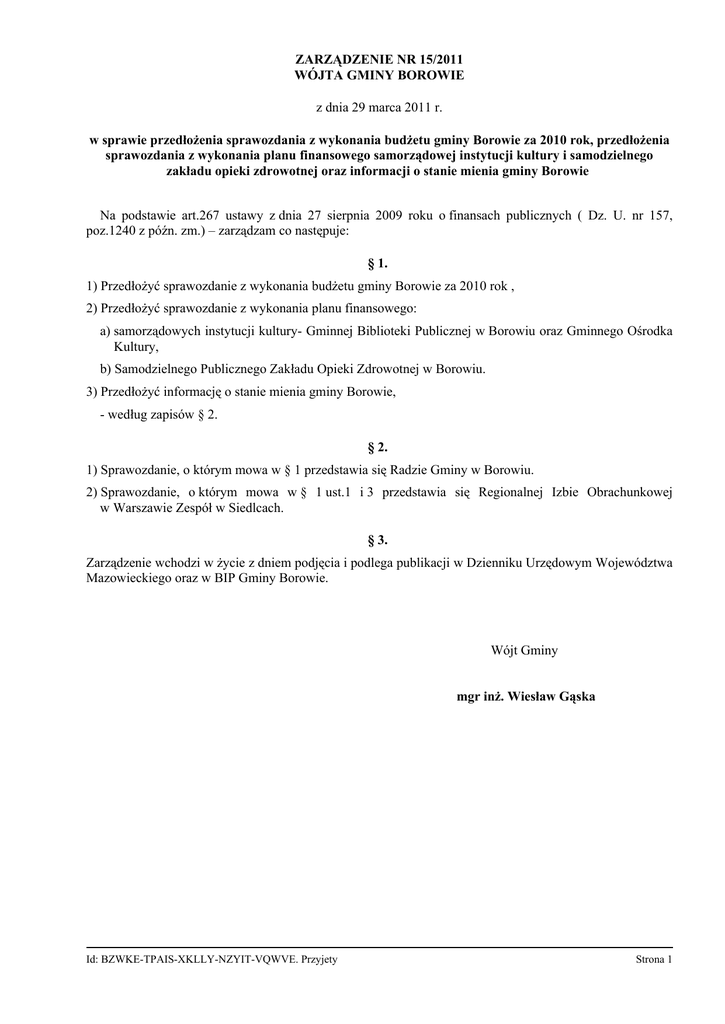 ZARZĄDZENIE NR 15/2011 WÓJTA GMINY BOROWIE z dnia 29