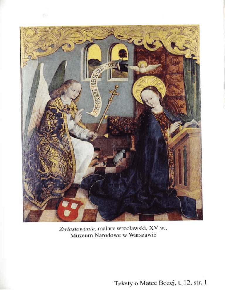 Zwiastowanie, malarz wrocławski, XV w., Muzeum Narodowe w Warszawie Teksty o Matce Bożej, t. 12, str. 1 Wit Stwosz, Boże Narodzenie, kwatera ołtarza Mariackiego, 1477-1489, kościół Mariacki w Krakowie Mistrz Pasji Dominikańskiej, Ucieczka do Egiptu, ok. 1465, kwatera ołtarza głównego z kościoła OO. Dominikanów w Krakowie. Muzeum Narodowe w Krakowie Zdjęcie z krzyża (Opłakiwanie) z kościoła parafialnego w Chomranicach, ok. 1440, Muzeum Diecezjalne w Tarnowie Zaśnięcie Najświętszej Maryi Panny, pocz. XVI w., kościół św. Jakuba Apostoła w Piotrkowie Trybunalskim Wniebowzięcie Najświętszej Maryi Panny, figura z ołtarza głównego kościoła OO. Bernardynów w Warcie Apokaliptyczna Matka Boska z Dzieciątkiem („Obleczona w słońce”), ok. 1450, środkowa część tryptyku z kościoła parafialnego w Przydonicy Madonna sejneńska, XV w., kościół Nawiedzenia Najświętszej Maryi Panny w Sejnach