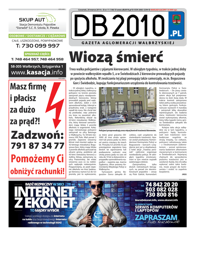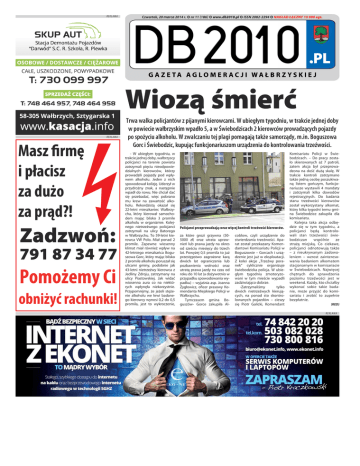 REKLAMA Czwartek, 20 marca 2014 r. nr 11 (186) www.db2010.pl ISSN 2082-2294 NAKŁAD ŁĄCZNY 15 000 egz. DB2010 .PL G A Z E TA A G LO M E R A C J I WA Ł B R Z YS K I E J Wiozą śmierć REKLAMA Masz firmę i płacisz za dużo za prąd?! Trwa walka policjantów z pijanymi kierowcami. W ubiegłym tygodniu, w trakcie jednej doby w powiecie wałbrzyskim wpadło 5, a w Świebodzicach 2 kierowców prowadzących pojazdy po spożyciu alkoholu. W zwalczaniu tej plagi pomagają także samorządy, m.in. Boguszowa Gorc i Świebodzic, kupując funkcjonariuszom urządzenia do kontrolowania trzeźwości. - W ubiegłym tygodniu, w trakcie jednej doby, wałbrzyscy policjanci na terenie powiatu zatrzymali pięciu nieodpowiedzialnych kierowców, którzy prowadzili pojazdy pod wpływem alkoholu. Jeden z nich spowodował kolizję. Uderzył w przydrożny znak, a następnie wpadł do rowu. Nie chciał dać się przebadać, więc pobrano mu krew na zawartość alkoholu. Rekordzistą okazał się 22-letni mieszkaniec Wałbrzycha, który kierował samochodem mając blisko 3 promile alkoholu w organizmie. Kolejnego nietrzeźwego policjanci zatrzymali na ulicy Batorego w Wałbrzychu. To 59-letni kierowca VW Polo. Miał ponad 2 promile. Zapewne wiosenny klimat miał również wpływ na 42-letniego mieszkańca Boguszowa Gorc, który mając blisko 2 promile alkoholu poruszał się ulicami gminy, podobnie jak 43-letni nietrzeźwy kierowca z Jedliny Zdroju, zatrzymany na ulicy Piastowskiej. Jak widać wiosenna aura co na niektórych wpłynęła niekorzystnie. Przypomnijmy, że jeżeli stężenie alkoholu we krwi badanego kierowcy wynosi 0,2 do 0,5 promila, jest to wykroczenie, Policjanci przeprowadzają coraz więcej kontroli trzeźwości kierowców. za które grozi grzywna (505000 zł) oraz utrata uprawnień lub prawa jazdy na okres od sześciu miesięcy do trzech lat. Powyżej 0,5 promila to już przestępstwo zagrożone karą dwóch lat ograniczenia lub pozbawienia wolności oraz utratą prawa jazdy na czas od roku do 10 lat (a dożywotnio w przypadku spowodowania wypadku) – wyjaśnia asp. Joanna Żygłowicz, oficer prasowy Komendanta Miejskiego Policji w Wałbrzychu. Tymczasem gmina Boguszów- Gorce zakupiła Al- coblow, czyli urządzenie do stwierdzania trzeźwości. Aparat został przekazany Komendantowi Komisariatu Policji w Boguszowie – Gorcach i urządzenie jest już w eksploatacji. Z kolei akcje „Trzeźwy poranek” cyklicznie organizuje świebodzicka policja. W ubiegłym tygodniu zmotoryzowani w tym mieście wypadli zadziwiająco dobrze. -Zatrzymaliśmy tylko dwóch nietrzeźwych kierujących, na ponad sto skontrolowanych pojazdów – cieszy się Piotr Galicki, Komendant Komisariatu Policji w Świebodzicach. – Do pracy zostało skierowanych aż 7 patroli, zatem akcja był przeprowadzona na dość dużą skalę. W trakcie kontroli zatrzymano także jedną osobę poszukiwaną listem gończym, funkcjonariusze wystawili 4 mandaty i zatrzymali kilka dowodów rejestracyjnych. Do badania stanu trzeźwości kierowców został wykorzystany alkomat, który kilka tygodni temu gmina Świebodzice zakupiła dla komisariatu. Kolejna taka akcja odbędzie się w tym tygodniu, a policjanci będą kontrolowali stan trzeźwości świebodziczan wspólnie ze strażą miejską. Co ciekawe, policjanci odnotowują także – z nieukrywanym zadowoleniem – wzrost zainteresowania badaniem alkomatem stacjonarnym w komisariacie w Świebodzicach. Najwięcej chętnych do sprawdzenia poziomu trzeźwości jest w weekend. Każdy, kto chciałby wykonać sobie takie badanie, może przyjść do komisariatu i zrobić to zupełnie bezpłatnie. (RED) REKLAMA DB2010 Czwartek, 20 marca 2014 r. www.db2010.pl .PL G A Z E TA A G LO M E R A C J I WA Ł B R Z YS K I E J REKLAMA Co potrafi czwarta władza Zakrzykiwacze prawdy Janusz Bartkiewicz Na samą myśl o Ukrainie i tym wszystkim, co się wokół niej dzieje, łapią mnie mdłości i torsje. A jeszcze na dodatek 18 marca Putin na Kremlu wystąpił i podpisał akt włączenia Krymu do Federacji Rosyjskiej. Występując przed deputowanymi powiedział to, co i jemu, i milionom Rosjan w duszy gra i na sercu leży. Słuchając go miałem wrażenie, że czytał on to, co ja wcześniej wielokrotnie pisałem w rożnych mediach i na różnych spotkaniach mówiłem. Nie spodziewałem się ze strony polskiej – przepraszam za wyrażenie – klasy politycznej jakiejś wyważonej reakcji i komentarzy na to, co Putin powiedział. Ii się nie zawiodłem. Cała ta „klasa”, jak jeden mąż, zarzuciła Putinowi same łgarstwa i co w III RP normalne, nie wskazała na czym owe łgarstwa miały niby polegać. Chyba, że za łgarstwo nasi politycy – mający widać takie same wskazówki od tego samego zegarmistrza – uznali słowa Putina o naruszeniu przez zachodnie demokracje suwerenności takich państw jak Irak, Afganistan, Serbia czy Libia. Więcej nie będę wymieniał, bo musiałbym wymieniać bardzo długu. Wynika z tego, że żadnych aktów agresji nie było, a wszystko co się zdarzyło, działo się na gorącą prośbę władz tych państw, które prawie na kolanach prosiły, aby je obalić lub naruszyć ich integralność terytorialną. Zalew cynicznej obłudy płynącej z polskich mediów nie ma chyba równego od momentu odrodzenia się Polski po czasach zaborów. Od miesięcy chór kłamców nadaje na wszystkich kanałach i falach oraz prawie we wszystkich gazetach i tygodnikach, zagłuszając jakikolwiek głos rozsądku, próbujący wskazać, że na Ukrainie, czy w Rosji, nie jest tak, jak się nam wmawia. Ten chór cyników nie dziwi mnie już tak bardzo, bo wiem, że w kraju wielbiącym okrutnych morderców, nie razi już nikogo fakt, że za Bugiem są oni również traktowani jak bohaterowie. Striłci UPA i nasi żołnierze wyklęci, to w zbyt wielu przypadkach ideowi pobratymcy. Powtarzam, w zbyt wielu przypadkach, co nie oznacza, że wszyscy. Wiem, o czym piszę i mówię, bo osobiści