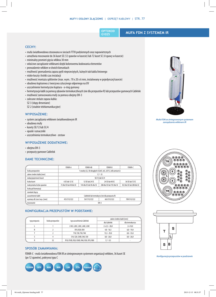 MUFY i OSŁONY ZŁĄCZOWE | Osprzęt kablowy | STR. 77 OPTOKOD G1025 MUFA FDN Z SYSTEMEM IR CECHY: • mufa światłowodowa stosowana w sieciach FTTH podziemnych oraz napowietrznych • umożliwia mocowanie do 36 kaset SE (12 spawów w kasecie) lub 72 kaset SC (4 spawy w kasecie) • minimalny promień gięcia włókna 30 mm • właściwe zarządzanie włóknami dzięki kolorowemu kodowaniu elementów • prowadzenie włókien w dwóch kierunkach • możliwość gromadzenia zapasu pętli nieprzeciętych, luźnych tub kabla liniowego • niskie koszty i krótki czas instalacji • możliwość montażu splitterów (max. wym.: 70 x 20 x 6 mm, instalowany w pojedynczej kasecie) • obudowa kapturowa z tworzywa sztucznego odpornego na UV • uszczelnienie hermetyczne kaptura - o-ring gumowy • hermetyzacja kabli za pomocą rękawów termokurczliwych (nie dla przepustów R) lub przepustów gumowych Cablelok • możliwość zamocowania mufy za pomoca obejmy OH-3 • zalecane stelaże zapasu kabla: SZ-3 (słupy drewniane) SZ-2 (studnie telekomunikacyjne) WYPOSAŻENIE: • system zarządzania włóknem światłowodowym IR • obudowa mufy • kasety SE/12 lub SC/4 • opaski i oznaczniki • uszczelnienia termokurczliwe - zestaw Mufa FDN ze zintegrowanym systemem zarządzania włóknem IR WYPOSAŻENIE DODATKOWE: • obejma OH-3 • przepusty gumowe Cablelok DANE TECHNICZNE: FDNIR-A FDNIR-AB liczba przepustów FDNIR-B FDNIR-C 1 owalny (L), 58 okrągłych (52xR, 2xS, 2xT/S, 2xB zamiast L) zakres średnic kabla [mm] 1,7 - 35 rodzaj/pojemność kaset SE/12 lub SC/4 liczba kaset maksymalna liczba spawów 6 SE lub 12 SC 12 SE lub 24 SC 24 SE lub 48 SC 36 SE lub 72 SC 72 dla SE lub 48 dla SC 144 dla SE lub 96 dla SC 288 dla SE lub 192 dla SC 432 dla SE lub 288 dla SC liczba pól komutacji - standard złączy - uszczelnienie kabli Cablelok lub termokurcz (nie dla przepustu R) wymiary dł./szer./wys. [mm] 455/312/222 561/312/222 mocowanie 663/312/222 789/312/222 OH-3 KONFIGURACJA PRZEPUSTÓW W PODSTAWIE: zakres średnic kabli [mm] typ przepustu liczba przepustów typ uszczelnienia Cablelok L 1 L10C, L20C, L30C, L40C, L50C 2 x 5,5 - 20,0 2 x 10,0 B 2 B10, B20, B30 4,8 - 16,5 6,0 - 19,0 dla Cablelok dla termokurczu T 2 T10, T20, T30, T40 15,5 - 29,0 8,0 - 35,0 S 4 S10, S20, S30D, S40, S50 8,0 - 26,0 8,0 - 26,0 R 52 R10, R10D, R20, R30D, R40, R50, R70, R80 1,7 - 9,5 - SPOSÓB ZAMAWIANIA: FDNIR-C - mufa światłowodowa FDN IR ze zintegrowanym systemem organizacji włókien, 36 kaset SE (po 12 spawów), pokrywa typu C TELEKOM CATV 04 rozdz_Optomer katalog.indd 77 MAN WAN LAN FTTx Konfiguracja przepustów w podstawie Przemysł 2013-12-13 08:31:37