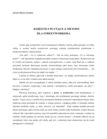 Sylwia Marta Gurbisz KORZYŚCI PŁYNĄCE Z METODY DLA STREETWORKERA Często, gdy rozmawiam z nowo poznanymi osobami i mówię, gdzie pracuję i co robię, widzę w oczach moich rozmówców pewnego rodzaju zaciekawienie pomieszane z niedowierzaniem i zadziwieniem. „Ale jak?... Co ty właściwie robisz??... Tak na ulicy pracujesz…To ty ulicznica jesteś!” – tak najczęściej wygląda początek rozmowy dotyczącej mojej pracy. Rozpoczyna się to zwykle od śmiechu, żartów i małych uszczypliwości, a często swój finał ma w całkiem poważnej dyskusji dotyczącej metody streetworkingu jako pracy oraz stereotypu osoby bezdomnej. Równie charakterystycznym w tego rodzaju rozmowach jest stwierdzenie „…ale wiesz ja tak pracować bym nie mógł/ nie mogła…”. I myślę, że dobrze, gdyż jak w każdej innej pracy i tu, będąc streetworkerem, należy lubić to, co się robi i widzieć sens takiej metody. Jednak cóż jest szczególnego w takiej metodzie pracy, jaką jest streetworking, jakie korzyści i wartości wypływają z niej, patrząc z perspektywy osoby pracującej „na ulicy” i będącej „ulicznicą”. Pierwszą korzyścią, jaka wypływa z pracy w środowisku osób bezdomnych, w miejscach, gdzie przebywają, żyją i mieszkają, jest przełamanie pewnego rodzaju „bariery biurka”. Łączy się to z możliwością nawiązania bardziej szczerych i naturalnych relacji, które stanowią często początek do wejścia w relacje pomocy i podjęcia próby w kierunku zmiany sposobu myślenia osoby „z ulicy, dworca, czy śmietnika”. Tego rodzaju kontakt pozwala łamać stereotypy, jakie tworzą sobie, na swój własny użytek osoby bezdomne, a które dotyczą różnych sfer i sposobów pomocy oraz ich sposobów patrzenia na życie i sytuacje, w jakiej się znaleźli. Osoba prędzej się otwiera, kiedy jest na „swoim terenie”, a kontakt odbywa się na warunkach, które ona ustala, niż wtedy, gdy już z założenia musi dostosować się do zasad panujących w instytucji. W tej metodzie „pomoc”, niejako wychodzi i znajduje osobę, która jej potrzebuje. Pomoc ta nie polega jednak na wyręczaniu osoby przez dostarczanie w miejsce jej przebywania jedzenia czy innych rzeczy. Działanie to ma na celu takie zmotywowanie osoby bezdomnej, aby sama chciała i czuła potrzebę aktywnego poszukiwania pomocy stosownej dla siebie. Oczywiście wcześniej należy dostarczyć koniecznych informacji, gdzie i w jaki sposób szukać tej pomocy. Kolejną korzyścią, która wynika z tej metody, jest czas, jaki można poświęcić poszczególnym osobom. Jedynym ogranicznikiem czasu, jaki spędza się na rozmowie z daną osobą, jest zmiana (lub jej brak), która powinna zachodzić w człowieku, wynikająca z kontaktu z osobą streetworkera. I nie chodzi tu tylko i wyłącznie o to, czy osoba bezdomna trafi do placówki i zniknęła z „ulicy”. Zmianą w tym wypadku jest już choćby poinformowanie o istniejących placówkach i zasadach, na jakich funkcjonują, czy zachęcenie do skorzystania z prysznica lub wymiany ubrań, lub też umożliwienie kontaktu z lekarzem. Brak pośpiechu w kontakcie ma ogromne znaczenie w budowaniu relacji i wymaga od osoby pracującej tą metodą dużej dawki cierpliwości. Streetworker, poza sytuacjami kiedy zagrożone jest zdrowie i/lub życie osoby bezdomnej, nie musi i nie powinien się spieszyć. Właściwie jedynie przy takiej metodzie pracy osoba pomagająca może sobie „pozwolić” na komfort „tracenia czasu” na rozmowę. Elastyczność – to kolejna korzyść wynikająca z pracy tą metodą. Streetworker może i powinien wciąż szukać nowych sposobów pracy i pomagania osobie, którą spotyka. Pozwala to na maksymalne dopasowanie sposobu i oferty pomocy do osoby, która decyduje się skorzystać z tej pomocy, co więcej, sama osoba bezdomna jest tu architektem sposobu, w jaki będzie udzielana ta pomoc, w jakim czasie itp. Elastyczność pracy streetworkera polega również na możliwości doboru takich partnerów do realizacji procesu pomocy, jacy są najbardziej potrzebni na każdym etapie. Pozwala to pracować z różnymi osobami i instytucjami, co z kolei zwraca uwagę różnych środowisk na problem bezdomności i osób bezdomnych. Elastyczność odnosi się również do sposobu realizacji pracy. Streetworker może zaplanować sobie pracę w takich godzinach, aby mieć szansę spotkać osoby bezdomne w tych miejscach, w których przebywają i pracują. Korzyścią wynikającą z pracy metodą streetworkingu, która realizowana jest bardzo konkretnie w naszym przypadku, streetworkerów, jest praca w zespole – jeżeli chodzi o cały zespół czterech streetworkerów pracujących na terenie Trójmiasta, jak również w małym zespole – para gdańska i gdyńska. Praca, szczególnie w małym zespole, pozwala na wymianę informacji na bieżąco, umożliwia dzielenie się spostrzeżeniami i odczuciami związanymi z poszczególnymi osobami i kontaktami. Pozwala nam dawać sobie informacje zwrotne dotyczące naszej pracy oraz daje poczucie bezpieczeństwa, w czasie kiedy sprawdzane są nowe miejsca czy odwiedzane stałe. Praca w parach pozwala również na „bezbolesne” przekazanie kontaktu, w chwili gdy jeden z pracowników nie ma już możliwości oddziaływania na klienta (kontakt z osobą bezdomną jest zindywidualizowany mimo pracy w parze). Również osobie bezdomnej daje to możliwość wyboru tego pracownika, z którym chce rozmawiać podczas konkretnego kontaktu, czy w ogóle. W tych paru akapitach wymieniłam jedynie kilka moim zdaniem najistotniejszych korzyści, jakie wypływają z pracy metodą streetworkingu dla samego streetworkera. Z całą pewnością nie wyczerpuje to tematu, gdyż tak naprawdę korzyści dla osoby pracującej tą metodą należałoby rozpatrywać bardziej indywidualnie, gdyż każdy pracownik na inne aspekty tej metody zwróci głębszą uwagę.