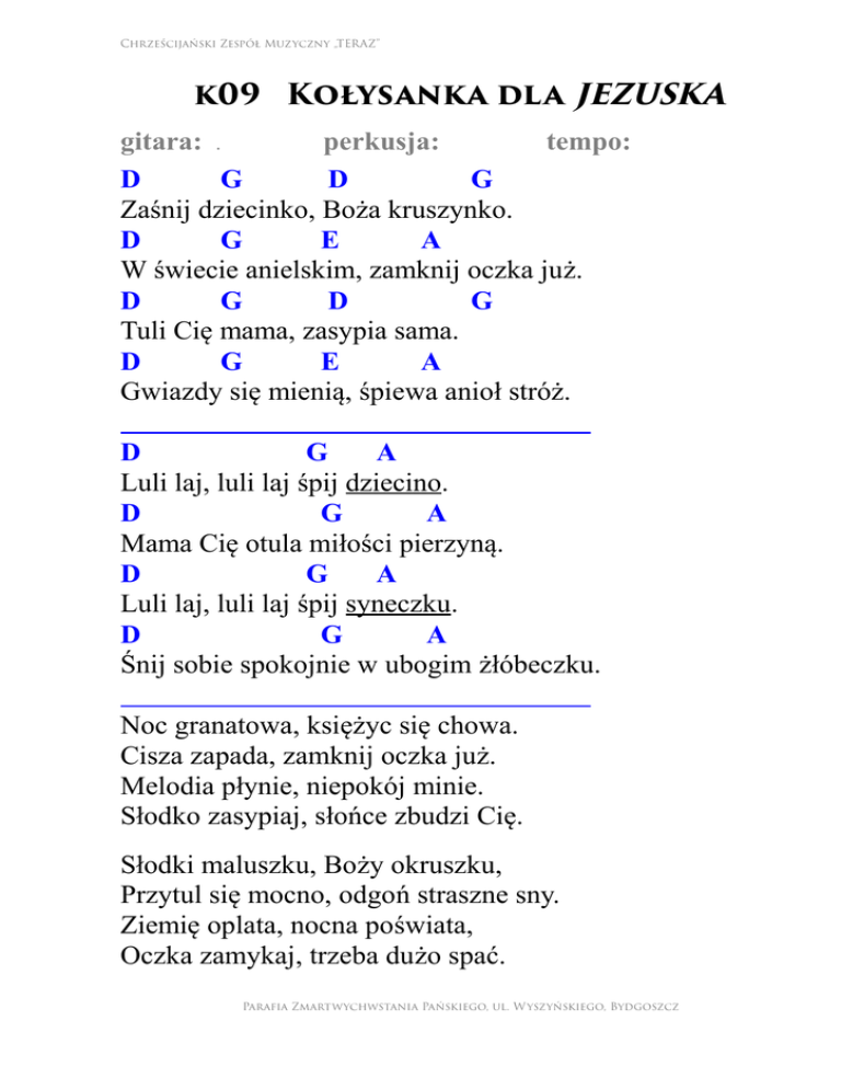 Chrześcijański Zespół Muzyczny „TERAZ” k09 Kołysanka dla JEZUSKA gitara: . perkusja: tempo: D G D G Zaśnij dziecinko, Boża kruszynko. D G E A W świecie anielskim, zamknij oczka już. D G D G Tuli Cię mama, zasypia sama. D G E A Gwiazdy się mienią, śpiewa anioł stróż. D G A Luli laj, luli laj śpij dziecino. D G A Mama Cię otula miłości pierzyną. D G A Luli laj, luli laj śpij syneczku. D G A Śnij sobie spokojnie w ubogim żłóbeczku. Noc granatowa, księżyc się chowa. Cisza zapada, zamknij oczka już. Melodia płynie, niepokój minie. Słodko zasypiaj, słońce zbudzi Cię. Słodki maluszku, Boży okruszku, Przytul się mocno, odgoń straszne sny. Ziemię oplata, nocna poświata, Oczka zamykaj, trzeba dużo spać. Parafia Zmartwychwstania Pańskiego, ul. Wyszyńskiego, Bydgoszcz Chrześcijański Zespół Muzyczny „TERAZ” Parafia Zmartwychwstania Pańskiego, ul. Wyszyńskiego, Bydgoszcz