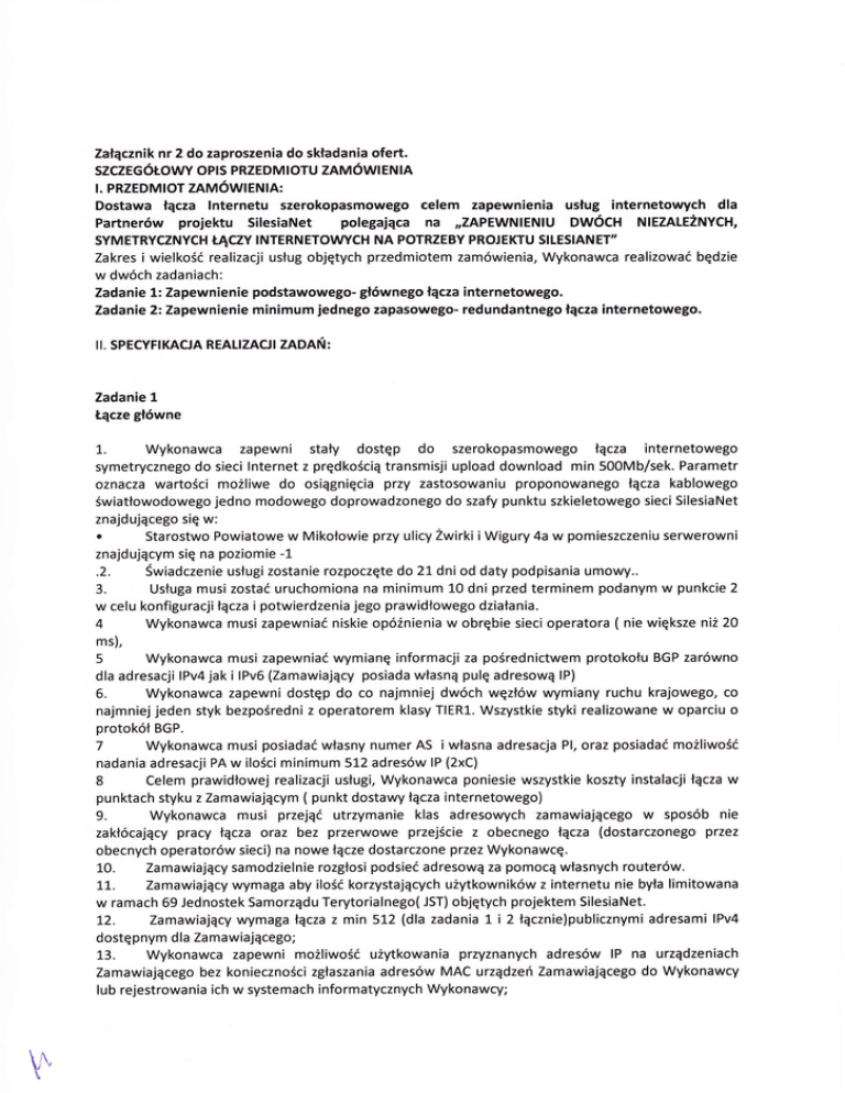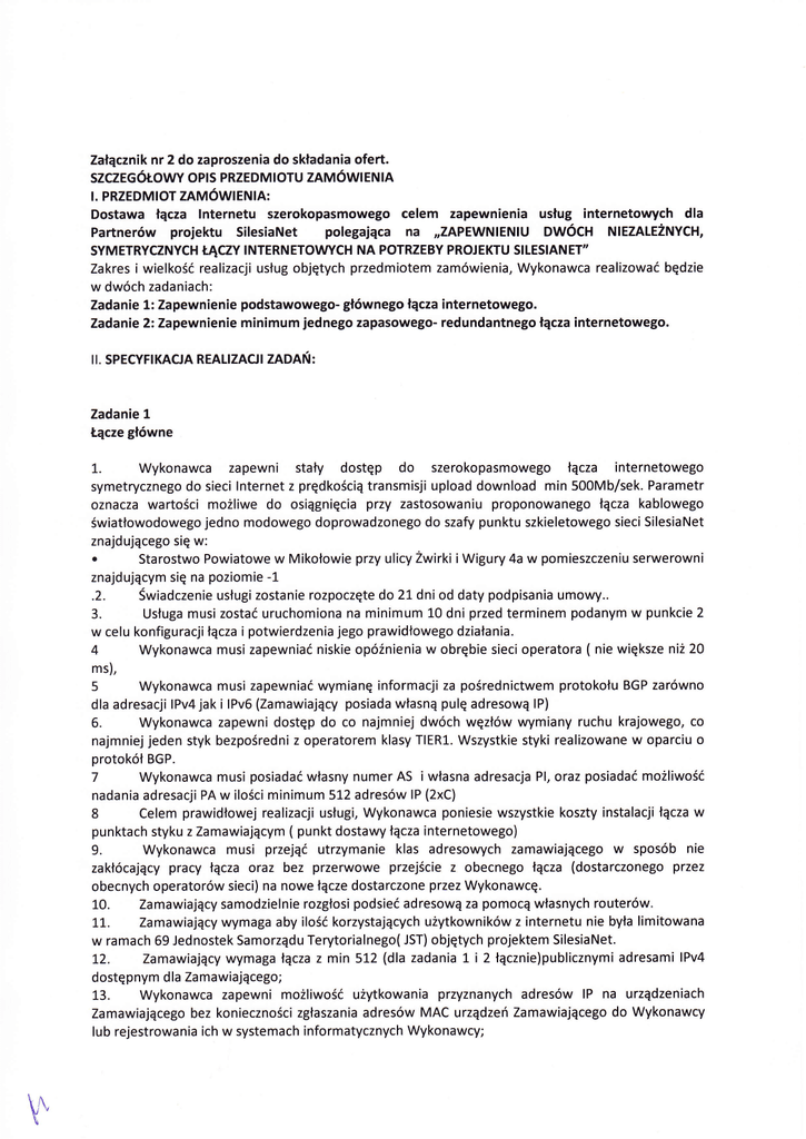 Załącznik nr 2 do zaproszenia do skladania ofert. szczEGóŁoWY oPts PRZEDMloTU ZAMóWIENlA l. PRZEDMloT zAMóWlENlA: Dostawa łącza lnternetu szerokopasmowego celem zapewnienia usług internetowych dla Partnerów projektu SitesiaNet poIegająca na ,,ZAPEWNlENlU DWÓCH NlEzAtEżNYcH, sYMETRYczNYcH ączY |NTERNEToWYCH NA PoTRZEBY PRoJEKTu slLEslANET" Zakres i wielkość realizacji usług objętych przedmiotem zamówienia, Wykonawca realizować będzie w dwóch zadaniach: Zadanie 1: Zapewnienie podstawowego- głównego łącza internetowego. Zadanie 2: Zapewnienie minimum jednego zapasowego- redundantnego łącza internetowego. l l. sPEcYFlKAC'A REALlzAol ZADAŃ: Zadanie 1 Łącze główne Wykonawca zapewni stały dostęp do szerokopasmowego łącza internetowego !. symetrycznego do sieci lnternet z prędkościątransmisji upload download min 500Mb/sek. Parametr oznacza wartości możliwe do osiągnięcia przy zastosowaniu proponowanego łącza kablowego światłowodowegojedno modowego doprowadzonego do szafy punktu szkieletowego sieci SilesiaNet znajdującego się w: . Starostwo Powiatowe w Mikołowie przy ulicy Zwirki i Wigury 4a w pomieszczeniu serwerowni znajdującym się na poziomie -1 .2. Świadczenie usługizostanie rozpoczęte do 21dniod daty podpisania umowy.. 3. Usługa musi zostać uruchomiona na minimum 10 dni przed terminem podanym w punkcie 2 w celu konfiguracji łącza i potwierdzenia jego prawidłowego działania. 4 Wykonawca musi zapewniać niskie opóŹnienia w obrębie siecioperatora ( nie większe niż20 ms), 5 Wykonawca musi zapewniać wymianę informacji za pośrednictwem protokołu BGP zarówno dla adresacji lPv4 jak i |Pv6 (Zamawiający posiada własną pulę adresową lP) Wykonawca zapewni dostęp do co najmniej dwóch węzłów wymiany ruchu krajowego/ co 6. najmniej jeden styk bezpośredni z operatorem klasy TlER1. Wszystkie styki realizowane W oparciu o protokół BGP. 7 Wykonawca musi posiadać własny numer AS i własna adresacja Pl, oraz posiadać możliwość nadania adresacji PA w ilościminimum 512 adresów lP (2xC) Celem prawidłowej realizacji usługi, Wykonawca poniesie wszystkie koszty instalacji łącza w 8 punktach styku z Zamawiającym ( punkt dostawy łącza internetowego) 9. Wykonawca musi przejąć utrzymanie klas adresowych zamawiającego w sposób nie zakłócający pracy łącza oraz bez przerwowe przejście z obecnego łącza (dostarczonego przez obecnych operatorów sieci) na nowe łącze dostarczone przez Wykonawcę. 10' Zamawiający samodzielnie rozgłosi podsieć adresową za pomocą własnych routerów. 1'1'. Zamawiający Wymaga aby ilośćkorzystających użytkowników z internetu nie była limitowana w ramach 69 Jednostek Samorządu Terytorialnego(JST) objętych projektem SilesiaNet. 7Ż. Zamawiający Wymaga lącza z min 512 (dla zadania 1 i 2 łącznie)publicznymi adresami lPv4 dostępnym d la Zamawiającego; 13. Wykonawca zapewni możliwośćużytkowania przyznanych adresów lP na urządzeniach Zamawiającego bez konieczności zgłaszania adresów MAC urządzeń Zamawiającego do Wykonawcy lub rejestrowania ich w systemach informatycznych Wykonawcy; w 1'4. 15. Przepustowośćłącza nie może być osiągnięta dzięki wykorzystaniu overbookingu; Wykonawca dostarczy adresy swoich urządzeń brzegowych celem monitorowania parametrów sieci. Zadanie2 Łącze zapasowe 1. Dostawa łącza internetowego redundantnego (zapasowego) symetrycznego (sieci lnternet) z prędkościątransmisji upload download minimum 5OMb/s . Parametr oznacza wartościmożliwe do osiągnięcia przy zastosowaniu proponowanego łącza kablowego światłowodowegojedno modowego doprowadzonego do dwóch punktów dystrybucyjnych ulokowanych w JST, na terenie Powiatu Mikołowskiego. 2" Lokalizacje punktu łącza zapasowego: 1. Gminna Biblioteka Publiczna Wyry ul. Dąbrowszczaków 54 W serwerowni na poziome +1 3. 4. świadczenie usługizostanie rozpoczęte do 21_ dniod daty podpisania umowy.. Usługa musi zostać uruchomiona na minimum 10 dni przed terminem podanym w punkcie 2 w celu konfiguracji łącza i potwierdzenia jego prawidłowego działania. Wykonawca musi zapewniać niskie opóźnienia w obrębie sieci operatora ( nie większe niż20 5. ms), 6. Wykonawca musi zapewniać wymianę informacji za pośrednictwem protokołu BGP zarówno dla adresacji lPv4 jak i lPv6 (SlLES|ANET posiada własną pulę adresową lP) 7' Celem prawidłowej realizacji usługi, Wykonawca poniesie wszystkie koszty instalacji łącza w punktach styku z Zamawiającym ( punkt dostawy łącza internetowego)' 8. .Wykonawca musi przejąć utrzymanie klas adresowych zamawiającego w sposób nie zakłócający pracy łącza oraz bez przerwowe przejście z obecnego łącza (dostarczonego przez obecnych operatorów sieci) na nowe łącze dostarczone przez Wykonawcę. 9. Zamawiający samodzielnie rozgłosi podsieć adresową za pomocą własnych routerów. 10. Zamawiający Wymaga aby ilośćkorzystających użytkowników z internetu nie była limitowana w ramach 69 Jednostek Samorządu Terytorialnego(JsT)objętych projektem SilesiaNet. IL. Zamawiający Wymaga lączaz min 512 (łącznie dla zadania 1i2) publicznymi adresami lPv4 dostępnym d la Zamawiającego; 12. Wykonawca zapewni możliwośćużytkowania przyznanych adresów lP na urządzeniach Zamawiającego bez konieczności zgłaszania adresów MAC urządzeń Zamawiającego do Wykonawcy lub rejestrowania ich w systemach informatycznych Wykonawcy; 13. Łącze zapasowe doprowadzone do zakończeń sieci muszą być zrealizowane W oparciu o łącze światłowodowe' W wydzielonym włóknie lub paśmie vlan i być całkowicie transparentne dla protokołów protekcji w warstwie 2 oraz3. L4. Łącze zapasowe musi zostać doprowadzone do lokalizacji innej niż łącze główne (inna Gmina). 15. Wykonawca musi zapewnić możliwośćdoprowadzenia łącza zapasowego do dwóch różnych lokalizacji (np. ornontowice i Wyry). Lokalizacje zaproponuje Wykonawca i