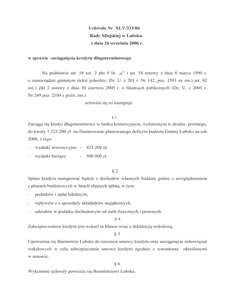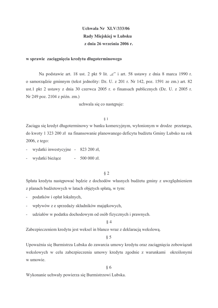 Rady Miejskiej w Lubsku ! !" # " " Na podstawie art. 18 ust. 2 pkt 9 lit. „c” i art. 58 ustawy z dnia 8 marca 1990 r. tekst jednolity: Dz. U. z 201 r. Nr 142, poz. 1591 ze zm.) art. 82 ust.1 pkt 2 ustawy z dnia 30 czerwca 2005 r. o finansach publicznych (Dz. U. z 2005 r. Nr 249 poz. 2104 z §1 ! #$%$%&& " ' ' " ! ( ) Lubsko na rok 2006, z tego: - * +%$%&& " - ! ( * ,&&&&& §2 - .! ! ( ! ( ! - " " - ( " - !' §4 Zabezpieczeniem kredytu jest weksel ! §5 / ( 0 1! ! ! 3 w umowie. §6 4 0 Lubska. 2 § 7 / ( 5 6 7 Ireneusz Kurzawa UZASADNIENIE: / ! ! ( %&&8 +%$%&& #0 - 6 %0 9Mierków ! $0 6 :7 ; ( - ,0 0 80 = >0 3 9< 3 - 8. Rozbudowa cmentarzy ?4 - #,&&& - :&&&&& - %%&&& - #+&&& - %8&&& - %:%&& - %&&&& - ##,&& Padstawowa Nr 1, Nr 2 9- i Gimnazjum - 8&&&& - %&&&& - #,&&& 12. Zakup dokumentacji hali sportowej w Lubsku - %,&&& 13. Wykonanie kortów tenisowych - 14. Dotacje na zadania inwestycyjne - Górzynie #& ## / ( ! ) w tym: OSiR – * ,$,&& " - Lubski Dom Kultury - ,&&&& " - 5 * $&&&& @ 5 $$&&& #$$,&& " ,&&&&& 9 ! ( ' - ! ( ! " " Wydatki te to: 1. Zakup gruntów od Kurii - #,%:$& " 2. Adaptacja lokali na mieszkania socjalne – ul. Kolejowa, Grzei i Górzyn - #%#>%: " $5 - $?+$& " - %,$8+ " - %$#>& " 6. Zakup samochodu DACIA - %?>>+ " 7. Zakup kserokopiarek szt 2 - %%&&& " :7 , A3 ( 9 - 5 0 = % "- B; ( 8. Place zabaw na wsiach - #?$:> " 9. Dokumentacja na wykonanie dróg - #&#+? " - ,&&& " * #$&$+ " #& 7 9 ## A 9 ! ) 9Mierków ! 12. Rozbudowa cmentarzy – mapy - %&&& " #$ C - #8>$: " - 8&&% " 9 14. Zakup przystanków autobusowych 15. Dotacja dla A- 6* 9 * ,&&&& Razem: $ W chwili obecnej kwota ta jest ! ! % 3 ' Gminy. 4 ! w #: 5 #&$ ,&& " D 3 pkt 7, #$$ ,&& @ ! Lubsku przy ul Pokoju 1. 5 ' ( ( ,?$>+%# " %&&8 , ?8, :?> 8 ?:> %%8 3 :8#:8%# " #&&?:&, ( = 5 2 #$%$%&&