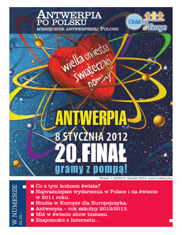 ANTWERPIA PO POLSKU MIESIĘCZNIK ANTWERPSKIEJ POLONII GAZETA BEZPŁATNA n Co z tym końcem świata? n Najważniejsze wydarzenia w Polsce i na świecie m.in.: W NUMERZE Numer 1 (9)/2012, styczeń 2012. n n n n w 2011 roku. Studia w Europie dla Europejczyka. Antwerpia – rok szkolny 2012/2013. Miś w świecie show biznesu. Znajomości z Internetu... 2 Antwerpia po polsku styczeń 2012 o d redakcji Wraz z Nowym Rokiem u nas trochę zmian. Kończymy pewne cykle i wprowadzamy nowe. Zapraszamy na ciekawe artykuły Piotra Neumana i Szymona Malickiego o przepowiedniach Majów na 2012 rok i futurologii. Wszystko co dotyczy przyszłości jest interesujące nie tylko dla nas, ale i dla całej ludzkości. Z pewnością słyszeli już Państwo, ze ten rok ma być „końcem świata”. Mamy nadzieję, że po lekturze tych artykułów pewne tematy staną się bardziej jasne i zrozumiałe. Przygotowaliśmy również krótki przegląd najważniejszych wydarzeń. Ten rok to nie tylko Euro 2012, ale również Letnie Igrzyska Olimpijskie w Londynie, diamentowy jubileusz królowej Elżbiety II i obrączkowe zaćmienie Słońca. Pokusiliśmy się także o zestawienie najważniejszych faktów, które miały miejsce w minionym roku w Polsce i na świecie. W kilku następnych numerach naszej gazety przedstawimy możliwości studiowania w krajach Unii Europejskiej. Wprawdzie jest dopiero styczeń, ale czas biegnie nieubłaganie i z pewnością wszyscy wybierający się na studia myślą co i gdzie studiować. Nie ma granic, a jedynym kryterium dostania się na wymarzoną uczelnię, jest dobra znajomość języka i matura. Mamy nadzieję, że pomożemy młodym czytelnikom dokonać odpowiedniego wyboru. Już po raz trzeci zapraszamy do lektury artykułu Moniki Stawnickiej, w którym w sposób przystępny i interesujący autorka przybliża historię Polski. Czasy to wprawdzie odległe, ale jakim bylibyśmy narodem nie znając swojej przeszłości. Poinformujemy także o pewnych zmianach wprowadzonych przez władze miasta Antwerpia przy zapisywaniu dzieci do szkół i przedszkoli. A że pierwsze rejestracje rozpoczynają się już w styczniu, temat jest jak najbardziej aktualny. Od tego numeru wprowadzamy cykl poświęcony Wielkim Polakom. Będziemy w bardzo ciekawy sposób przybliżać ich sylwetki oraz fakty i wydarzenia z nimi związane. Postaramy się, aby każdą z tych postaci przedstawić w sposób nieco „odbrązowiony” i aby nasi Czytelnicy dowiedzieli się o nich wielu ciekawych i mało znanych rzeczy. Z kolei Magdalena Wawryszuk zaprasza Czytelnikowi do świata internetowych portali społecznościowych i pokazuje, jak umiejętnie i bezpiecznie poruszać się w tym wirtualnym świecie. No i oczywiście nasze stałe rubryki: Rudy poleca, Rafał ze swoim komiksem, Iza Krzysiak z fantastyczną recenzją kolejnej przeczytanej książki i Mariusz Krzysiak ze swoimi nietuzinkowymi przepisami. Zapraszamy serdecznie do lektury, ale przede wszystkim czekamy na Was podczas XX finału Wielkiej Orkiestry Świątecznej Pomocy. Po raz pierwszy w Antwerpii został zarejestrowany sztab i jesteśmy przekonani, że w tym dniu cała Polonia będzie się bawić razem z nami. Im będzie nas więcej, tym puszki z pieniążkami dla małych, chorych dzieci będą cięższe. Wierzymy, że jak zwykle Polonia w Antwerpii nie zawiedzie! Redakcja Sie ma! SKŁAD REDAKCJI: Magdalena Wawryszuk, Izabela Krzysiak, Rafał Kitaszewski, Agata Kocińska KONTAKT: [email protected], tel.: 0489/823803 WYDAWCA: Fundacja „Children of Europe”, www.childrenofeurope.be Redakcja nie ponosi odpowiedzialności za treść reklam i ogłoszeń Jesteśmy na Fecebooku, szukaj: childrenofeurope2011@hotmail .com lub bezpośrednio: http://facebook.com/Children.of.Europe GRAMY TEŻ W ANTWERPII! 8 STYCZNIA, GODZINA 12.00-20.30 sala ATRIUM, Oude Bosuilbaan 54A, 2100 Deurne, Antwerpia Dojazd z centrum: tramwaj 5, autobus 19, 413 ZAPRASZAMY NA JEDYNĄ W SWOIM RODZAJU RODZINNĄ ZABAWĘ! W programie m.in.: ª ciekawe zabawy i konkursy dla małych i dużych ª loterie z nagrodami ª wyjątkowe licytacje ª mnóstwo atrakcji dla dzieci ª koncert dziecięcego zespołu tanecznego z fundacji „Children of Europe” ª występy artystyczne ª polska (i nie tylko) muzyka na żywo – zespół Tom&Jerry ª konkurs karaoke ª i wiele, wiele innych... Przyjdź i przyprowadź znajomych, rodzinę i przyjaciół, pomóżmy razem potrzebującym wcześniakom!!! Więcej informacji na www.wospantw.eu, e-mail: [email protected] 4 Antwerpia po polsku styczeń 2012 Zurenborg To prawdziwa perełka architektury nie tylko w Antwerpii, ale również w Belgii i w Europie. Jej początek to druga połowa ubiegłego stulecia, kiedy to na przełomie lat osiemdziesiątych i dziewięćdziesiątych liczba ludności w Antwerpii gwałtownie wzrosła (z 200.000 w 1885 r. do ponad 300.000 w1900 roku). Port antwerpski stał się największym w Europie. Miasto rozwijało się w błyskawicznym tempie i potrzebne były nowe, mieszkalne dzielnice. Plan rozbudowy miasta i powstania Zurenborg został zatwierdzony w 1882 roku. Każdy kto chciał mieć tutaj dom, musiał wybrać architekta reprezentującego pewien styl. I to właśnie dla architektów budowa Zurenborg stała się okazją do zaprezentowania swoich możliwości. Oprócz wyglądu budynków bardzo istotne były elementy wykończeniowe. Drzwi, okna, ozdoby, ogrodzenia. Dużo niesamowitych żelaznych bram wiele lat później zostało zdemontowanych, aby powstały garaże i miejsca dla samochodów. Aż do XVI wieku dzisiejsze tereny Zurenborg nikogo nie interesowały. Leżały poza miastem i klasyfikowane były jako ziemia rolnicza. Na przełomie XVI i XVII wieku M. Van De Heyden zbudował w tym miejscu dużą farmę która potem przekształcona została w gospodarstwo rolne. Obiekt miał kilku właścicieli a John Cogels w 1866 roku odziedziczył te grunty po ojcu. Cogels był człowiekiem niezwykłym. Patriotą, obrońcą tożsamości Flandr