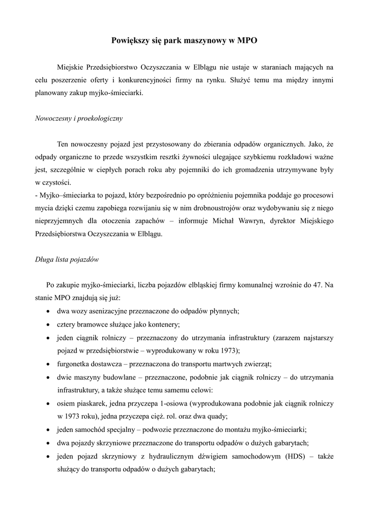 Powiększy się park maszynowy w MPO Miejskie Przedsiębiorstwo Oczyszczania w Elblągu nie ustaje w staraniach mających na celu poszerzenie oferty i konkurencyjności firmy na rynku. Służyć temu ma między innymi planowany zakup myjko-śmieciarki. Nowoczesny i proekologiczny Ten nowoczesny pojazd jest przystosowany do zbierania odpadów organicznych. Jako, że odpady organiczne to przede wszystkim resztki żywności ulegające szybkiemu rozkładowi ważne jest, szczególnie w ciepłych porach roku aby pojemniki do ich gromadzenia utrzymywane były w czystości. - Myjko–śmieciarka to pojazd, który bezpośrednio po opróżnieniu pojemnika poddaje go procesowi mycia dzięki czemu zapobiega rozwijaniu się w nim drobnoustrojów oraz wydobywaniu się z niego nieprzyjemnych dla otoczenia zapachów – informuje Michał Wawryn, dyrektor Miejskiego Przedsiębiorstwa Oczyszczania w Elblągu. Długa lista pojazdów Po zakupie myjko-śmieciarki, liczba pojazdów elbląskiej firmy komunalnej wzrośnie do 47. Na stanie MPO znajdują się już: dwa wozy asenizacyjne przeznaczone do odpadów płynnych; cztery bramowce służące jako kontenery; jeden ciągnik rolniczy – przeznaczony do utrzymania infrastruktury (zarazem najstarszy pojazd w przedsiębiorstwie – wyprodukowany w roku 1973); furgonetka dostawcza – przeznaczona do transportu martwych zwierząt; dwie maszyny budowlane – przeznaczone, podobnie jak ciągnik rolniczy – do utrzymania infrastruktury, a także służące temu samemu celowi: osiem piaskarek, jedna przyczepa 1-osiowa (wyprodukowana podobnie jak ciągnik rolniczy w 1973 roku), jedna przyczepa cięż. rol. oraz dwa quady; jeden samochód specjalny – podwozie przeznaczone do montażu myjko-śmieciarki; dwa pojazdy skrzyniowe przeznaczone do transportu odpadów o dużych gabarytach; jeden pojazd skrzyniowy z hydraulicznym dźwigiem samochodowym (HDS) – także służący do transportu odpadów o dużych gabarytach; dziesięć śmieciarek przeznaczonych do wywozu odpadów stałych; cztery śmieciarki bębnowe – służące także do wywozu odpadów stałych; cztery zamiatarki – przeznaczone do utrzymania infrastruktury oraz jedna zmywarka – przewidziana do tego samego celu. Krótka historia zakupów Poza ciągnikiem rolniczym, przyczepą 1-osiową i maszyną budowlaną z roku 1976 żaden z pojazdów znajdujących się w parku maszynowym Miejskiego Przedsiębiorstwa Oczyszczania w Elblągu nie pochodzi z lat 70. XX wieku. Jeden pojazd – przyczepa cięż. rol. wyprodukowana została w 1980 roku, a kolejny – jedna ze zmywarek – w 1986. Dwadzieścia dwa pojazdy wyprodukowano w latach 90., a siedem – w roku 2000 (z lat 90. i roku 2000 pochodzą jeden wóz asenizacyjny, cztery bramowce, jedna maszyna budowlana, osiem piaskarek, samochód specjalny, dwa pojazdy skrzyniowe, cztery śmieciarki, cztery śmieciarki bębnowe, trzy zamiatarki). Dwanaście pojazdów pochodzi z lat po roku 2000. W tej liczbie znajdują się (w nawiasie rok produkcji): jeden wóz asenizacyjny (2003), furgonetka dostawcza (2005), dwa quady (2013), pojazd z hydraulicznym dźwigiem samochodowym (2006), sześć śmieciarek (2002-2010) i jedna zamiatarka (2005).