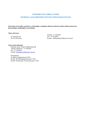 UNIWERSYTET WROCŁAWSKI WYDZIAŁ NAUK HISTORYCZNYCH I PEDAGOGICZNYCH Uprawiane dyscypliny naukowe: archeologia, etnologia, historia, historia sztuki, kulturoznawstwo, muzykologia, pedagogika, psychologia Dane adresowe ul. Szewska 48 50-139 Wrocław Kierownik jednostki Dziekan: prof. dr hab. Elżbieta Kościk Telefon służbowy: 71 3432855 Fax: 71 3432855 E-mail: [email protected] Prodziekani: dr Alina Czapiga docent UWr dr hab. Witold Jakubowski prof. UWr dr hab. Przemysław Wiszewski prof. UWr Telefon: 71 3432855 Fax: 71 3432855 E-mail: [email protected] WEWNĘTRZNY SYSTEM ZAPEWNIENIA JAKOŚCI KSZTAŁCENIA WYDZIAŁ NAUK HISTORYCZNYCH i PEDAGOGICZNYCH UNIWERSYTETU WROCŁAWSKIEGO Definiując wzorzec kształcenia na WNHP wykorzystano: Ekspertyzy nt. zarządzania jakością kształcenia na świecie - analiza metodą desk research sprawdzonych modeli zarządzania jakością kształcenia: model kanadyjski, niemiecki, holenderski, estoński, brytyjski. Raport z badań deficytów kompetencyjnych absolwentów w ramach modelu jakości kształcenia (ZJK) – badanie ankietowe 100 absolwentów Wydziału Prawa Administracji i Ekonomii Uniwersytetu Wrocławskiego (WPAE UWr) oraz opinii 30 pracodawców z Dolnego Śląska zatrudniających absolwentów WPAE. Raport z badań jakościowych dotyczących sylwetki absolwenta UWr wg pracodawców w ramach ZJK (wyniki badań z udziałem 10-15 kluczowych pracodawców z rynku pracy w zakresie określania stopnia przygotowania zawodowego absolwentów UWr). Raport podsumowujący realizację pilotażowego projektu pt. Wrocławski Absolwent, przygotowującego kadry dla sektora usług w aglomeracji wrocławskiej. Dokumenty obowiązujące na Uniwersytecie Wrocławskim i na WNHP UWr w zakresie jakości kształcenia. Rezultaty dwóch seminariów tematycznych (konferencji naukowo-szkoleniowych) skierowanych do pracowników naukowych wydziałów Uniwersytetu Wrocławskiego i środowiska pracodawców. Celem seminariów było m.in. zebranie opinii partnerów na temat oczekiwań dotyczących profilu kompetencyjnego absolwentów UWr oraz opinii odnośnie utrudnień jakie mogą towarzyszyć dostosowaniu efektów kształcenia na UWr i WNHP do potrzeb i wymagań rynku pracy. Tym zagadnieniom poświęcone było seminarium, które odbyło się 29 stycznia 2014 r. Drugie seminarium dla interesariuszy wewnętrznych i zewnętrznych, którego celem była prezentacja Strategii Zarządzania Jakością Kształcenia (SZJK) w Uniwersytecie Wrocławskim, odbyło się 18 września 2014 r. 2 Źródła: Bugaj J., Rybkowski R., Pachnowska B. (2013). Zarządzanie jakością kształcenia. Wybrane wyniki analizy desk research modeli zarządzania jakością kształcenia w 5 krajach (Kanada, Niemcy, Holandia, Estonia, Wielka Brytania). Propozycja modelu strategii Zarządzania Jakością Kształcenia na Uniwersytecie Wrocławskim. Wrocław: IMAS International sp. z o.o. Instytut Badania Rynku i Opinii Społecznej. Bugaj J. (2013). Kształcenie skoncentrowane na studentach tzw. Student Centered Learning (SCL): co się za tym kryje? http://www.nauka.gov.pl/g2/oryginal/2013_05/b806803278fa7cf824c3e1cb6d2d09bf.pdf [15.09.2013]. IPC Instytut Badawczy (2013). Deficyty kompetencyjne absolwentów Wydziału Prawa, Administracji i Ekonomii Uniwersytetu Wrocławskiego w ramach modelu jakości kształcenia (ZJK) – raport z badań. Badanie zrealizowane w ramach projektu Nowoczesny Uniwersytet – kompetencja i jakość w zarządzaniu, realizowanego przez Uniwersytet Wrocławski w zakresie Programu Operacyjnego Kapitał Ludzki, Priorytetu IV, Działania 4.1, Poddziałania 4.1.1 Wzmocnienie potencjału dydaktycznego uczelni, współfinansowanego przez Unię Europejską w ramach Europejskiego Funduszu Społecznego. Wrocław: UWr. Jelonek M., Skrzyńska J. (2010). Jakość kształcenia w szkolnictwie wyższym – uwagi wstępne, w: W. Przybylski, S. Rudnicki, A. Szwed, Ewaluacja jakości dydaktyki w szkolnictwie wyższym. Metody, narzędzia, dobre praktyki. Kraków: Wyższa Szkoła Europejska im. ks. J. Tischnera. Kells Herbert R. (2000). Procesy samooceny. Przewodnik do samooceny w szkolnictwie wyższym. Lublin: Wydawnictwo Uniwersytetu Marii Curie-Skłodowskiej. Król H. (2014). Nowoczesny Uniwersytet – kompetencja i jakość w zarządzaniu. Grupy eksperckie zarządzania jakością kształcenia w UWr. Materiały szkoleniowe. POKL Poddziałanie 4.1.1 Numer umowy UDA-POKL-04.01.0100-109/11-01. Pachnowska B., Haczkowska A. (2014). Sylwetka absolwenta Uniwersytetu Wrocławskiego wg pracodawców. Raport z badań jakościowych. Wrocław: IMAS International sp. z o.o. Instytut Badania Rynku i Opinii Społecznej we Wrocławiu. Perspektywy ludzi młodych na rynku pracy. Raport końcowy. Lublin 2011, http://www.efs.gov.pl/AnalizyRaportyPodsumowania/baza_projektow_badawczych_efs/Documents/PERSPEKTYWY_ LUDZI_MLODYCH_NA_RYNKU_PRACY5122011.pdf [27.08.2013]. Pierwsze kroki na rynku pracy. Międzynarodowe badanie studentów i absolwentów. Deloitte, http://www.deloitte.com/assets/DcomPoland/Local%20Assets/Documents/Raporty,%20badania,%20rankingi/pl_Deloitte_PierwszeKrokiNaRynkuPracy_201 3_1.pdf [25.07.2014] Raport z badań w projekcie Uczelnia Przyjazna Pracodawcom. Warszawa: Instytut Pracy i Spraw Socjalnych, Dialog sp. z o.o. Rozporządzenie Ministra Nauki i Szkolnictwa Wyższego z dnia 2 listopada 2011 r. w sprawie Krajowych Ram Kwalifikacji dla Szkolnictwa Wyższego (Dz. U. Nr 253, poz. 1520). Strategia rozwoju Uniwersytetu Wrocławskiego 2013 – 2020, Załącznik do Uchwały Nr 100/2013 Senatu Uniwersytetu Wrocławskiego z dnia 26 czerwca 2013 r. du Vall M. i zespół (2011). Modele zarządzania uczelniami w Polsce. Raport końcowy. Kraków: Centrum Badań nad Szkolnictwem Wyższym Uniwersytetu Jagiellońskiego. Wiktorska-Święcka A., Buczkowska D., Oleniacz-Czajka E., Modrzejewska-Krupa M. (2011). Wrocławski Absolwent. Program przygotowania kadr dla nowoczesnego sektora usług w aglomeracji wrocławskiej. Raport podsum