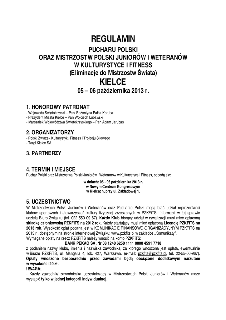 REGULAMIN PUCHARU POLSKI ORAZ MISTRZOSTW POLSKI JUNIORÓW I WETERANÓW W KULTURYSTYCE I FITNESS (Eliminacje do Mistrzostw Świata) KIELCE 05 – 06 października 2013 r. 1. HONOROWY PATRONAT - Wojewoda Świętokrzyski – Pani Bożentyna Pałka-Koruba - Prezydent Miasta Kielce – Pan Wojciech Lubawski - Marszałek Województwa Świętokrzyskiego – Pan Adam Jarubas 2. ORGANIZATORZY - Polski Związek Kulturystyki, Fitness i Trójboju Siłowego - Targi Kielce SA 3. PARTNERZY 4. TERMIN I MIEJSCE Puchar Polski oraz Mistrzostwa Polski Juniorów i Weteranów w Kulturystyce i Fitness, odbędą się: w dniach: 05 - 06 października 2013 r. w Nowym Centrum Kongresowym w Kielcach, przy ul. Zakładowej 1. 5. UCZESTNICTWO W Mistrzostwach Polski Juniorów i Weteranów oraz Pucharze Polski mogą brać udział reprezentanci klubów sportowych i stowarzyszeń kultury fizycznej zrzeszonych w PZKFiTS. Informacji w tej sprawie udziela Biuro Związku (tel. 022 550 09 67). Każdy Klub biorący udział w rywalizacji musi mieć opłaconą składkę członkowską PZKFiTS na 2012 rok. Każdy startujący musi mieć opłaconą Licencję PZKFiTS na 2013 rok. Wysokość opłat podana jest w KOMUNIKACIE FINANSOWO-ORGANIZACYJNYM PZKFITS na 2013 r., dostępnym na stronie internetowej Związku: www.pzkfits.pl w zakładce „Komunikaty”. Wymagane opłaty na rzecz PZKFiTS należy wnosić na konto PZKFiTS: BANK PEKAO SA, Nr 08 1240 6250 1111 0000 4591 7718 z podaniem nazwy klubu, imienia i nazwiska zawodnika, za którego wnoszona jest opłata, ewentualnie w Biurze PZKFiTS, ul. Mangalia 4, lok. 427, Warszawa. (e-mail: [email protected], tel. 22-55-00-967). Opłaty wnoszone bezpośrednio przed zawodami będą obciążone dodatkowym narzutem w wysokości 20 zł. UWAGA: - Każdy zawodnik/ zawodniczka uczestniczący w Mistrzostwach Polski Juniorów i Weteranów może wystąpić tylko w jednej kategorii indywidualnej. - Każdy zawodnik/ zawodniczka uczestniczący w Pucharze Polski może wystąpić tylko w jednej kategorii indywidualnej. - Dopuszcza się start zawodnika zarówno w Mistrzostwach Polski Juniorów i Weteranów oraz Pucharze Polski, po uiszczeniu odrębnej opłaty startowej. 6. ZGŁOSZENIA Zgłoszenia imienne startujących należy nadsyłać na adres: [email protected] oraz [email protected] do dnia 27 września 2013 r. KORZYSTAJĄC Z ZAMIESZCZONEGO FORMULARZA ZGŁOSZENIA W zgłoszeniu każdy zawodnik lub zawodniczka musi podać: - imię i nazwisko, - dokładną datę urodzenia - klub/ stowarzyszenie zrzeszone w PZKFiTS, w którego barwach startuje - kategorię startową i zawody, w których zamierza wystartować wraz z potwierdzeniem dokonania opłaty wpisowego. Kwotę z dokładnym wyszczególnieniem nazwiska zawodnika (w polu: temat / tytułem) i dopiskiem „PP” lub „MPJiW” należy wpłacić na konto: 22 1750 1110 0000 0000 0568 3537 z dopiskiem: KULTURYSTYKA Obowiązuje wpisowe w wysokości: - Mistrzostwa Polski Juniorów i Weteranów: 50 zł od zawodniczki / zawodnika, - Puchar Polski: 60 zł od zawodniczki / zawodnika, - Kulturyści niepełnosprawni na wózkach zwolnieni są z opłaty wpisowego. W przypadku zgłoszenia się zawodnika w dniu weryfikacji bez wcześniejszego zgłoszenia pisemnego i wpłaty wpisowego na podane konto, wpisowe obciążone jest dodatkowym narzutem w wysokości 20 zł. Wpisowe nie podlega zwrotowi w przypadku: - negatywnej weryfikacji, - rezygnacji zawodnika ze startu po weryfikacji, - spóźnienia się zawodnika na start swojej kategorii. 7. PRZYJAZD I ZAKWATEROWANIE Uczestnicy Mistrzostw Polski Juniorów i Weteranów przyjeżdżają w dniu 4 października (piątek) i zgłaszają się do Biura Zawodów, które będzie czynne w Hotelu ARKADIA, ul. Urzędnicza 13, Kielce, w godzinach 16:00 – 18:00. Uczestnicy Pucharu Polski przyjeżdżają w dniu 6 października (niedziela) i zgłaszają się do Biura Zawodów, które będzie czynne od godz. 9:00 we wskazanym pomieszczeniu w Nowym Centrum Kongresowym w Kielcach, przy ul. Zakładowej 1. Uczestnicy sami rezerwują sobie noclegi w hotelach. Polecane hotele to: 1. Hotel ARKADIA, ul. Urzędnicza 13, 25-729 Kielce, www.hotelkielce.pl 2. Pensjonat Biesiada Świętokrzyska, ul. Łódzka 247, 25-672 Kielce http://e-nocleg.pl/nocleg,biesiada,swietokrzyska.html tel. 41- 345 51 50 tel. 504 432 090 8. WERYFIKACJA ZAWODNIKÓW Weryfikacja uczestników Mistrzostw Polski Juniorów i Weteranów odbędzie się 4 października 2013 r. (piątek) w godz. 18:00 – 20:00 w Hotelu ARKADIA, w kolejności zgodnej z planowanym programem zawodów. Weryfikacja uczestników Pucharu Polski odbędzie się 6 października 2013 r. (niedziela) w godz. 10:00 – 11:00 we wskazanym pomieszczeniu w Nowym Centrum Kongresowym w Kielcach, przy ul. Zakładowej 1. w kolejności zgodnej z planowanym programem zawodów. Kierownicy ekip powinni sprawdzić przed wyjazdem na zawody, czy ich zawodnicy prezentują odpowiednią formę startową i czy są właściwie przygotowani do zawodów od strony estetycznej. Komisja sędziowska może w trakcie weryfikacji nie dopuścić do startu zawodnika / zawodniczki nieprzygotowanych do występu lub niebędących w odpowiedniej formie startowej. Zawodnicy i zawodniczki stają do weryfikacji w stroju startowym do pierwszej rundy oceny sylwetki. Zawodnicy startują na własną odpowiedzialność. Zobowiązani są posiadać: - dokument tożsamości ze zdjęciem, zawierający dokładną datę urodzenia, - własną Licencję Zawodnika PZKFiTS opłaconą na 2013 r. (lub potwierdzenie dokonania opłaty licencyjnej), - własną Kartę Zawodnika PZKFiTS, - zaświadczenie lekarskie, pozwalające na start w zawodach lub aktualną Książeczkę Zdrowia Sportowca - dowód wniesienia opłaty startowej. Zawodnicy zobowiązani są posiadać ze sobą stroje startowe do wszystkich rund oraz płytę CD z nagraniem do programu dowolnego. W przypadku nagrania na płycie CD, należy posiadać także rezerwowe nagranie. W przypadku złego stanu techniczne