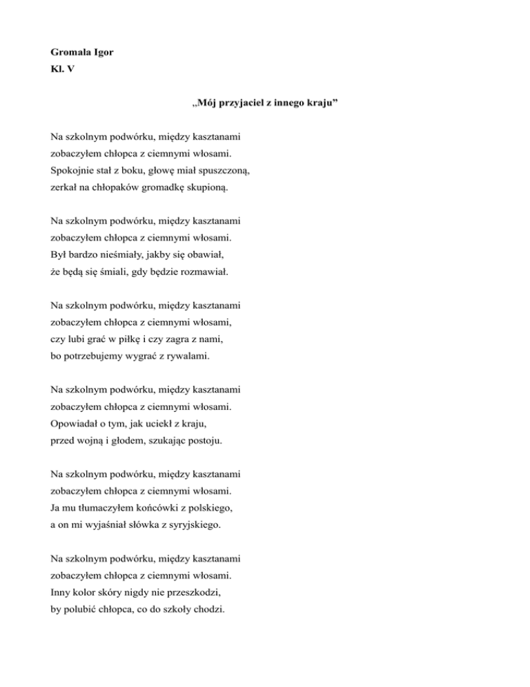 Gromala Igor Kl. V „Mój przyjaciel z innego kraju” Na szkolnym podwórku, między kasztanami zobaczyłem chłopca z ciemnymi włosami. Spokojnie stał z boku, głowę miał spuszczoną, zerkał na chłopaków gromadkę skupioną. Na szkolnym podwórku, między kasztanami zobaczyłem chłopca z ciemnymi włosami. Był bardzo nieśmiały, jakby się obawiał, że będą się śmiali, gdy będzie rozmawiał. Na szkolnym podwórku, między kasztanami zobaczyłem chłopca z ciemnymi włosami, czy lubi grać w piłkę i czy zagra z nami, bo potrzebujemy wygrać z rywalami. Na szkolnym podwórku, między kasztanami zobaczyłem chłopca z ciemnymi włosami. Opowiadał o tym, jak uciekł z kraju, przed wojną i głodem, szukając postoju. Na szkolnym podwórku, między kasztanami zobaczyłem chłopca z ciemnymi włosami. Ja mu tłumaczyłem końcówki z polskiego, a on mi wyjaśniał słówka z syryjskiego. Na szkolnym podwórku, między kasztanami zobaczyłem chłopca z ciemnymi włosami. Inny kolor skóry nigdy nie przeszkodzi, by polubić chłopca, co do szkoły chodzi.