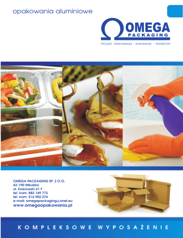 opakowania aluminiowe PROJEKT OPAKOWANIA WYKONANIE TRANSPORT OMEGA PACKAGING SP. Z O.O. 43-190 Miko³ów ul. Koœciuszki 61 F tel. kom. 882 149 772 tel. kom. 516 902 274 e-mail: [email protected] www.omegaopakowania.pl K O M P L E K S O W E W Y P O S A ¯ E N I E O F I R M I E Nasza firma ma na celu w pe³ni zadowoliæ ka¿dego klienta oferuj¹c mu profesjonaln¹ obs³ugê i doradztwo w wyborze odpowiedniego opakowania. Dziêki wieloletniej pracy, systematycznemu poszerzaniu wiedzy i wspó³pracy z dostawcami renomowanych marek jesteœmy w stanie zaoferowaæ klientom kompleksow¹ obs³ugê i atrakcyjne ceny oferowanych produktów. jednak kluczowym kierunkiem naszej firmy jest produkcja opakowañ z tektury dziêki której nasi klienci maj¹ mo¿liwoœæ tworzenia indywidualnych wzorów opakowañ - takich aby wyró¿nia³y ich na rynku. Produkujemy opakowania z tektury falistej 3-warstwej, 5-warstwowej oraz litej. Zaopatrujemy liczne firmy bran¿y spo¿ywczej w opakowania cukiernicze, opakowania gastronomiczne oraz opakowania dañ na wynos. Dla wygody sta³ych klientów towar dostarczamy w³asnym transportem lub klient ma mo¿liwoœæ odbioru osobistego. Wychodz¹c naprzeciw oczekiwaniom najbardziej wymagaj¹cych klientów, zapewniamy tak¿e wykonywanie indywidualnych projektów nadruków pozwalaj¹cych na tworzenie dobrego wizerunku firmy oraz daj¹cych szansê na wyró¿nienie siê pod wzglêdem estetycznym. Nadruki realizujemy na wiêkszoœci oferowanych przez nas opakowaniach z papieru, kartonu, folii, plastiku oraz styropianu. N A S Z Y M I A T U T A M I S ¥: · Produkcja opakowañ z tektury · Indywidualne nadruki na opakowaniach ju¿ od 50 sztuk · krótki czas realizacji zamówieñ indywidualnych · szeroki asortyment standardowych opakowañ jednorazowych · niezmienn¹ jakoœæ oferowanych produktów · mo¿liwoœæ bezpoœredniego odbioru towaru z magazynu lub dostawa do klienta · dogodne warunki wspó³pracy handlowej obs³uga klienta: tel. 882 149 772, tel. 516 902 274 O P A K O W A N I A A L U M I N I O W E Foremki i opakowania aluminiowe nale¿¹ do grupy uniwersalnych opakowañ ¿ywnoœci. S¹ lekkie a zarazem sztywne co pozwala znakomicie chroniæ artyku³y spo¿ywcze przed deformacj¹ lub uszkodzeniem. Dziêki odpornoœci na wysok¹ temperaturê doskonale nadaj¹ siê do wypieku wyrobów miêsnych i cukierniczych. Foremki i opakowania aluminiowe s¹ wyj¹tkowo praktyczne podczas procesu produkcji oraz serwowania artyku³ów spo¿ywczych, bowiem formowanie, wypiek, zamra¿anie i przechowywanie gotowego wyrobu mo¿e siê odbywaæ w jednym pojemniku. patera aluminiowa ma³a wymiary 350x245 pakowane 10 szt w zgrzewce, 100 szt w kartonie patera aluminiowa œrednia wymiary 425x288 pakowane 10szt w zgrzewce, 100szt w kartonie patera aluminiowa du¿a wymiary 547x360 pakowane 10 szt w zgrzewce, 60 szt w kartonie foremka aluminiowa R-28 wymiary 236x102x50 pojemnoœæ 850ml pakowane 50 szt w zgrzewce, 1050 szt w kartonie foremka aluminiowa R-42 wymiary 207x87x54 pojemnoœæ 575ml pakowane 100 szt w zgrzewce, 1900 szt w kartonie obs³uga klienta: tel. 882 149 772, tel. 516 902 274 O P A K O W A N I A A L U M I N I O W E foremka aluminiowa X-2 wymiary 210x120x70 pojemnoœæ 1000ml pakowane 100 szt w zgrzewce, 1400 szt w kartonie foremka aluminiowa R52 + przykrywka wymiary 200x120x47 pojemnoœæ 780ml pakowane 100 szt w zgrzewce, 1000 szt w kartonie foremka aluminiowa R54 + przykrywka wymiary 200x120x47 pojemnoœæ 685 ml pakowane 100 szt w zgrzewce, 1000 szt w kartonie foremka aluminiowa GA2 wymiary 527x325x67 pojemnoœæ 8500 ml pakowane 50 szt w kartonie foremka aluminiowa GA3 wymiary 324x263x60 pojemnoœæ 3600 ml pakowane 150 szt w kartonie foremka aluminiowa GA4 wymiary 324x264x102 pojemnoœæ 5200ml pakowane 100 szt w kartonie tacka aluminiowa na grilla ma³a wymiary 280x216x15 pakowane 100szt w kartonie tacka aluminiowa na grilla du¿a wymiary 344x325x24 pakowane 5 szt w zgrzewce, 90 zgrzewek w kartonie obs³uga klienta: tel. 882 149 772, tel. 516 902 274