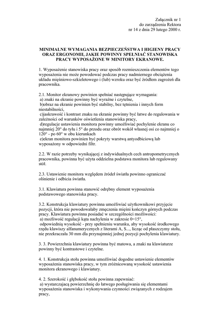 Załącznik nr 1 do zarządzenia Rektora nr 14 z dnia 29 lutego 2000 r. MINIMALNE WYMAGANIA BEZPIECZEŃSTWA I HIGIENY PRACY ORAZ ERGONOMII, JAKIE POWINNY SPEŁNIAĆ STANOWISKA PRACY WYPOSAŻONE W MINITORY EKRANOWE. 1. Wyposażenie stanowiska pracy oraz sposób rozmieszczenia elementów tego wyposażenia nie może powodować podczas pracy nadmiernego obciążenia układu mięśniowo-szkieletowego i (lub) wzroku oraz być źródłem zagrożeń dla pracownika. 2.1. Monitor ekranowy powinien spełniać następujące wymagania: a) znaki na ekranie powinny być wyraźne i czytelne, b)obraz na ekranie powinien być stabilny, bez tętnienia i innych form niestabilności, c)jaskrawość i kontrast znaku na ekranie powinny być łatwe do regulowania w zależności od warunków oświetlenia stanowiska pracy, d)regulacje ustawienia monitora powinny umożliwiać pochylenie ekranu co najmniej 20° do tyłu i 5° do przodu oraz obrót wokół własnej osi co najmniej o 120° - po 60° w obu kierunkach e)ekran monitora powinien być pokryty warstwą antyodbiciową lub wyposażony w odpowiedni filtr. 2.2. W razie potrzeby wynikającej z indywidualnych cech antropometrycznych pracownika, powinna być użyta oddzielna podstawa monitora lub regulowany stół. 2.3. Ustawienie monitora względem źródeł światła powinno ograniczać olśnienie i odbicia światła. 3.1. Klawiatura powinna stanowić odrębny element wyposażenia podstawowego stanowiska pracy. 3.2. Konstrukcja klawiatury powinna umożliwiać użytkownikowi przyjęcie pozycji, która nie powodowałaby zmęczenia mięśni kończyn górnych podczas pracy. Klawiatura powinna posiadać w szczególności możliwości: a) możliwość regulacji kąta nachylenia w zakresie 0=15°, odpowiednią wysokość - przy spełnieniu warunku, aby wysokość środkowego rzędu klawiszy alfanumerycznych z literami A, S..., licząc od płaszczymy stołu, nie przekraczała 30 mm dla przynajmniej jednej pozycji pochylenia klawiatury. 3. 3. Powierzchnia klawiatury powinna być matowa, a znaki na klawiaturze powinny być kontrastowe i czytelne. 4. 1. Konstrukcja stołu powinna umożliwiać dogodne ustawienie elementów wyposażenia stanowiska pracy, w tym zróżnicowaną wysokość ustawienia monitora ekranowego i klawiatury. 4. 2. Szerokość i głębokość stołu powinna zapewniać: a) wystarczajacą powierzchnię do łatwego posługiwania się elementami wyposażenia stanowiska i wykonywania czynności związanych z rodzajem pracy, ustawienie klawiatury z zachowaniem odległości nie mniejszej niż 100 mm między klawiatura a przednią krawędzią stołu, ustawienie elementów wyposażenia w odpowiedniej odległości od pracownika, to jest w zasięgu jego kończyn górnych, bez konieczności przyjmowania wymuszonych pozycji. 4. 3. Wysokość stołu oraz siedziska krzesła powinna być taka, aby zapewniała: a) naturalne położenie kończyn górnych przy obsłudze klawiatury, z zachowaniem co najmniej kata prostego między ramieniem i przedramieniem, odpowiedni kąt obserwacji ekranu monitora w zakresie 20°+50° w dół (licząc od Gnu poziomej na wysokości oczu pracownika do linii poprowadzonej od jego oczu do środka ekranu), przy czym górna krawędź ekranu monitora nie powinna znajdować się powyżej oczu pracownika, odpowiednią przestrzeń do umieszczenia nóg pod blatem stołu. 4. 4. Powierzchnia blatu stołu powinna być matowa, najlepiej barwy jasnej. 5. 1. Krzesło stanowiące wyposażenie stanowiska pracy powinno posiadać: a) dostateczną stabilność, przez wyposażenie go w podstawę co najmniej pięciopodporową z kółkami jezdnymi, b) wymiary oparcia i siedziska, zapewniające wygodną pozycję ciała i swobodę ruchów, regulację wysokości siedziska w zakresie 400+500 mm, licząc od podłogi, d) regulację wysokości oparcia oraz regulację pochylenia oparcia w zakresie: 5° do przodu i 30° do tyłu, e) wyprofilowanie płyty siedziska i oparcia odpowiednie do naturalnego wygięcia kręgosłupa i odcinka udowego kończyn dolnych, f) możliwość obrotu wokół osi pionowej o 360°, g) podłokietniki. 5. 2. Mechanizmy relacji wysokości siedziska i pochylenia oparcia powinny być łatwo dostępne i proste w obsłudze oraz tak usytuowane, aby regulację można było wykonywać w pozycji siedzącej. 6. 1. Jeśli przy pracy istnieje konieczność korzystania z dokumentów, stanowisko pracy należy wyposażyć w uchwyt na dokument, posiadający regulację ustawienia wysokości, pochylenia oraz odległości od pracownika. 6. 2. Uchwyt na dokument powinien znajdować się przed pracownikiem między ekranem monitora i klawiatura- lub w innym miejscu - w pozycji minimalizującej uciążliwe ruchy głowy i oczu. 7. 1. Na życzenie pracownika, a takie gdy wysokość krzesła uniemożliwia pracownikowi płaskie, spoczynkowe ustawienie stóp na podłodze, stanowisko pracy należy wyposażyć w podnóżek. 7. 2. Podnóżek powinien mieć kąt pochylenia w zakresie 0°+15°, a jego wysokość powinna być dostosowana do potrzeb wynikających z cech antropometrycznych pracownika. 7. 3. Powierzchnia podnóżka nie powinna być śliska, a sam podnóżek nie powinien przesuwać się po podłodze podczas używania. 8. 1. Stanowisko pracy powinno być tak zaprojektowane, aby pracownik miał zapewniona dostateczna przestrzeń pracy, pozwalającą na umieszczenie wszystkich elementów obsługiwanych ręcznie w zasięgu kończyn górnych. 8. 2. Stanowisko pracy wyposażone w monitor ekranowy powinno być tak usytuowane w pomieszczeniu, aby zapewniało pracownikowi swobodny dostęp do tego stanowiska. Odległości między sąsiednimi monitorami powinny wynosić co najmniej 0,6 m, a między pracownikiem i tyłem sąsiedniego monitora - co najmniej 0,8 m. 8. 3. Odległość oczu pracownika od ekranu monitora powinna wynosić 400+750 mm. 9. 1. Oświetlenie powinno zapewniać komfort pracy wzrokowej, a szczególnie: a) poziom natężenia oświetlenia powinien spełniać