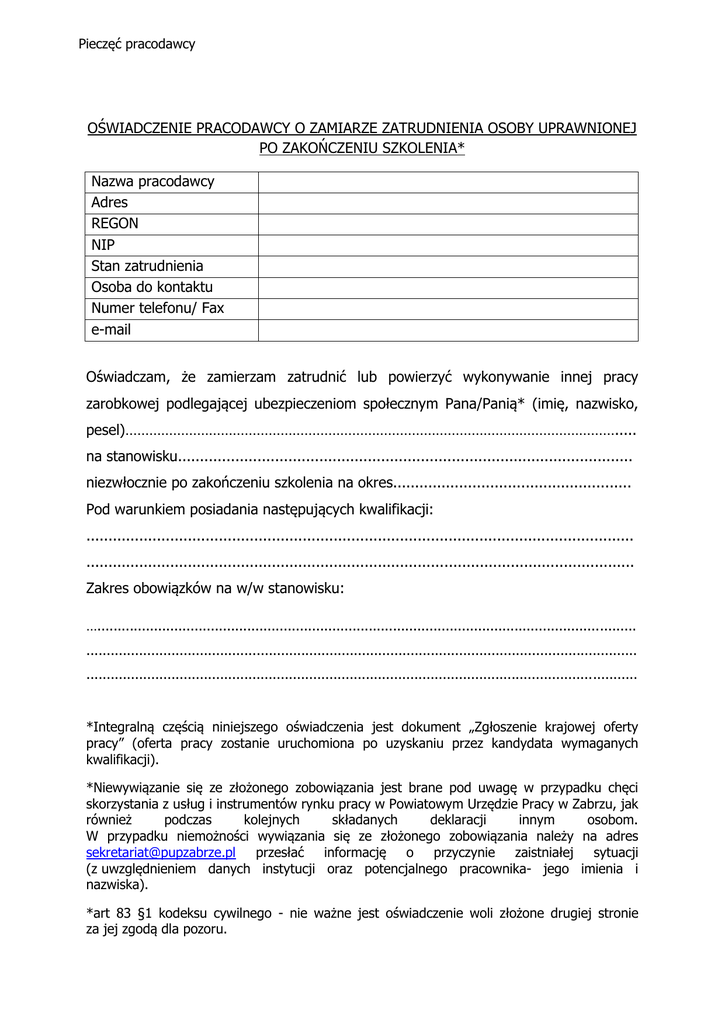 Pieczęć pracodawcy OŚWIADCZENIE PRACODAWCY O ZAMIARZE ZATRUDNIENIA OSOBY UPRAWNIONEJ PO ZAKOŃCZENIU SZKOLENIA* Nazwa pracodawcy Adres REGON NIP Stan zatrudnienia Osoba do kontaktu Numer telefonu/ Fax e-mail Oświadczam, że zamierzam zatrudnić lub powierzyć wykonywanie innej pracy zarobkowej podlegającej ubezpieczeniom społecznym Pana/Panią* (imię, nazwisko, pesel)……………………………………………………………………………………………………………..... na stanowisku....................................................................................................... niezwłocznie po zakończeniu szkolenia na okres...................................................... Pod warunkiem posiadania następujących kwalifikacji: ............................................................................................................................ ............................................................................................................................ Zakres obowiązków na w/w stanowisku: …..................................................................................................................................... ........................................................................................................................................ ........................................................................................................................................ *Integralną częścią niniejszego oświadczenia jest dokument „Zgłoszenie krajowej oferty pracy” (oferta pracy zostanie uruchomiona po uzyskaniu przez kandydata wymaganych kwalifikacji). *Niewywiązanie się ze złożonego zobowiązania jest brane pod uwagę w przypadku chęci skorzystania z usług i instrumentów rynku pracy w Powiatowym Urzędzie Pracy w Zabrzu, jak również podczas kolejnych składanych deklaracji innym osobom. W przypadku niemożności wywiązania się ze złożonego zobowiązania należy na adres [email protected] przesłać informację o przyczynie zaistniałej sytuacji (z uwzględnieniem danych instytucji oraz potencjalnego pracownika- jego imienia i nazwiska). *art 83 §1 kodeksu cywilnego - nie ważne jest oświadczenie woli złożone drugiej stronie za jej zgodą dla pozoru. *Koszt nabycia uprawnień nie stanowi pomocy publicznej w rozumieniu Ustawy z dnia 30 kwietnia 2004 r. o postępowaniu w sprawach dotyczących pomocy publicznej (Dz.U.2007.59.404 j.t. ). Szkolenie stanowi odpowiedź na potrzeby rynku pracy i jest przeprowadzane w celu polepszenia sytuacji zawodowej osoby bezrobotnej/ poszukującej pracy. miejscowość, data (pieczęć oraz podpis osoby uprawnionej do reprezentowania pracodawcy)