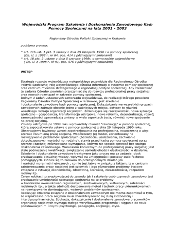 Wojewódzki Program Szkolenia i Doskonalenia Zawodowego Kadr Pomocy Społecznej na lata 2001 - 2003 Regionalny Ośrodek Polityki Społecznej w Krakowie podstawa prawna: * art. 11b ust. 1 pkt. 3 ustawy z dnia 29 listopada 1990 r o pomocy społecznej (Dz. U. z 1998 r. nr 64, poz. 414 z późniejszymi zmianami) * art. 18 pkt. 2 ustawy z dnia 5 czerwca 1998r. o samorządzie województwa ( Dz. U. z 1998 r. nr 91, poz. 576 z późniejszymi zmianami) WSTĘP Strategia rozwoju województwa małopolskiego przewiduje dla Regionalnego Ośrodka Polityki Społecznej rolę wojewódzkiego ośrodka informacji o systemie pomocy społecznej oraz centrum myślenia strategicznego o regionalnej polityce społecznej. Aby zrealizować te zadania Ośrodek powinien przyczyniać się do rozwoju profesjonalnej pracy socjalnej oraz nowych rozwiązań w zakresie pomocy społecznej. Jednym z zadań ustawowych samorządu województwa, do realizacji którego powołano Regionalny Ośrodek Polityki Społecznej w Krakowie, jest szkolenie i doskonalenie zawodowe kadr pomocy społecznej. Dokształcanie we wszystkich grupach zawodowych zajmuje obecnie jedno z ważniejszych miejsc, dotyczy to również wszelkiego rodzaju organizacji socjalnych. Zmieniająca się rzeczywistość, nowa sytuacja społeczno - gospodarcza, transformacja ustrojowa, nowe reformy, decentralizacja, rozwój samorządności wprowadzają zmiany w wielu aspektach życia, również nowe spojrzenie na pracę socjalną. Zmiany ustrojowe po 1989 roku wprowadziły również "rewolucję" w pomocy społecznej, którą zapoczątkowała ustawa o pomocy społecznej z dnia 29 listopada 1990 roku. Obserwujemy lawinowy wzrost zapotrzebowania na profesjonalną, nowoczesną a więc szeroko rozumianą pracę socjalną. Współczesny jej model, zorientowany na rozwiązywanie problemów społecznych (bezrobocie, uzależnienia, zachwianie dotychczasowych wartości np. rodziny), stawia przed kadrą pomocy społecznej coraz szersze i bardziej zróżnicowane wymagania, którym nie sposób sprostać bez stałego doskonalenia zawodowego. Warunkiem koniecznym do profesjonalnej pracy socjalnej jest stałe podnoszenie kwalifikacji, zwiększanie samodzielności i elastyczności w działaniu. Szkolenie i doskonalenie zawodowe traktowane jako proces ma za zadanie, obok przekazywania aktualnej wiedzy, wpływać na umiejętności i postawy osób fachowo pomagających. Odnosi się to zarówno do profesjonalnych działań jak i wartości moralnych i etycznych , co nie jest łatwe w związku z faktem, iż w centrum zainteresowania pracy socjalnej jest człowiek i jego różnorodne problemy życiowe związane z sytuacją ekonomiczną, zdrowotną, starością, niezaradnością, rozpadem rodziny itp. Celem edukacji przygotowującej do zawodu jak i szkolenia osób czynnych zawodowo jest przekazanie umiejętności szerszego spojrzenia na te problemy w kontekście uwarunkowań regionalnych, środowiskowych, kulturowych, zależności rodzinnych itp., a także zdolność dostosowania metod i technik pracy ukierunkowanych na rozwiązywanie dominujących, ważnych problemów społecznych. Realizując działania związane z doskonaleniem zawodowym nie można zapominać o tym, że współczesna praca socjalna musi charakteryzować się dużą złożonością i interdyscyplinarnością. Edukacja, dokształcanie i doskonalenie zawodowe pracowników organizacji socjalnych wymaga stałego weryfikowania programów i sięgania do nauk podstawowych m. innymi psychologii, pedagogiki, socjologii, etyki. Organizując szkolenia pracownicze musimy pamiętać, iż Unia Europejska akceptując wniosek Polski o przyjęcie jej w swoje struktury, narzuciła wymogi formalnoprawne. Jednym z nich jest dostosowanie wielu organizacji (również socjalnych) do standardów krajów członkowskich, tak by mogły współpracować z analogicznymi instytucjami krajów Unii. " Biała Księga" wydana przez Unię w 1995 roku proponuje wspólnocie model społeczeństwa uczącego się. Niniejszy program, jest komplementarny ze strategią rozwoju województwa małopolskiego, która w polu mieszkańcy, cel nadrzędny formułuje: "lepiej wykształceni, aktywni, przedsiębiorczy mieszkańcy" a cel strategiczny: "elastyczny, łatwo dostosowujący się do zmian społeczno - politycznych system edukacji". Przyjęte w strategii rozwiązania do w/ wym. celu nadrzędnego to między innymi "tworzenie lokalnych centrów edukacyjnych, tworzenie ośrodków podnoszenia i zmiany kwalifikacji dorosłych, propagowanie kształcenia ustawicznego". NAZWA PROGRAMU Wojewódzki program szkolenia i doskonalenia kadr pomocy społecznej na lata 2001-2003 MIEJSCE REALIZACJI: Obszar Województwa Małopolskiego ADRESACI PROGRAMU: Program adresowany jest do kadry organizacji socjalnych świadczących pomoc instytucjonalną i środowiskową oraz organizacji pozarządowych realizujących zadania z zakresu pomocy społecznej KOORDYNATOR PROGRAMU: Samorząd Województwa Małopolskiego poprzez Regionalny Ośrodek Polityki Społecznej w Krakowie, ul. Radziwiłłowska 1 PARTNERZY: - Powiatowe Centra Pomocy Rodzinie - Kadra akademicka (Uniwersytet Jagielloński, Akademia Pedagogiczna w Krakowie, Akademia Sztuk Pięknych w Krakowie, Akademia Ekonomiczna w Krakowie) - Samorządowe Kolegium Odwoławcze w Krakowie - Policealna Szkoła Pracowników Służb Społecznych - Policealna Szkoła Promocji Zdrowia Publicznego SOP - Praktycy zawodu z różnych instytucji socjalnych realizujący pomoc środowiskową i instytucjonalną - Organizacje Pozarządowe realizujące zadania z zakresu pomocy społecznej FINANSOWANIE: Zadania wynikające z programu finansowane będą z budżetu województwa, dotacji rządowej oraz z wpłat uczestników szkoleń. OPIS PROBLEMU: W Województwie Małopolskim działają 22 Powiatowe Centra Pomocy Rodzinie (w tym 3 Miejskie Ośrodki Pomocy Społecznej w powiatach grodzkich), 182 Ośrodki Pomocy Społecznej, 79 Domów Pomocy Społecznej i 71 Placówek Opie