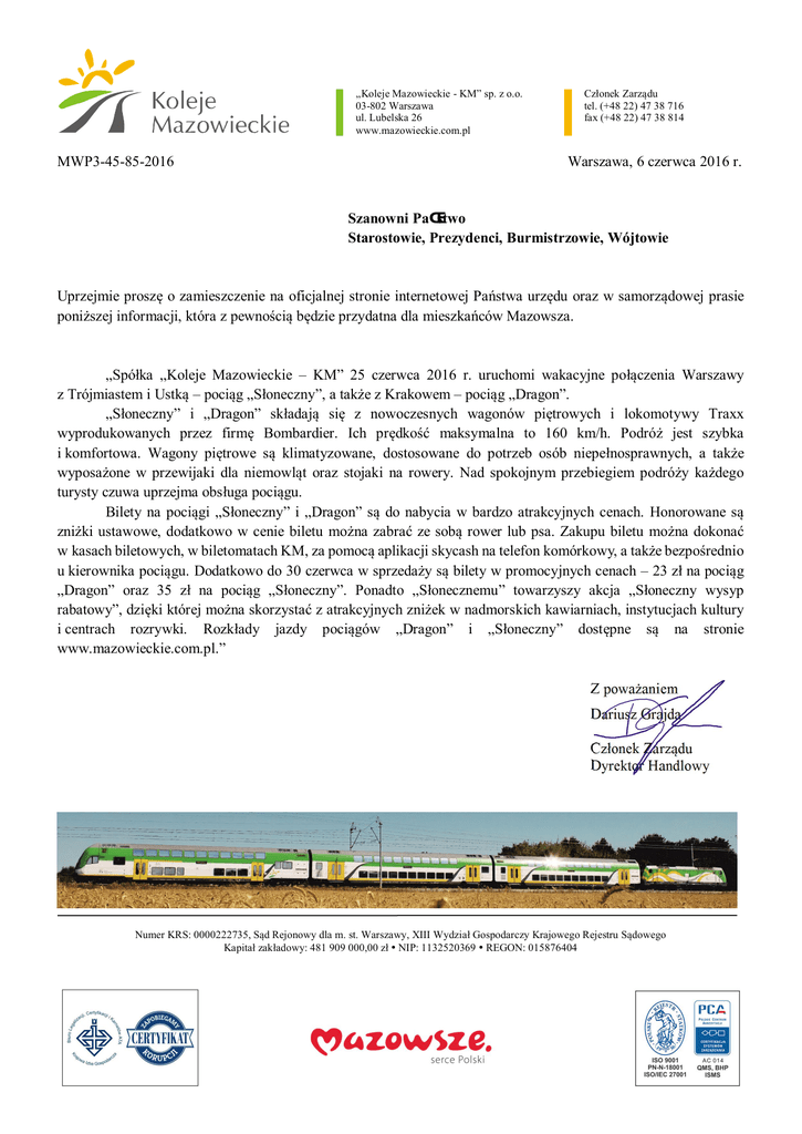 ,,Koleje Mazowieckie - KM” sp. z o.o. 03-802 Warszawa ul. Lubelska 26 www.mazowieckie.com.pl MWP3-45-85-2016 Członek Zarządu tel. (+48 22) 47 38 716 fax (+48 22) 47 38 814 Warszawa, 6 czerwca 2016 r. Szanowni Państwo Starostowie, Prezydenci, Burmistrzowie, Wójtowie Uprzejmie proszę o zamieszczenie na oficjalnej stronie internetowej Państwa urzędu oraz w samorządowej prasie poniższej informacji, która z pewnością będzie przydatna dla mieszkańców Mazowsza. „Spółka „Koleje Mazowieckie – KM” 25 czerwca 2016 r. uruchomi wakacyjne połączenia Warszawy z Trójmiastem i Ustką – pociąg „Słoneczny”, a także z Krakowem – pociąg „Dragon”. „Słoneczny” i „Dragon” składają się z nowoczesnych wagonów piętrowych i lokomotywy Traxx wyprodukowanych przez firmę Bombardier. Ich prędkość maksymalna to 160 km/h. Podróż jest szybka i komfortowa. Wagony piętrowe są klimatyzowane, dostosowane do potrzeb osób niepełnosprawnych, a także wyposażone w przewijaki dla niemowląt oraz stojaki na rowery. Nad spokojnym przebiegiem podróży każdego turysty czuwa uprzejma obsługa pociągu. Bilety na pociągi „Słoneczny” i „Dragon” są do nabycia w bardzo atrakcyjnych cenach. Honorowane są zniżki ustawowe, dodatkowo w cenie biletu można zabrać ze sobą rower lub psa. Zakupu biletu można dokonać w kasach biletowych, w biletomatach KM, za pomocą aplikacji skycash na telefon komórkowy, a także bezpośrednio u kierownika pociągu. Dodatkowo do 30 czerwca w sprzedaży są bilety w promocyjnych cenach – 23 zł na pociąg „Dragon” oraz 35 zł na pociąg „Słoneczny”. Ponadto „Słonecznemu” towarzyszy akcja „Słoneczny wysyp rabatowy”, dzięki której można skorzystać z atrakcyjnych zniżek w nadmorskich kawiarniach, instytucjach kultury i centrach rozrywki. Rozkłady jazdy pociągów „Dragon” i „Słoneczny” dostępne są na stronie www.mazowieckie.com.pl.” Z poważaniem Dariusz Grajda Członek Zarządu Dyrektor Handlowy Numer KRS: 0000222735, Sąd Rejonowy dla m. st. Warszawy, XIII Wydział Gospodarczy Krajowego Rejestru Sądowego Kapitał zakładowy: 481 909 000,00 zł Ÿ NIP: 1132520369 Ÿ REGON: 015876404