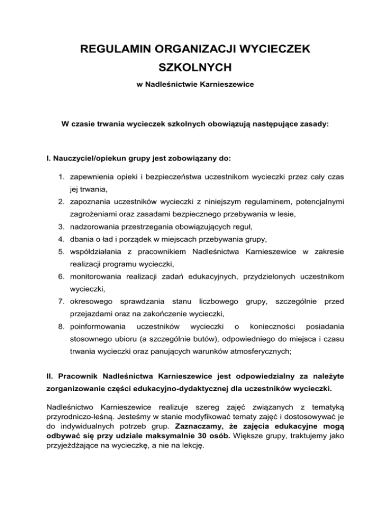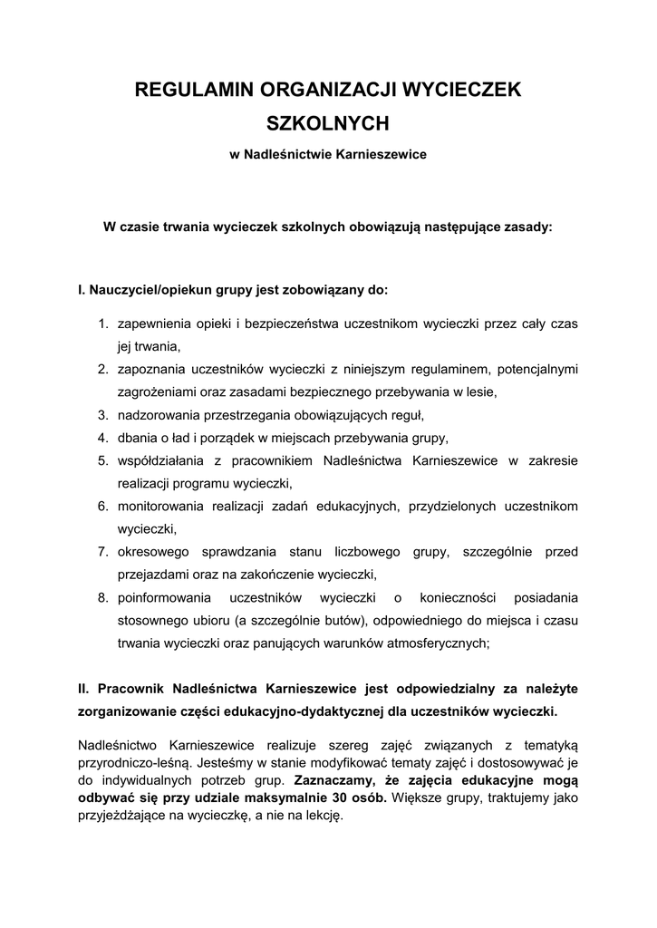 REGULAMIN ORGANIZACJI WYCIECZEK SZKOLNYCH w Nadleśnictwie Karnieszewice W czasie trwania wycieczek szkolnych obowiązują następujące zasady: I. Nauczyciel/opiekun grupy jest zobowiązany do: 1. zapewnienia opieki i bezpieczeństwa uczestnikom wycieczki przez cały czas jej trwania, 2. zapoznania uczestników wycieczki z niniejszym regulaminem, potencjalnymi zagrożeniami oraz zasadami bezpiecznego przebywania w lesie, 3. nadzorowania przestrzegania obowiązujących reguł, 4. dbania o ład i porządek w miejscach przebywania grupy, 5. współdziałania z pracownikiem Nadleśnictwa Karnieszewice w zakresie realizacji programu wycieczki, 6. monitorowania realizacji zadań edukacyjnych, przydzielonych uczestnikom wycieczki, 7. okresowego sprawdzania stanu liczbowego grupy, szczególnie przed przejazdami oraz na zakończenie wycieczki, 8. poinformowania uczestników wycieczki o konieczności posiadania stosownego ubioru (a szczególnie butów), odpowiedniego do miejsca i czasu trwania wycieczki oraz panujących warunków atmosferycznych; II. Pracownik Nadleśnictwa Karnieszewice jest odpowiedzialny za należyte zorganizowanie części edukacyjno-dydaktycznej dla uczestników wycieczki. Nadleśnictwo Karnieszewice realizuje szereg zajęć związanych z tematyką przyrodniczo-leśną. Jesteśmy w stanie modyfikować tematy zajęć i dostosowywać je do indywidualnych potrzeb grup. Zaznaczamy, że zajęcia edukacyjne mogą odbywać się przy udziale maksymalnie 30 osób. Większe grupy, traktujemy jako przyjeżdżające na wycieczkę, a nie na lekcję. Informujemy, że istnieje możliwość organizacji ogniska w Arboretum lub przy wiacie edukacyjnej w miejscowości Przytok. Organizacja posiłku podczas ogniska nie należy do Nadleśnictwa. Miejsca w których odbywają się zajęcia: - Centrum Edukacji Ekologicznej przy siedzibie Nadleśnictwa, - Arboretum Karnieszewice, - ścieżka edukacyjna „Góra Chełmska”, - ścieżka edukacyjna „Leśna Przygoda”, - ścieżka do paśnika w leśnictwie Sianów, - wiata edukacyjna w miejscowości Przytok, - rezerwat „Sieciemińskie Rosiczki”, - ścieżka w kompleksie leśnym Iwięcino; Przykładowe tematy i formy zajęć: 1. PODCHODY LEŚNE Spotkanie zaczyna się od krótkiego przedstawienia dzieciom zagadnień z dziedziny ochrony przyrody, biologii zwierząt i roślin, funkcjonowania ekosystemu leśnego itp. Później dzieci dzielą się na dwie grupy, uciekającą i szukającą. Rolą grupy „uciekającej” jest wytyczenie trasy, stworzenie drogowskazów dla grupy „szukającej” oraz wymyślenie, z pomocą prowadzącego, zagadek i zadań związanych tematycznie z przyrodą. Dzieci w trakcie zajęć uczą się orientacji w terenie leśnym, poznają niektóre prace wykonywane przez leśnika, zwyczaje zwierząt leśnych, podstawowe gatunki drzew i roślin runa leśnego oraz rolę, jaką pełni ekosystem leśny w przyrodzie. Miejscem odbywania zajęć może być Centrum Edukacji Ekologicznej i teren leśny wokół Nadleśnictwa lub mała pętla ścieżki edukacyjnej na Górze Chełmskiej. Zajęcia przeznaczone są dla dzieci ze szkół podstawowych i gimnazjalnych. 2. ŁAŃCUCH POKARMOWY CZYLI OD PRODUCENTÓW DO REDUCENTÓW Lekcja porusza tematykę zależności troficznych występujących między organizmami zamieszkującymi polskie lasy. Zajęcia rozpoczynają się od przedstawienia przez prowadzącego krótkiego wprowadzenia z zakresu ekologii, przedstawiającego w przystępny sposób pojęcia producent, konsument, reducent, sieć troficzna oraz omówienia zależności dodatnich, ujemnych i neutralnych między organizmami. Kolejnym etapem zajęć jest spacer, w trakcie którego dzieci zbierają do specjalnych pudełek różne elementy ekosystemu leśnego. Następnie po powrocie do sali z zebranych rzeczy tworzą sieć zależności. W trakcie zajęć dzieci poznają zależności występujące pomiędzy organizmami żyjącymi w lasach oraz uczą się podstawowych pojęć ekologicznych związanych z zależnościami troficznymi. Zajęcia odbywają się w Centrum Edukacji Ekologicznej oraz na terenie leśnym przyległym do nadleśnictwa. Zajęcia przeznaczone są dla dzieci ze szkół podstawowych i gimnazjalnych. 3. DBAJMY O LASY (PROBLEM ZAŚMIECANIA LASÓW) Zajęcia odbywają się na ścieżce edukacyjnej „Leśna Przygoda”. Podczas spaceru dzieci poznają leśnika jako gospodarza lasu, służbę leśną i jej rolę w lesie oraz zasady prawidłowego zachowania się w lesie. Leśnik przedstawia las jako miejsce życia wielu istot, dla których śmieci i hałas mogą stanowić zagrożenie. Omawiane jest prawidłowe i nieprawidłowe zachowanie w lesie, pokazywane miejsca przeznaczone do odpoczynku, zabawy, spacerów i biwakowania. W trakcie zajęć dzieci poznają prawidłowe zachowanie w lesie i są uczulane na problem zaśmiecania lasu. Ponadto poznają rolę leśników i strażników leśnych jako gospodarzy i opiekunów lasu. Zajęcia odbywają się na ścieżce edukacyjnej „Leśna Przygoda”. Zajęcia przeznaczone są dla dzieci przedszkolnych oraz ze szkół podstawowych. 4. ZWIERZĘTA NASZYCH LASÓW (ODGŁOSY, TROPY) Zajęcia zaczynają się prezentacją, podczas której leśnik opowiada dzieciom o zwierzętach leśnych, które żyją w lasach i na polach. Przedstawia cechy, po których można rozpoznać gatunki i płeć oraz prezentuje odgłosy jakie wydają zwierzęta. Dzieci dowiadują się, jakie ptaki można spotkać w lesie i co to są ptaki drapieżne oraz jak je rozpoznać po sylwetce w locie i po odgłosach. Uczniowie sami tworzą tropy leśnych ssaków i uczą się je rozpoznawać oraz łączyć trop z odgłosami, które mogą usłyszeć w lesie. Przy sprzyjającej pogodzie leśnik prowadzi dzieci na spacer po lesie w poszukiwaniu śladów i tropów zwierząt. Dzieci podczas zajęć uczą się rozróżniać leśne ssaki i ptaki, poznają tropy i odgłosy zwierząt oraz uczą się zachowywać w lesie tak, aby nie spłosz