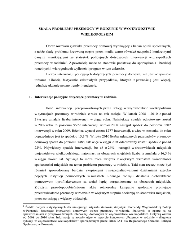 SKALA PROBLEMU PRZEMOCY W RODZINIE W WOJEWÓDZTWIE WIELKOPOLSKIM Obraz rozmiaru zjawiska przemocy domowej wynikający z badań opinii społecznych, a także skalę problemu kreowaną często przez media warto również uzupełnić konkretnymi danymi wynikającymi ze statystyk policyjnych dotyczących interwencji w przypadkach przemocy w rodzinie1. Z pewnością może to stanowić podstawę do sporządzania bardziej rzetelnych i wiarygodnych wyliczeń i prognoz w tym zakresie. Liczba interwencji policyjnych dotyczących przemocy domowej nie jest oczywiście tożsama z ilością faktycznie zaistniałych przypadków, których z pewnością jest więcej, jednakże ukazuje pewne trendy i tendencje. 1. Interwencje policyjne dotyczące przemocy w rodzinie. Ilość interwencji przeprowadzanych przez Policję w województwie wielkopolskim w sytuacjach przemocy w rodzinie z roku na rok maleje. W latach 2008 – 2010 o ponad 2 tysiące zmalała liczba interwencji w ciągu roku. Największy spadek odnotowany został w 2009 roku. Z poziomu 9579 interwencji w roku 2008 nastąpił spadek do poziomu 8302 interwencji w roku 2009. Różnica wynosi zatem 1277 interwencji, a więc w stosunku do roku poprzedniego jest to spadek o 13,3 %. W roku 2010 liczba zgłaszanych przypadków przemocy domowej spadła do poziomu 7488, tak więc w ciągu 2 lat odnotowany został spadek o ponad 22%. Największy spadek interwencji, bo aż o 26% nastąpił w środowiskach miejskich województwa wielkopolskiego, natomiast na obszarach wiejskich liczba ta zmalała o 16,5 % w ciągu dwóch lat. Sytuacja ta może mieć związek z większym wzrostem świadomości społeczności miejskich na temat problemu przemocy w rodzinie. Taki stan rzeczy może być również spowodowany bardziej skupionymi i wyspecjalizowanymi działaniami szeroko pojętych instytucji pomocowych w miastach. Różnego rodzaju działania o charakterze pomocowym i profilaktycznym są wciąż lepiej zorganizowane na obszarach miejskich. Z dużym prawdopodobieństwem także różnorodne kampanie społeczne promujące przeciwdziałanie przemocy w rodzinie w większym stopniu docierają do środowisk miejskich, przez co osiągają większy oddźwięk. 1 Źródło danych statystycznych dla niniejszego artykułu stanowią statystyki Komendy Wojewódzkiej Policji w Poznaniu dotyczące interwencji domowych wobec przemocy w rodzinie. Statystyki te oparte są na sprawozdaniach z przeprowadzonych interwencji domowych w województwie wielkopolskim. Dotyczą okresu od 2008 do 2010 roku. Informacje te zostały ujęte w raporcie końcowym „Przemoc w rodzinie – diagnoza sytuacji w województwie wielkopolskim” sporządzonym przez BIOSTAT dla Regionalnego Ośrodka Polityki Społecznej w Poznaniu. 2. Ilość osób doznających przemocy. Proporcjonalnie do liczby interwencji policyjnych dotyczących przemocy domowej spadła również liczba ofiar przemocy w rodzinie w województwie wielkopolskim. Jak wynika z rejestrów policyjnych ze sporządzonych podczas interwencji „Niebieskich Kart” – na przestrzeni lat 2008 – 2010 liczba ta spadła o 2420, a więc o 17%. Większość ofiar przemocy w rodzinie stanowiły kobiety. Odsetek ten wahał się na poziomie 62 – 66%. Odsetek mężczyzn wśród ofiar przemocy domowej oscylował w granicach 13,6 – 15,1%. Pozostałą część ofiar przemocy stanowiły przeważnie dzieci. Ze względu na bezradność i najczęściej całkowitą zależność ofiary od sprawcy, przemoc wobec dzieci do 13 roku życia i nieletnich w wieku od 13 do 18 lat prawdopodobnie może być znacznie rzadziej zgłaszana niż ma to miejsce w przypadku osób dorosłych. Udział ofiar przemocy w rodzinie w stosunku do liczby ludności na obszarze całego województwa wielkopolskiego w latach 2008 – 2010 wyniósł 0,48%. Najmniejszy odsetek odnotowano na obszarze pomiędzy powiatem gnieźnieńskim i ostrzeszowskim – wyniósł on 0,33%. Największy odsetek odnotowano w powiatach konińskim – 0,93% oraz w powiecie czarnkowsko – trzcianeckim – 0,84%. W powiecie kolskim odnotowano spadek udziału ofiar przemocy w rodzinie w społeczności lokalnej z poziomu 0,96% do 0,46%. 3. Ilość osób stosujących przemoc. W związku ze spadkiem liczby przypadków przemocy w rodzinie w województwie wielkopolskim w okresie od 2008 – 2010 roku nastąpił również spadek liczby sprawców przemocy domowej. Nie odnotowano jednakże żadnego wyraźnego trendu w zmianie stosunku kobiet i mężczyzn do ogólnej liczby sprawców przemocy. W roku 2008 liczba sprawców przemocy domowej wyniosła wśród płci męskiej 8655, natomiast wśród kobiet odnotowano 529 przypadków. W roku 2010 wśród sprawców przemocy w rodzinie było 6836 mężczyzn i 324 kobiety. Również odsetek nieletnich sprawców przemocy nie wykazuje wyraźnych tendencji zmiennych. Najczęściej osoby stosujące przemoc w rodzinie były nietrzeźwe. Ponad 60% sprawców przemocy domowej w Wielkopolsce znajdowało się w momencie interwencji Policji pod wpływem alkoholu. 4. Działania podejmowane wobec osób stosujących przemoc. Jak wynika ze statystyk policyjnych w okresie od 2008 do 2010 roku , pomimo spadku ogólnej liczby interwencji w sytuacjach przemocy domowej, o niemal jedną trzecią wzrósł odsetek zatrzymanych sprawców przemocy w rodzinie na terenie województwa wielkopolskiego. Biorąc pod uwagę spadek liczby interwencji, okazuje się, że odsetek zatrzymanych sprawców w okresie od 2008 do 2010 roku wzrósł z 25 do niemal 42%. Nieznacznie wzrósł również odsetek sprawców przemocy, którzy zostali przewiezieni do policyjnych pomieszczeń dla osób zatrzymanych. Fakty te świadczyć mogą o bardziej konsekwentnych i surowych działaniach przeprowadzanych przez funkcjonariuszy prewencji wobec osób stosujących przemoc. Średnio 14,7 % interwencji policyjnych dotyczących przemocy w rodzinie na terenie województwa wielkopolskiego w 2010 roku kończyło się wszczęciem postępowani