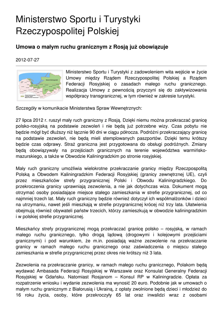 Ministerstwo Sportu i Turystyki Rzeczypospolitej Polskiej Umowa o małym ruchu granicznym z Rosją już obowiązuje 2012-07-27 Ministerstwo Sportu i Turystyki z zadowoleniem wita wejście w życie Umowy między Rządem Rzeczypospolitej Polskiej a Rządem Federacji Rosyjskiej o zasadach małego ruchu granicznego. Realizacja Umowy z pewnością przyczyni się do zaktywizowania współpracy transgranicznej, w tym również w zakresie turystyki. Szczegóły w komunikacie Ministerstwa Spraw Wewnętrznych: 27 lipca 2012 r. ruszył mały ruch graniczny z Rosją. Dzięki niemu można przekraczać granicę polsko-rosyjską na podstawie zezwoleń i nie będą już potrzebne wizy. Czas pobytu nie będzie mógł być dłuższy niż łącznie 90 dni w ciągu półrocza. Podróżni przekraczający granicę na podstawie zezwoleń, nie będą mieli stemplowanych paszportów. Dzięki temu krótszy będzie czas odprawy. Straż graniczna jest przygotowana do obsługi podróżnych. Zmiany będą obowiązywały na przejściach granicznych na terenie województwa warmińskomazurskiego, a także w Obwodzie Kaliningradzkim po stronie rosyjskiej. Mały ruch graniczny umożliwia wielokrotne przekraczanie granicy między Rzeczpospolitą Polską a Obwodem Kaliningradzkim Federacji Rosyjskiej (granicy zewnętrznej UE), czyli przez mieszkańców strefy przygranicznej Polski i Obwodu Kaliningradzkiego. Do przekroczenia granicy uprawniają zezwolenia, a nie jak dotychczas wiza. Dokument mogą otrzymać osoby posiadające miejsce stałego zamieszkania w strefie przygranicznej, od co najmniej trzech lat. Mały ruch graniczny będzie również dotyczył ich współmałżonków i dzieci na utrzymaniu, nawet jeśli mieszkają w strefie przygranicznej krócej niż trzy lata. Ułatwienia obejmują również obywateli państw trzecich, którzy zamieszkują w obwodzie kaliningradzkim i w polskiej strefie przygranicznej. Mieszkańcy strefy przygranicznej mogą przekraczać granicę polsko – rosyjską, w ramach małego ruchu granicznego, tylko drogą lądową (drogowymi i kolejowymi przejściami granicznymi) i pod warunkiem, że m.in. posiadają ważne zezwolenie na przekraczanie granicy w ramach małego ruchu granicznego oraz zaświadczenia o miejscu stałego zamieszkania w strefie przygranicznej przez okres nie krótszy niż 3 lata. Zezwolenia na przekraczanie granicy, w ramach małego ruchu granicznego, Polakom będą wydawać Ambasada Federacji Rosyjskiej w Warszawie oraz Konsulat Generalny Federacji Rosyjskiej w Gdańsku. Natomiast Rosjanom – Konsul RP w Kaliningradzie. Opłata za rozpatrzenie wniosku i wydanie zezwolenia ma wynosić 20 euro. Podobnie jak w umowach o małym ruchu granicznym z Białorusią i Ukrainą, z opłaty zwolnione będą dzieci i młodzież do 16 roku życia, osoby, które przekroczyły 65 lat oraz inwalidzi wraz z osobami towarzyszącymi. Za pierwszym razem zezwolenie będzie wydawane na dwa lata, natomiast każde kolejne na pięć lat. Osoba, która przekroczy granicę na podstawie zezwolenia uprawniającego do małego ruchu granicznego będzie mogła przebywać w wyznaczonych strefach przygranicznych jednorazowo do 30 dni licząc od wjazdu, jednakże łączny czas pobytu nie może przekraczać 90 dni w okresie każdych 6-miesiecy, liczonych od pierwszego wjazdu. Zezwolenia nie otrzymają mieszkańcy rosyjskiej strefy przygranicznej, którzy m.in. w Systemie Informacyjnym Schengen posiadają wpis o odmowie wjazdu. Strefę przygraniczną, w której obowiązują zasady małego ruchu granicznego, stanowią w województwie pomorskim miasta: Gdańsk, Gdynia i Sopot oraz powiaty: gdański, nowodworski, malborski i pucki. Strefa przygraniczna po stronie polskiej znajduje się także na obszarze województwa warmińsko-mazurskiego w miastach: Elbląg, Olsztyn, oraz powiatach: elbląskim, braniewskim, lidzbarskim, bartoszyckim, olsztyńskim, kętrzyńskim, mrągowskim, węgorzewskim, giżyckim, gołdapskim, oleckim. Po stronie rosyjskiej mały ruch graniczny obowiązuje w Obwodzie Kaliningradzkim. Przekraczanie granicy polsko-rosyjskiej w ramach małego ruchu granicznego odbywa się w przejściach granicznych: Bezledy – Bagrationowsk (drogowe); Gołdap – Gusiew (drogowe); Grzechotki – Mamonowo II (drogowe); Gronowo -Mamonowo (drogowe); Braniewo – Mamonowo (kolejowe). Wyjazd poza strefę przygraniczną jest możliwy jedynie wówczas, gdy osoba, posiada jednocześnie zezwolenie i ważną polską wizę (lub wizę innego państwa strefy Schengen). Przekroczenie okresu pobytu dozwolonego w ramach małego ruchu granicznego lub wyjazd poza strefę przygraniczną jest naruszeniem prawa. Grożą za to następujące sankcje: · decyzja o zobowiązaniu cudzoziemca do opuszczenia terytorium RP (wpis do wykazu cudzoziemców, których pobyt na terytorium RP jest niepożądany, na okres od 6 miesięcy do 1 roku), · decyzja o wydaleniu cudzoziemca z terytorium RP (wpis do wykazu cudzoziemców, których pobyt na terytorium RP jest niepożądany i Systemu Informacyjnego Schengen, na okres od 6 miesięcy do 3 lat), · decyzja o unieważnieniu zezwolenia na przekraczanie granicy w ramach małego ruchu granicznego, · zatrzymanie zezwolenia na przekraczanie granicy w ramach małego ruchu granicznego, · kara grzywny (od 20 do 500 zł). Straż Graniczna apeluje, aby niezwłocznie zgłaszać zagubienie, uszkodzenie lub zniszczenie dokumentu podróży czy zezwolenia w czasie pobytu w strefie przygranicznej. W takiej sytuacji Straż Graniczna RP po stronie polskiej i jednostka terytorialna organu Ministerstwa Spraw Wewnętrznych FR po stronie rosyjskiej bezpłatnie wyda zaświadczenie potwierdzające ten fakt. Strażnicy apelują również, aby zgłaszać sytuacje, kiedy nie możemy opuścić strefy przygranicznej w wymaganym terminie, ze względu na nieprzewidziane okoliczności (np. nagła choroba, wypadek). Wówczas posiadacz zezwolenia będzie mógł w tym czasie przebywać w strefie przygranicznej państwa drugiej s