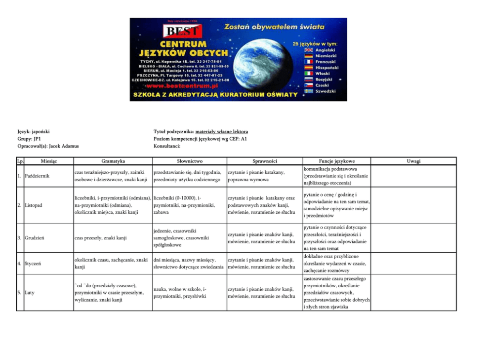 Język: japoński Grupy: JP1 Opracował(a): Jacek Adamus Lp. Miesiąc Tytuł podręcznika: materiały własne lektora Poziom kompetencji językowej wg CEF: A1 Konsultanci: Gramatyka Słownictwo 1. Październik czas teraźniejszo-przyszły, zaimki osobowe i dzierżawcze, znaki kanji przedstawianie się, dni tygodnia, przedmioty użytku codziennego 2. Listopad liczebniki, i-przymiotniki (odmiana), liczebniki (0-10000), ina-przymiotniki (odmiana), pzymiotniki, na-przymioniki, okolicznik miejsca, znaki kanji zabawa Sprawności Funcje językowe czytanie i pisanie katakany, poprawna wymowa komunikacja podstawowa (przedstawianie się i określanie najbliższego otoczenia) czytanie i pisanie katakany oraz podstawowych znaków kanji, mówienie, rozumienie ze słuchu pytanie o cenę / godzinę i odpowiadanie na ten sam temat, samodzielne opisywanie miejsc i przedmiotów czytanie i pisanie znaków kanji, mówienie, rozumienie ze słuchu pytanie o czynności dotyczące przeszłości, teraźniejszości i przyszłości oraz odpowiadanie na ten sam temat 3. Grudzień czas przeszły, znaki kanji jedzenie, czasowniki samogłoskowe, czasowniki spółgłoskowe 4. Styczeń okolicznik czasu, zachęcanie, znaki kanji dni miesiąca, nazwy miesięcy, czytanie i pisanie znaków kanji, słownictwo dotyczące zwiedzania mówienie, rozumienie ze słuchu dokładne oraz przybliżone określanie wydarzeń w czasie, zachęcanie rozmówcy 5. Luty ~od ~do (przedziały czasowe), przymiotniki w czasie przeszłym, wyliczanie, znaki kanji nauka, wolne w szkole, iprzymiotniki, przysłówki zastosowanie czasu przeszłego przymiotników, określanie przedziałów czasowych, przeciwstawianie sobie dobrych i złych stron zjawiska czytanie i pisanie znaków kanji, mówienie, rozumienie ze słuchu Uwagi 6. Marzec klasyfikatory, odmiana czasownika 'być', określanie położenia, 'tylko', znaki kanji zakupy, zwierzęta, przysłówki odprzymiotnikowe czytanie i pisanie znaków kanji, mówienie, rozumienie ze słuchu liczenie przedmiotów zgodnie z japońskim systemem, określanie dokładnego położenia przedmiotów 7. Kwiecień już' i 'jeszcze nie', łączenie przymiotników, stawać się jakimś, znaki kanji wycieczka, przyrda, zjawiska pogodowe czytanie i pisanie znaków kanji, mówienie, rozumienie ze słuchu budowa złożonych przymiotnikowo zdań, informowanie czy coś zostało już zrobione, czy jeszcze nie 8. Maj partykuły 'ni', 'de', 'to', 'ya', znaki kanji członkowe rodziny, kuchnia czytanie i pisanie znaków kanji, mówienie, rozumienie ze słuchu rozróżnianie funkcji poszczególnych partykuł w zdaniach złożonych 9. Czerwiec wyrażanie przypuszczenia, 'nie wiem uczelnia, przedmioty, czy… czy…', znaki kanji czytanie i pisanie znaków kanji, mówienie, rozumienie ze słuchu wyrażanie przypuszczenia, odpowiadanie na pytania 'czy wiesz?', odpowiadanie na pytania zaprzeczone