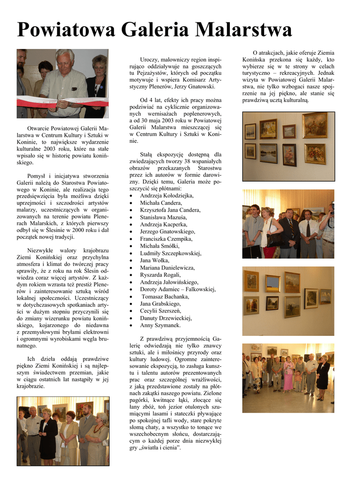 Powiatowa Galeria Malarstwa Uroczy, malowniczy region inspirująco oddziaływuje na goszczących tu Pejzażystów, których od początku motywuje i wspiera Komisarz Artystyczny Plenerów, Jerzy Gnatowski. Otwarcie Powiatowej Galerii Malarstwa w Centrum Kultury i Sztuki w Koninie, to największe wydarzenie kulturalne 2003 roku, które na stałe wpisało się w historię powiatu konińskiego. Pomysł i inicjatywa stworzenia Galerii należą do Starostwa Powiatowego w Koninie, ale realizacja tego przedsięwzięcia była możliwa dzięki uprzejmości i szczodrości artystów malarzy, uczestniczących w organizowanych na terenie powiatu Plenerach Malarskich, z których pierwszy odbył się w Ślesinie w 2000 roku i dał początek nowej tradycji. Niezwykłe walory krajobrazu Ziemi Konińskiej oraz przychylna atmosfera i klimat do twórczej pracy sprawiły, że z roku na rok Ślesin odwiedza coraz więcej artystów. Z każdym rokiem wzrasta też prestiż Plenerów i zainteresowanie sztuką wśród lokalnej społeczności. Uczestniczący w dotychczasowych spotkaniach artyści w dużym stopniu przyczynili się do zmiany wizerunku powiatu konińskiego, kojarzonego do niedawna z przemysłowymi bryłami elektrowni i ogromnymi wyrobiskami węgla brunatnego. Ich dzieła oddają prawdziwe piękno Ziemi Konińskiej i są najlepszym świadectwem przemian, jakie w ciągu ostatnich lat nastąpiły w jej krajobrazie. Od 4 lat, efekty ich pracy można podziwiać na cyklicznie organizowanych wernisażach poplenerowych, a od 30 maja 2003 roku w Powiatowej Galerii Malarstwa mieszczącej się w Centrum Kultury i Sztuki w Koninie. Stałą ekspozycję dostępną dla zwiedzających tworzy 38 wspaniałych obrazów przekazanych Starostwu przez ich autorów w formie darowizny. Dzięki temu, Galeria może poszczycić się płótnami: • Andrzeja Kołodziejka, • Michała Candera, • Krzysztofa Jana Candera, • Stanisława Mazuśa, • Andrzeja Kacperka, • Jerzego Gnatowskiego, • Franciszka Czempika, • Michała Smółki, • Ludmiły Szczepkowskiej, • Jana Wołka, • Mariana Danielewicza, • Ryszarda Rogali, • Andrzeja Jałowińskiego, • Doroty Adamiec – Falkowskiej, • Tomasaz Bachanka, • Jana Grabskiego, • Cecylii Szerszeń, • Danuty Drzewieckiej, • Anny Szymanek. Z prawdziwą przyjemnością Galerię odwiedzają nie tylko znawcy sztuki, ale i miłośnicy przyrody oraz kultury ludowej. Ogromne zainteresowanie ekspozycją, to zasługa kunsztu i talentu autorów prezentowanych prac oraz szczególnej wrażliwości, z jaką przedstawione zostały na płótnach zakątki naszego powiatu. Zielone pagórki, kwitnące łąki, złocące się łany zbóż, toń jezior otulonych szumiącymi lasami i stateczki pływające po spokojnej tafli wody, stare pokryte słomą chaty, a wszystko to tonące we wszechobecnym słońcu, dostarczającym o każdej porze dnia niezwykłej gry „światła i cienia”. O atrakcjach, jakie oferuje Ziemia Konińska przekona się każdy, kto wybierze się w te strony w celach turystyczno – rekreacyjnych. Jednak wizyta w Powiatowej Galerii Malarstwa, nie tylko wzbogaci nasze spojrzenie na jej piękno, ale stanie się prawdziwą ucztą kulturalną.
