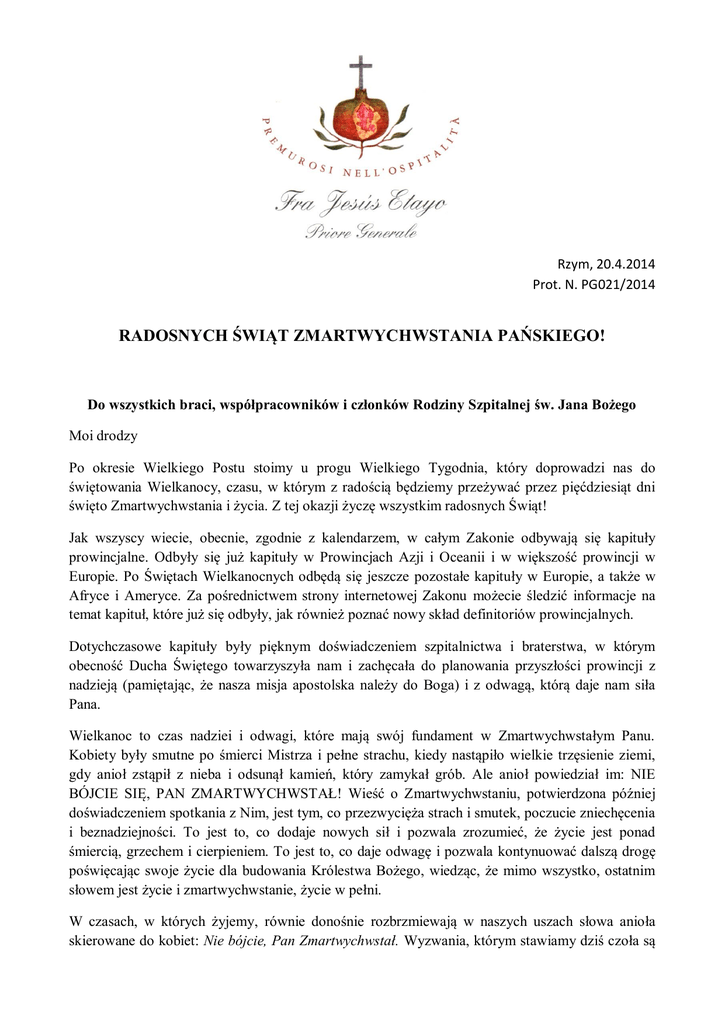 Rzym, 20.4.2014 Prot. N. PG021/2014 RADOSNYCH ŚWIĄT ZMARTWYCHWSTANIA PAŃSKIEGO! Do wszystkich braci, współpracowników i członków Rodziny Szpitalnej św. Jana Bożego Moi drodzy Po okresie Wielkiego Postu stoimy u progu Wielkiego Tygodnia, który doprowadzi nas do świętowania Wielkanocy, czasu, w którym z radością będziemy przeżywać przez pięćdziesiąt dni święto Zmartwychwstania i życia. Z tej okazji życzę wszystkim radosnych Świąt! Jak wszyscy wiecie, obecnie, zgodnie z kalendarzem, w całym Zakonie odbywają się kapituły prowincjalne. Odbyły się już kapituły w Prowincjach Azji i Oceanii i w większość prowincji w Europie. Po Świętach Wielkanocnych odbędą się jeszcze pozostałe kapituły w Europie, a także w Afryce i Ameryce. Za pośrednictwem strony internetowej Zakonu możecie śledzić informacje na temat kapituł, które już się odbyły, jak również poznać nowy skład definitoriów prowincjalnych. Dotychczasowe kapituły były pięknym doświadczeniem szpitalnictwa i braterstwa, w którym obecność Ducha Świętego towarzyszyła nam i zachęcała do planowania przyszłości prowincji z nadzieją (pamiętając, że nasza misja apostolska należy do Boga) i z odwagą, którą daje nam siła Pana. Wielkanoc to czas nadziei i odwagi, które mają swój fundament w Zmartwychwstałym Panu. Kobiety były smutne po śmierci Mistrza i pełne strachu, kiedy nastąpiło wielkie trzęsienie ziemi, gdy anioł zstąpił z nieba i odsunął kamień, który zamykał grób. Ale anioł powiedział im: NIE BÓJCIE SIĘ, PAN ZMARTWYCHWSTAŁ! Wieść o Zmartwychwstaniu, potwierdzona później doświadczeniem spotkania z Nim, jest tym, co przezwycięża strach i smutek, poczucie zniechęcenia i beznadziejności. To jest to, co dodaje nowych sił i pozwala zrozumieć, że życie jest ponad śmiercią, grzechem i cierpieniem. To jest to, co daje odwagę i pozwala kontynuować dalszą drogę poświęcając swoje życie dla budowania Królestwa Bożego, wiedząc, że mimo wszystko, ostatnim słowem jest życie i zmartwychwstanie, życie w pełni. W czasach, w których żyjemy, równie donośnie rozbrzmiewają w naszych uszach słowa anioła skierowane do kobiet: Nie bójcie, Pan Zmartwychwstał. Wyzwania, którym stawiamy dziś czoła są trudne, a w niektórych przypadkach nawet przytłaczające, ale Wielkanoc, Zmartwychwstanie Pańskie zachęca nas do otwarcia naszych serc i spojrzenia oczami wiary, aby pozbyć się poczucia strachu i zniechęcenia, odnaleźć nadzieję i wzmocnić odwagę, aby móc kontynuować naszą misję bycia troskliwymi szpitalnikami, która jest widzialnym znakiem Zmartwychwstania. Według Ewangelii św. Mateusza - którą będziemy czytać w Wigilię Paschalną – kobiety nie tylko otrzymały wiadomość od anioła, ale później doświadczyły spotkania ze Zmartwychwstałym i to właśnie wtedy, Pan posyła je, aby powiedziały uczniom, że się z nimi spotka i zobaczą go w Galilei. To właśnie w Galilei Jezus powiedział uczniom, aby go naśladowali. Wtedy i teraz, w tym samym miejscu, spotyka się z nimi Zmartwychwstały i to właśnie z tego miejsca, odnowieni przez siłę Ducha Świętego, dzięki nadziei i odwadze Zmartwychwstałego, uczniowie rozpoczynają nową misję szerzenia dobrej nowiny o Ewangelii na całym świecie. Nie będzie to triumfalna droga, będą musieli nauczyć się być Jego świadkami w codziennej rzeczywistości realnego świata, z jego ubóstwem, bogactwem, nędzą i sprzecznościami. Ale nic nie będzie w stanie ich powstrzymać, ponieważ Duch Zmartwychwstałego Pana będzie zawsze z nimi. Podobny przykład takiego doświadczenia możemy zobaczyć w nawróceniu św. Jana Bożego, naszego Założyciela, o którym pisałem w tegorocznym liście z okazji jego święta. Po spotkaniu z Panem i rozpoznaniu swojego powołania, został wezwany z powrotem do Grenady, ponieważ tam go oczekiwał Pan i tam się z nim spotkał. I tak się stało, że każdego dnia do końca swojego życia Jan Boży, utożsamiając się w pełni z Chrystusem ubogim, spotykał Zmartwychwstałego Pana w ubogich, chorych i potrzebujących, stając się jednym z nich. W tym doświadczeniu spotkania odkrywał każdego dnia Zbawiciela i poświęcił się bezgranicznie Jego Królestwu. Czynił to zawsze z entuzjazmem i z wielką odwagą. Grenada była dla św. Jana Bożego jego Galileą, do której Pan go powołał. My również jesteśmy wzywani, aby powrócić do Galilei, która jest konkretnym miejscem, w którym każdy z nas jest powołany do spotkania ze Zmartwychwstałym Panem i zaangażowania się w misję szpitalnictwa z tą samą siłą, entuzjazmem i odwagą, z jaką uczynił to św. Jan Boży. To stanie się możliwe, jeśli postaramy się każdego dnia żyć zanurzeni w Zmartwychwstaniu Jezusa, dążąc do przezwyciężenia strachu, smutku i wszystkiego, co nas paraliżuje. W naszej konkretnej Galilei oczekuje na nas Zbawiciel, aby napełnić nas życiem, aby zachęcić nas do tego by wskrzesić w nas wszystko to, co być może umarło, byśmy przezwyciężyli mroczne i bolesne doświadczenia z przeszłości, aby posłać nas byśmy byli Jego świadkami praktykując szpitalnictwo wśród ubogich, chorych i potrzebujących, zachęcając także ich, aby napełniali swoje życiem Zmartwychwstaniem Jezusa. Jeszcze raz życzę Wam Wesołych Świąt Wielkiej Nocy. Przesyłam braterskie pozdrowienia w Zmartwychwstałym Panu i w św. Janie Bożym. Br. Jesús Etayo Przeor Generalny